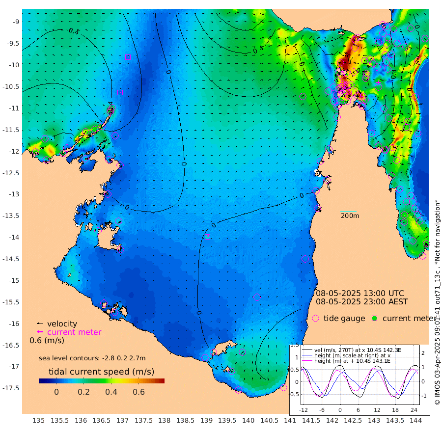 4cm/s 56T +3cm/s rms + 7cm/s -42T. ARA-GOC87 57m 15cm/s 24T +3cm/s rms + 2cm/s -2T. ARA-GOC87 60m 5cm/s 85T +2cm/s rms + 3cm/s 61T. ARA-GOC87 47m 64cm Daru 66cm Bobo Island 4cm Meer Island Barge 14cm Bramble Cay 41cm Unnamed Cay 50cm Pearce Cay 39cm Stephens Island 34cm Merrie England Shoals 57cm Mutacomal Reef 32cm Darnley Island Barge 4cm East Cay 51cm Yorke Island Barge 55cm Rennel Island 64cm Aureed Island 71cm Dungeness Reef 91cm Zagai Island 84cm Yam Island 57cm Dauan Island 59cm Saibai Island 66cm Phipi Reef 81cm Warrior Reef - West 56cm Mabuiag Island Barge 57cm Half Way Island 80cm Coconut Island 67cm Dugong Islet 82cm Poll Island 80cm Kirkcaldie Reef 106cm Suarji Island 77cm Sue Islet -3cm Hawkesbury Island 82cm Alert Patches 87cm Twin Island 20cm Badu Island 94cm St Pauls (Moa Island) 31cm Kubin (Moa Island) 68cm Ince Point 58cm Thursday Island 61cm Nardana Patches 36cm Turtle Head 27cm Round Island 7cm Goods Island -1cm Booby Island 8cm White Rocks Area 23cm Carpentaria 84cm Papou Point 22cm Bampfield Head -2cm Crab Island 1cm Red Wallis Island 17cm Packe Island 86cm Harrington Reef 5cm Herald Camp 31cm Sharp Point 32cm Red Island Point 69cm Possession Island 75cm Alpha Rock 84cm Frederick Point 67cm Wyborn Reef Light 72cm Tetley Island 11cm Triangle Reef 72cm Turtle Head Island 10cm Maclennan Cay -12cm Raine Island 41cm Mcsweeny Reef 29cm Collette Reef 2cm Shadwell Reef 29cm Hannibal Island 11cm Round Point -5cm Vrilya Point 11cm Cape Grenville 9cm Hicks Island 4cm Sir Charles Hardy Island 5cm Harvey Island -6cm Kay Reef -10cm Rocky Island -20cm Chapman Island -17cm Ham Reef -10cm Jubilee Reef -5cm Night Island -15cm Unnamed Reef No. 3 -10cm Morris Island -5cm 1st 3 Mile Opening -8cm Creech Reef -15cm Fife Island -21cm Eden Reef -14cm Stanley Island -14cm Normanby River -80cm Yabooma Island -72cm Hutchison River -70cm Elcho Island -71cm North West Crocodile Island -26cm Cape Wessel -64cm Stevens Island -13cm Guluwuru Island -70cm Hopeful Bay -37cm Auster Point -46cm Two Island Bay -68cm Cadell Strait -82cm Mallison Island -19cm Melville Bay (Gove Harbour) -15cm Truant Island -4cm Cape Arnhem 6cm Cape Grey 0cm Hawk Island 16cm Milner Bay (Groote Eylandt) 10cm Cape Beatrice 25cm West Island 32cm Centre Island -3cm Mornington Island -4cm West Wellesley Islands -21cm Bountiful Island -31cm Albert River Mouth -30cm Sweers Island -35cm Karumba -29cm Nassau River Offshore -28cm Christmas Creek -30cm Archer River -15cm Boyd Point -28cm Weipa (Humbug Point) -12cm Pennefather River -11cm Cullen Point
