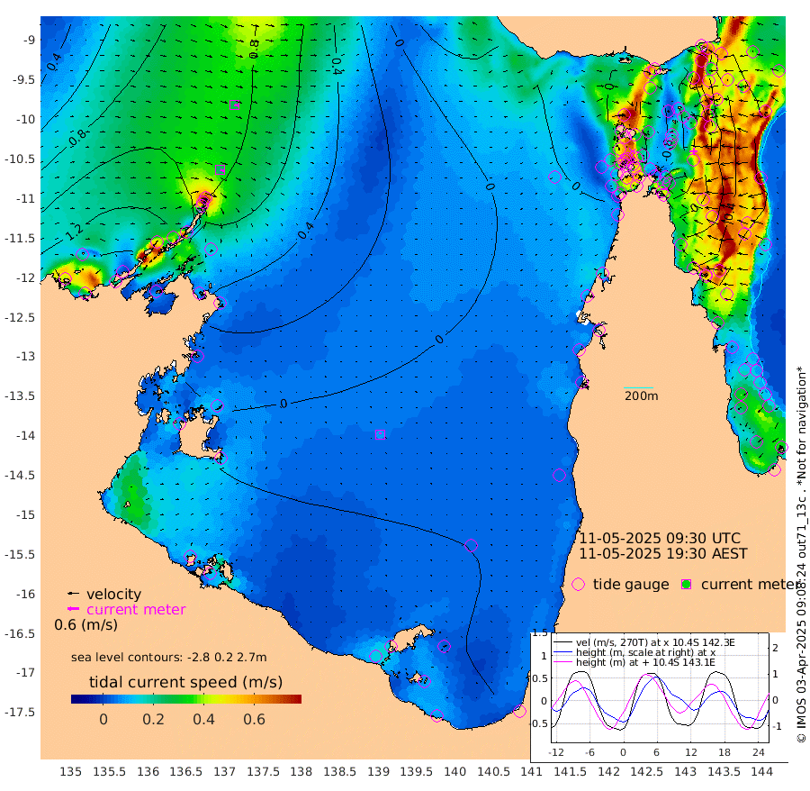 23cm/s 113T +3cm/s rms + 7cm/s -42T. ARA-GOC87 57m 8cm/s -12T +3cm/s rms + 2cm/s -2T. ARA-GOC87 60m 25cm/s 104T +2cm/s rms + 3cm/s 61T. ARA-GOC87 47m 11cm Daru 18cm Bobo Island 49cm Meer Island Barge 54cm Bramble Cay 37cm Unnamed Cay 29cm Pearce Cay 39cm Stephens Island 49cm Merrie England Shoals 18cm Mutacomal Reef 35cm Darnley Island Barge 56cm East Cay 17cm Yorke Island Barge 23cm Rennel Island 7cm Aureed Island -5cm Dungeness Reef -47cm Zagai Island -48cm Yam Island -78cm Dauan Island -78cm Saibai Island -56cm Phipi Reef -56cm Warrior Reef - West -50cm Mabuiag Island Barge 16cm Half Way Island 4cm Coconut Island 0cm Dugong Islet -25cm Poll Island -15cm Kirkcaldie Reef -51cm Suarji Island -28cm Sue Islet 11cm Hawkesbury Island -28cm Alert Patches -35cm Twin Island -2cm Badu Island -52cm St Pauls (Moa Island) -13cm Kubin (Moa Island) -34cm Ince Point -29cm Thursday Island -32cm Nardana Patches -13cm Turtle Head 6cm Round Island 9cm Goods Island 13cm Booby Island 12cm White Rocks Area -6cm Carpentaria -35cm Papou Point 33cm Bampfield Head 19cm Crab Island 3cm Red Wallis Island -7cm Packe Island 4cm Harrington Reef -1cm Herald Camp -26cm Sharp Point -3cm Red Island Point -12cm Possession Island -31cm Alpha Rock -17cm Frederick Point 16cm Wyborn Reef Light 6cm Tetley Island 32cm Triangle Reef 31cm Turtle Head Island 39cm Maclennan Cay 57cm Raine Island 32cm Mcsweeny Reef 40cm Collette Reef 48cm Shadwell Reef 48cm Hannibal Island 61cm Round Point 17cm Vrilya Point 52cm Cape Grenville 52cm Hicks Island 40cm Sir Charles Hardy Island 14cm Harvey Island 63cm Kay Reef 56cm Rocky Island 58cm Chapman Island 54cm Ham Reef 54cm Jubilee Reef 47cm Night Island 55cm Unnamed Reef No. 3 61cm Morris Island 56cm 1st 3 Mile Opening 54cm Creech Reef 59cm Fife Island 72cm Eden Reef 64cm Stanley Island 68cm Normanby River 138cm Yabooma Island 163cm Hutchison River 140cm Elcho Island 129cm North West Crocodile Island 82cm Cape Wessel 132cm Stevens Island 76cm Guluwuru Island 125cm Hopeful Bay 104cm Auster Point 97cm Two Island Bay 132cm Cadell Strait 88cm Mallison Island 74cm Melville Bay (Gove Harbour) 78cm Truant Island 44cm Cape Arnhem 27cm Cape Grey 17cm Hawk Island -11cm Milner Bay (Groote Eylandt) -19cm Cape Beatrice -59cm West Island -55cm Centre Island -46cm Mornington Island -54cm West Wellesley Islands -55cm Bountiful Island -46cm Albert River Mouth -34cm Sweers Island -39cm Karumba -41cm Nassau River Offshore -27cm Christmas Creek 8cm Archer River 0cm Boyd Point 6cm Weipa (Humbug Point) 23cm Pennefather River 1cm Cullen Point