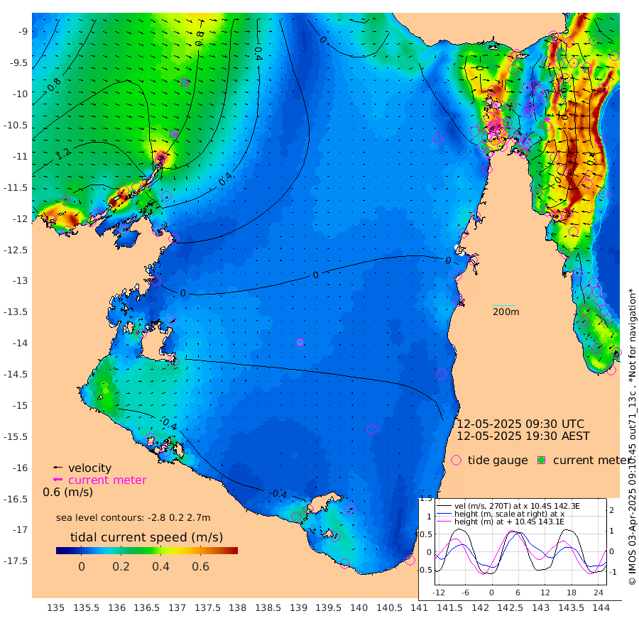 23cm/s 120T +3cm/s rms + 7cm/s -42T. ARA-GOC87 57m 10cm/s -6T +3cm/s rms + 2cm/s -2T. ARA-GOC87 60m 24cm/s 112T +2cm/s rms + 3cm/s 61T. ARA-GOC87 47m -6cm Daru -1cm Bobo Island 38cm Meer Island Barge 38cm Bramble Cay 20cm Unnamed Cay 11cm Pearce Cay 24cm Stephens Island 31cm Merrie England Shoals -1cm Mutacomal Reef 20cm Darnley Island Barge 42cm East Cay 2cm Yorke Island Barge 9cm Rennel Island -11cm Aureed Island -18cm Dungeness Reef -58cm Zagai Island -55cm Yam Island -82cm Dauan Island -87cm Saibai Island -65cm Phipi Reef -69cm Warrior Reef - West -50cm Mabuiag Island Barge 5cm Half Way Island -12cm Coconut Island -12cm Dugong Islet -35cm Poll Island -25cm Kirkcaldie Reef -59cm Suarji Island -40cm Sue Islet 31cm Hawkesbury Island -33cm Alert Patches -39cm Twin Island 10cm Badu Island -54cm St Pauls (Moa Island) 2cm Kubin (Moa Island) -31cm Ince Point -22cm Thursday Island -26cm Nardana Patches -3cm Turtle Head 23cm Round Island 28cm Goods Island 39cm Booby Island 34cm White Rocks Area 19cm Carpentaria -36cm Papou Point 60cm Bampfield Head 41cm Crab Island 26cm Red Wallis Island 9cm Packe Island -10cm Harrington Reef 26cm Herald Camp -28cm Sharp Point 2cm Red Island Point -7cm Possession Island -38cm Alpha Rock -27cm Frederick Point 0cm Wyborn Reef Light -9cm Tetley Island 20cm Triangle Reef 21cm Turtle Head Island 29cm Maclennan Cay 49cm Raine Island 16cm Mcsweeny Reef 23cm Collette Reef 36cm Shadwell Reef 30cm Hannibal Island 44cm Round Point 40cm Vrilya Point 38cm Cape Grenville 40cm Hicks Island 28cm Sir Charles Hardy Island 11cm Harvey Island 48cm Kay Reef 44cm Rocky Island 44cm Chapman Island 43cm Ham Reef 44cm Jubilee Reef 38cm Night Island 43cm Unnamed Reef No. 3 50cm Morris Island 49cm 1st 3 Mile Opening 45cm Creech Reef 46cm Fife Island 60cm Eden Reef 53cm Stanley Island 55cm Normanby River 151cm Yabooma Island 171cm Hutchison River 150cm Elcho Island 139cm North West Crocodile Island 81cm Cape Wessel 135cm Stevens Island 66cm Guluwuru Island 127cm Hopeful Bay 108cm Auster Point 106cm Two Island Bay 132cm Cadell Strait 40cm Mallison Island 66cm Melville Bay (Gove Harbour) 71cm Truant Island 37cm Cape Arnhem 19cm Cape Grey 9cm Hawk Island -16cm Milner Bay (Groote Eylandt) -25cm Cape Beatrice -64cm West Island -60cm Centre Island -64cm Mornington Island -72cm West Wellesley Islands -79cm Bountiful Island -67cm Albert River Mouth -60cm Sweers Island -61cm Karumba -56cm Nassau River Offshore -37cm Christmas Creek 7cm Archer River 6cm Boyd Point 13cm Weipa (Humbug Point) 34cm Pennefather River 21cm Cullen Point