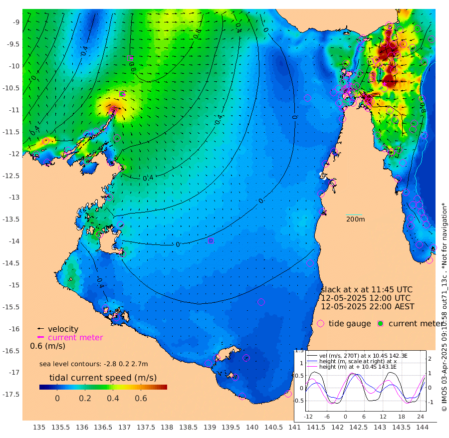 33cm/s 109T +3cm/s rms + 7cm/s -42T. ARA-GOC87 57m 4cm/s 128T +3cm/s rms + 2cm/s -2T. ARA-GOC87 60m 30cm/s 99T +2cm/s rms + 3cm/s 61T. ARA-GOC87 47m 112cm Daru 119cm Bobo Island 78cm Meer Island Barge 104cm Bramble Cay 115cm Unnamed Cay 116cm Pearce Cay 107cm Stephens Island 120cm Merrie England Shoals 117cm Mutacomal Reef 100cm Darnley Island Barge 89cm East Cay 102cm Yorke Island Barge 108cm Rennel Island 104cm Aureed Island 97cm Dungeness Reef 79cm Zagai Island 71cm Yam Island 34cm Dauan Island 37cm Saibai Island 59cm Phipi Reef 73cm Warrior Reef - West 36cm Mabuiag Island Barge 99cm Half Way Island 114cm Coconut Island 95cm Dugong Islet 88cm Poll Island 89cm Kirkcaldie Reef 75cm Suarji Island 82cm Sue Islet 39cm Hawkesbury Island 76cm Alert Patches 76cm Twin Island 44cm Badu Island 65cm St Pauls (Moa Island) 41cm Kubin (Moa Island) 55cm Ince Point 46cm Thursday Island 48cm Nardana Patches 43cm Turtle Head 50cm Round Island 32cm Goods Island 15cm Booby Island 22cm White Rocks Area -2cm Carpentaria 65cm Papou Point 52cm Bampfield Head 15cm Crab Island 13cm Red Wallis Island 37cm Packe Island 112cm Harrington Reef 25cm Herald Camp 12cm Sharp Point 44cm Red Island Point 68cm Possession Island 73cm Alpha Rock 93cm Frederick Point 122cm Wyborn Reef Light 117cm Tetley Island 76cm Triangle Reef 126cm Turtle Head Island 73cm Maclennan Cay 66cm Raine Island 105cm Mcsweeny Reef 103cm Collette Reef 80cm Shadwell Reef 114cm Hannibal Island 111cm Round Point 3cm Vrilya Point 93cm Cape Grenville 89cm Hicks Island 83cm Sir Charles Hardy Island 27cm Harvey Island 89cm Kay Reef 74cm Rocky Island 73cm Chapman Island 66cm Ham Reef 70cm Jubilee Reef 65cm Night Island 69cm Unnamed Reef No. 3 77cm Morris Island 67cm 1st 3 Mile Opening 70cm Creech Reef 72cm Fife Island 83cm Eden Reef 75cm Stanley Island 82cm Normanby River 79cm Yabooma Island 117cm Hutchison River 87cm Elcho Island 74cm North West Crocodile Island 81cm Cape Wessel 98cm Stevens Island 104cm Guluwuru Island 86cm Hopeful Bay 85cm Auster Point 74cm Two Island Bay 111cm Cadell Strait 164cm Mallison Island 89cm Melville Bay (Gove Harbour) 97cm Truant Island 63cm Cape Arnhem 34cm Cape Grey 22cm Hawk Island -24cm Milner Bay (Groote Eylandt) -34cm Cape Beatrice -80cm West Island -73cm Centre Island -58cm Mornington Island -69cm West Wellesley Islands -76cm Bountiful Island -91cm Albert River Mouth -87cm Sweers Island -82cm Karumba -47cm Nassau River Offshore -22cm Christmas Creek 2cm Archer River 3cm Boyd Point 0cm Weipa (Humbug Point) 10cm Pennefather River -3cm Cullen Point