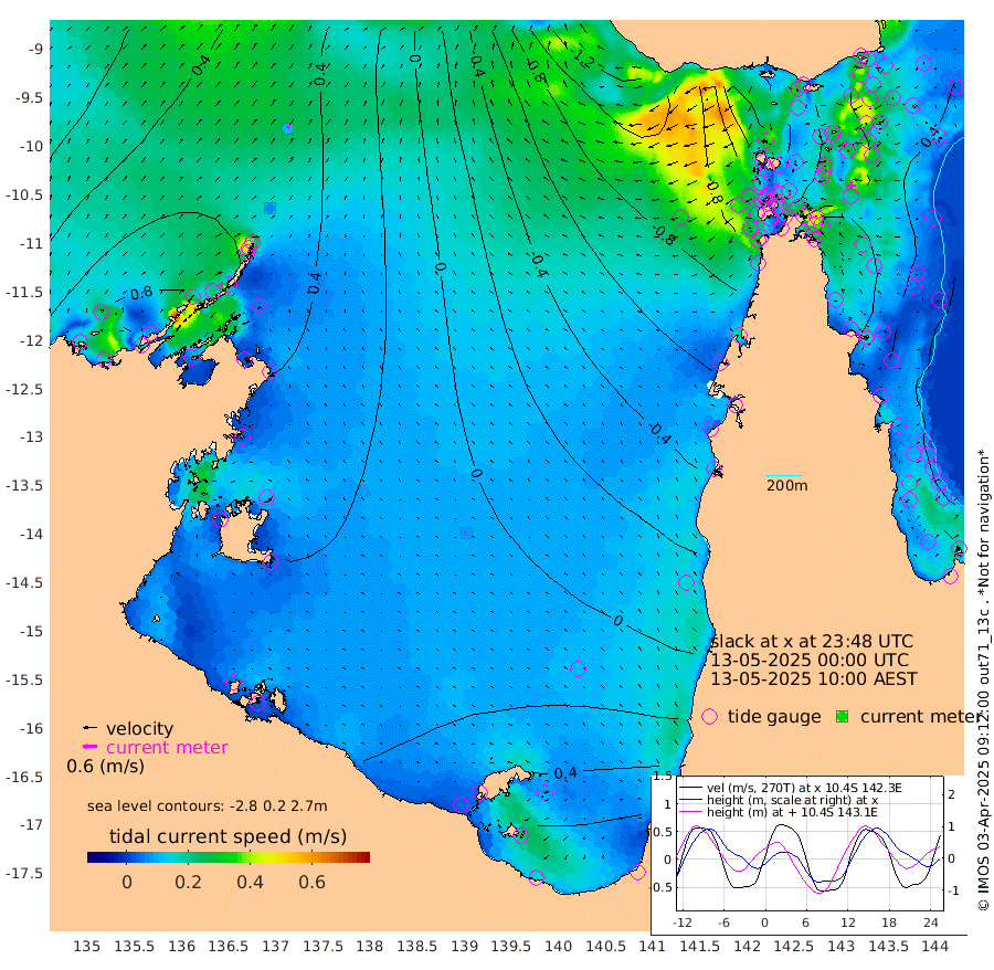 7cm/s 38T +3cm/s rms + 7cm/s -42T. ARA-GOC87 57m 9cm/s -101T +3cm/s rms + 2cm/s -2T. ARA-GOC87 60m 11cm/s 34T +2cm/s rms + 3cm/s 61T. ARA-GOC87 47m 63cm Daru 62cm Bobo Island 25cm Meer Island Barge 52cm Bramble Cay 62cm Unnamed Cay 56cm Pearce Cay 50cm Stephens Island 65cm Merrie England Shoals 72cm Mutacomal Reef 42cm Darnley Island Barge 31cm East Cay 48cm Yorke Island Barge 53cm Rennel Island 49cm Aureed Island 48cm Dungeness Reef 39cm Zagai Island 40cm Yam Island 14cm Dauan Island 14cm Saibai Island 27cm Phipi Reef 46cm Warrior Reef - West -8cm Mabuiag Island Barge 50cm Half Way Island 50cm Coconut Island 50cm Dugong Islet 42cm Poll Island 41cm Kirkcaldie Reef 24cm Suarji Island 36cm Sue Islet -64cm Hawkesbury Island 8cm Alert Patches 16cm Twin Island -45cm Badu Island 14cm St Pauls (Moa Island) -37cm Kubin (Moa Island) -7cm Ince Point -24cm Thursday Island -18cm Nardana Patches -37cm Turtle Head -55cm Round Island -66cm Goods Island -98cm Booby Island -79cm White Rocks Area -118cm Carpentaria 10cm Papou Point -115cm Bampfield Head -89cm Crab Island -85cm Red Wallis Island -47cm Packe Island 51cm Harrington Reef -85cm Herald Camp 7cm Sharp Point -34cm Red Island Point -22cm Possession Island 28cm Alpha Rock 33cm Frederick Point 62cm Wyborn Reef Light 58cm Tetley Island 24cm Triangle Reef 43cm Turtle Head Island 22cm Maclennan Cay 11cm Raine Island 49cm Mcsweeny Reef 46cm Collette Reef 26cm Shadwell Reef 55cm Hannibal Island 50cm Round Point -100cm Vrilya Point 38cm Cape Grenville 31cm Hicks Island 31cm Sir Charles Hardy Island 10cm Harvey Island 33cm Kay Reef 21cm Rocky Island 16cm Chapman Island 11cm Ham Reef 17cm Jubilee Reef 17cm Night Island 13cm Unnamed Reef No. 3 22cm Morris Island 7cm 1st 3 Mile Opening 13cm Creech Reef 21cm Fife Island 24cm Eden Reef 19cm Stanley Island 30cm Normanby River 87cm Yabooma Island 116cm Hutchison River 96cm Elcho Island 98cm North West Crocodile Island 59cm Cape Wessel 96cm Stevens Island 76cm Guluwuru Island 80cm Hopeful Bay 60cm Auster Point 63cm Two Island Bay 105cm Cadell Strait 108cm Mallison Island 69cm Melville Bay (Gove Harbour) 63cm Truant Island 44cm Cape Arnhem 39cm Cape Grey 41cm Hawk Island 31cm Milner Bay (Groote Eylandt) 36cm Cape Beatrice 23cm West Island 12cm Centre Island 58cm Mornington Island 54cm West Wellesley Islands 90cm Bountiful Island 122cm Albert River Mouth 112cm Sweers Island 107cm Karumba 47cm Nassau River Offshore 13cm Christmas Creek -30cm Archer River -51cm Boyd Point -48cm Weipa (Humbug Point) -68cm Pennefather River -86cm Cullen Point