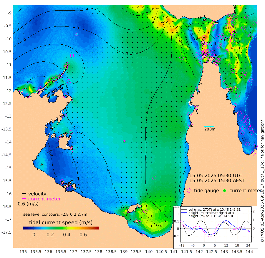 14cm/s 3T +3cm/s rms + 7cm/s -42T. ARA-GOC87 57m 22cm/s 10T +3cm/s rms + 2cm/s -2T. ARA-GOC87 60m 12cm/s 16T +2cm/s rms + 3cm/s 61T. ARA-GOC87 47m -99cm Daru -94cm Bobo Island -84cm Meer Island Barge -96cm Bramble Cay -104cm Unnamed Cay -101cm Pearce Cay -100cm Stephens Island -101cm Merrie England Shoals -98cm Mutacomal Reef -92cm Darnley Island Barge -92cm East Cay -90cm Yorke Island Barge -100cm Rennel Island -87cm Aureed Island -102cm Dungeness Reef -73cm Zagai Island -85cm Yam Island -80cm Dauan Island -58cm Saibai Island -110cm Phipi Reef -84cm Warrior Reef - West -68cm Mabuiag Island Barge -95cm Half Way Island -93cm Coconut Island -96cm Dugong Islet -86cm Poll Island -98cm Kirkcaldie Reef -87cm Suarji Island -76cm Sue Islet -132cm Hawkesbury Island -93cm Alert Patches -87cm Twin Island -119cm Badu Island -84cm St Pauls (Moa Island) -116cm Kubin (Moa Island) -90cm Ince Point -93cm Thursday Island -93cm Nardana Patches -113cm Turtle Head -126cm Round Island -126cm Goods Island -116cm Booby Island -113cm White Rocks Area -53cm Carpentaria -79cm Papou Point -138cm Bampfield Head -94cm Crab Island -103cm Red Wallis Island -119cm Packe Island -97cm Harrington Reef -142cm Herald Camp -12cm Sharp Point -102cm Red Island Point -103cm Possession Island -67cm Alpha Rock -91cm Frederick Point -95cm Wyborn Reef Light -91cm Tetley Island -75cm Triangle Reef -112cm Turtle Head Island -85cm Maclennan Cay -78cm Raine Island -92cm Mcsweeny Reef -90cm Collette Reef -81cm Shadwell Reef -98cm Hannibal Island -101cm Round Point -69cm Vrilya Point -92cm Cape Grenville -96cm Hicks Island -98cm Sir Charles Hardy Island -29cm Harvey Island -88cm Kay Reef -85cm Rocky Island -78cm Chapman Island -74cm Ham Reef -79cm Jubilee Reef -74cm Night Island -73cm Unnamed Reef No. 3 -87cm Morris Island -86cm 1st 3 Mile Opening -82cm Creech Reef -74cm Fife Island -94cm Eden Reef -86cm Stanley Island -90cm Normanby River -84cm Yabooma Island -106cm Hutchison River -73cm Elcho Island -71cm North West Crocodile Island -19cm Cape Wessel -52cm Stevens Island -31cm Guluwuru Island -52cm Hopeful Bay -40cm Auster Point -40cm Two Island Bay -69cm Cadell Strait 39cm Mallison Island -31cm Melville Bay (Gove Harbour) -29cm Truant Island -12cm Cape Arnhem 0cm Cape Grey 7cm Hawk Island 47cm Milner Bay (Groote Eylandt) 44cm Cape Beatrice 75cm West Island 73cm Centre Island 23cm Mornington Island 35cm West Wellesley Islands 0cm Bountiful Island 34cm Albert River Mouth 48cm Sweers Island 11cm Karumba -25cm Nassau River Offshore -58cm Christmas Creek -69cm Archer River -66cm Boyd Point -85cm Weipa (Humbug Point) -54cm Pennefather River -72cm Cullen Point