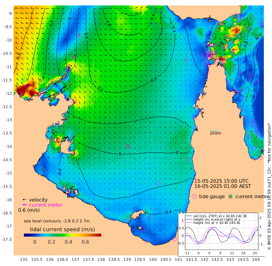 28cm/s 112T +3cm/s rms + 7cm/s -42T. ARA-GOC87 57m 24cm/s 157T +3cm/s rms + 2cm/s -2T. ARA-GOC87 60m 18cm/s 103T +2cm/s rms + 3cm/s 61T. ARA-GOC87 47m 114cm Daru 108cm Bobo Island 63cm Meer Island Barge 82cm Bramble Cay 105cm Unnamed Cay 99cm Pearce Cay 91cm Stephens Island 101cm Merrie England Shoals 116cm Mutacomal Reef 91cm Darnley Island Barge 64cm East Cay 103cm Yorke Island Barge 100cm Rennel Island 102cm Aureed Island 107cm Dungeness Reef 119cm Zagai Island 113cm Yam Island 117cm Dauan Island 116cm Saibai Island 115cm Phipi Reef 123cm Warrior Reef - West 93cm Mabuiag Island Barge 96cm Half Way Island 114cm Coconut Island 103cm Dugong Islet 110cm Poll Island 106cm Kirkcaldie Reef 110cm Suarji Island 114cm Sue Islet 77cm Hawkesbury Island 109cm Alert Patches 110cm Twin Island 83cm Badu Island 112cm St Pauls (Moa Island) 84cm Kubin (Moa Island) 97cm Ince Point 89cm Thursday Island 92cm Nardana Patches 83cm Turtle Head 85cm Round Island 67cm Goods Island 54cm Booby Island 51cm White Rocks Area 46cm Carpentaria 95cm Papou Point 87cm Bampfield Head 42cm Crab Island 54cm Red Wallis Island 79cm Packe Island 108cm Harrington Reef 79cm Herald Camp 31cm Sharp Point 64cm Red Island Point 94cm Possession Island 108cm Alpha Rock 111cm Frederick Point 122cm Wyborn Reef Light 124cm Tetley Island 70cm Triangle Reef 116cm Turtle Head Island 61cm Maclennan Cay 46cm Raine Island 95cm Mcsweeny Reef 92cm Collette Reef 69cm Shadwell Reef 97cm Hannibal Island 83cm Round Point 34cm Vrilya Point 74cm Cape Grenville 68cm Hicks Island 78cm Sir Charles Hardy Island 22cm Harvey Island 65cm Kay Reef 54cm Rocky Island 55cm Chapman Island 50cm Ham Reef 53cm Jubilee Reef 50cm Night Island 50cm Unnamed Reef No. 3 53cm Morris Island 51cm 1st 3 Mile Opening 52cm Creech Reef 48cm Fife Island 56cm Eden Reef 54cm Stanley Island 51cm Normanby River -30cm Yabooma Island -18cm Hutchison River -34cm Elcho Island -44cm North West Crocodile Island 23cm Cape Wessel 0cm Stevens Island 66cm Guluwuru Island -5cm Hopeful Bay 10cm Auster Point 6cm Two Island Bay 17cm Cadell Strait 218cm Mallison Island 46cm Melville Bay (Gove Harbour) 56cm Truant Island 40cm Cape Arnhem 5cm Cape Grey -4cm Hawk Island -48cm Milner Bay (Groote Eylandt) -57cm Cape Beatrice -88cm West Island -83cm Centre Island -72cm Mornington Island -73cm West Wellesley Islands -97cm Bountiful Island -139cm Albert River Mouth -149cm Sweers Island -131cm Karumba -40cm Nassau River Offshore 4cm Christmas Creek 22cm Archer River 37cm Boyd Point 30cm Weipa (Humbug Point) 29cm Pennefather River 39cm Cullen Point