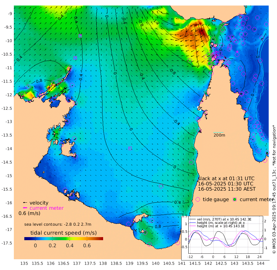 11cm/s 39T +3cm/s rms + 7cm/s -42T. ARA-GOC87 57m 14cm/s -68T +3cm/s rms + 2cm/s -2T. ARA-GOC87 60m 19cm/s 38T +2cm/s rms + 3cm/s 61T. ARA-GOC87 47m 23cm Daru 22cm Bobo Island -1cm Meer Island Barge 12cm Bramble Cay 18cm Unnamed Cay 18cm Pearce Cay 10cm Stephens Island 16cm Merrie England Shoals 20cm Mutacomal Reef 10cm Darnley Island Barge -4cm East Cay 16cm Yorke Island Barge 10cm Rennel Island 13cm Aureed Island 16cm Dungeness Reef 17cm Zagai Island 10cm Yam Island 8cm Dauan Island 5cm Saibai Island 29cm Phipi Reef 22cm Warrior Reef - West -25cm Mabuiag Island Barge 10cm Half Way Island 8cm Coconut Island 10cm Dugong Islet 7cm Poll Island 5cm Kirkcaldie Reef -4cm Suarji Island 8cm Sue Islet -95cm Hawkesbury Island -22cm Alert Patches -19cm Twin Island -71cm Badu Island -14cm St Pauls (Moa Island) -70cm Kubin (Moa Island) -38cm Ince Point -55cm Thursday Island -48cm Nardana Patches -67cm Turtle Head -84cm Round Island -98cm Goods Island -131cm Booby Island -120cm White Rocks Area -155cm Carpentaria -17cm Papou Point -154cm Bampfield Head -114cm Crab Island -127cm Red Wallis Island -92cm Packe Island 5cm Harrington Reef -119cm Herald Camp 3cm Sharp Point -57cm Red Island Point -45cm Possession Island -14cm Alpha Rock -7cm Frederick Point 12cm Wyborn Reef Light 9cm Tetley Island -6cm Triangle Reef 5cm Turtle Head Island -9cm Maclennan Cay -14cm Raine Island 9cm Mcsweeny Reef 8cm Collette Reef -3cm Shadwell Reef 13cm Hannibal Island 5cm Round Point -123cm Vrilya Point -2cm Cape Grenville -2cm Hicks Island -8cm Sir Charles Hardy Island -1cm Harvey Island -7cm Kay Reef -8cm Rocky Island -15cm Chapman Island -17cm Ham Reef -11cm Jubilee Reef -11cm Night Island -20cm Unnamed Reef No. 3 -9cm Morris Island -16cm 1st 3 Mile Opening -15cm Creech Reef -14cm Fife Island -7cm Eden Reef -13cm Stanley Island -6cm Normanby River 82cm Yabooma Island 112cm Hutchison River 93cm Elcho Island 97cm North West Crocodile Island 43cm Cape Wessel 84cm Stevens Island 69cm Guluwuru Island 72cm Hopeful Bay 55cm Auster Point 59cm Two Island Bay 108cm Cadell Strait 55cm Mallison Island 65cm Melville Bay (Gove Harbour) 55cm Truant Island 42cm Cape Arnhem 53cm Cape Grey 55cm Hawk Island 53cm Milner Bay (Groote Eylandt) 57cm Cape Beatrice 49cm West Island 43cm Centre Island 94cm Mornington Island 88cm West Wellesley Islands 139cm Bountiful Island 185cm Albert River Mouth 193cm Sweers Island 172cm Karumba 63cm Nassau River Offshore 12cm Christmas Creek -38cm Archer River -67cm Boyd Point -63cm Weipa (Humbug Point) -77cm Pennefather River -110cm Cullen Point