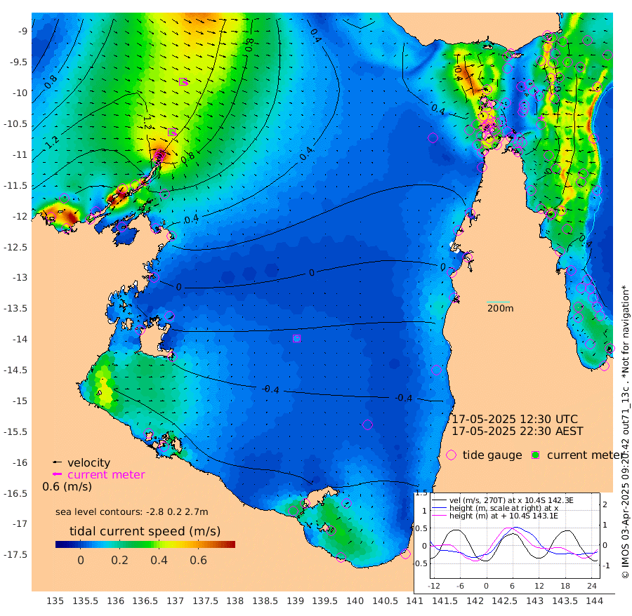 38cm/s 121T +3cm/s rms + 7cm/s -42T. ARA-GOC87 57m 9cm/s 27T +3cm/s rms + 2cm/s -2T. ARA-GOC87 60m 39cm/s 117T +2cm/s rms + 3cm/s 61T. ARA-GOC87 47m 10cm Daru 20cm Bobo Island 31cm Meer Island Barge 27cm Bramble Cay 19cm Unnamed Cay 28cm Pearce Cay 27cm Stephens Island 16cm Merrie England Shoals 7cm Mutacomal Reef 22cm Darnley Island Barge 30cm East Cay 16cm Yorke Island Barge 21cm Rennel Island 16cm Aureed Island 17cm Dungeness Reef 5cm Zagai Island 9cm Yam Island -4cm Dauan Island -17cm Saibai Island -8cm Phipi Reef -5cm Warrior Reef - West 12cm Mabuiag Island Barge 24cm Half Way Island 19cm Coconut Island 18cm Dugong Islet 14cm Poll Island 15cm Kirkcaldie Reef 9cm Suarji Island 1cm Sue Islet 79cm Hawkesbury Island 16cm Alert Patches 20cm Twin Island 70cm Badu Island 16cm St Pauls (Moa Island) 67cm Kubin (Moa Island) 29cm Ince Point 39cm Thursday Island 36cm Nardana Patches 54cm Turtle Head 69cm Round Island 84cm Goods Island 94cm Booby Island 93cm White Rocks Area 76cm Carpentaria 29cm Papou Point 110cm Bampfield Head 78cm Crab Island 84cm Red Wallis Island 67cm Packe Island 20cm Harrington Reef 76cm Herald Camp -12cm Sharp Point 46cm Red Island Point 39cm Possession Island 6cm Alpha Rock 17cm Frederick Point 16cm Wyborn Reef Light 15cm Tetley Island 23cm Triangle Reef 41cm Turtle Head Island 31cm Maclennan Cay 35cm Raine Island 18cm Mcsweeny Reef 14cm Collette Reef 20cm Shadwell Reef 18cm Hannibal Island 27cm Round Point 67cm Vrilya Point 22cm Cape Grenville 32cm Hicks Island 29cm Sir Charles Hardy Island 8cm Harvey Island 24cm Kay Reef 28cm Rocky Island 25cm Chapman Island 26cm Ham Reef 30cm Jubilee Reef 26cm Night Island 26cm Unnamed Reef No. 3 33cm Morris Island 40cm 1st 3 Mile Opening 32cm Creech Reef 21cm Fife Island 41cm Eden Reef 30cm Stanley Island 34cm Normanby River 179cm Yabooma Island 213cm Hutchison River 178cm Elcho Island 166cm North West Crocodile Island 119cm Cape Wessel 152cm Stevens Island 106cm Guluwuru Island 130cm Hopeful Bay 132cm Auster Point 138cm Two Island Bay 169cm Cadell Strait -11cm Mallison Island 90cm Melville Bay (Gove Harbour) 103cm Truant Island 56cm Cape Arnhem 19cm Cape Grey -7cm Hawk Island -37cm Milner Bay (Groote Eylandt) -51cm Cape Beatrice -102cm West Island -98cm Centre Island -125cm Mornington Island -129cm West Wellesley Islands -144cm Bountiful Island -141cm Albert River Mouth -167cm Sweers Island -150cm Karumba -101cm Nassau River Offshore -60cm Christmas Creek -7cm Archer River 18cm Boyd Point 23cm Weipa (Humbug Point) 31cm Pennefather River 49cm Cullen Point