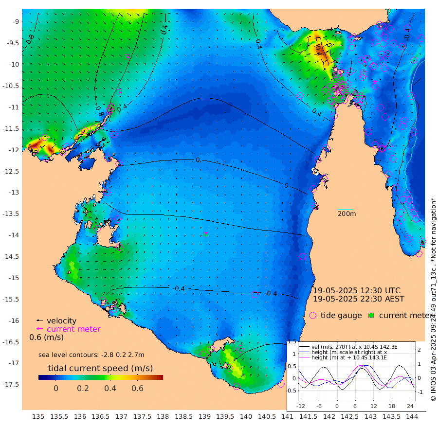 19cm/s 129T +3cm/s rms + 7cm/s -42T. ARA-GOC87 57m 21cm/s 13T +3cm/s rms + 2cm/s -2T. ARA-GOC87 60m 26cm/s 125T +2cm/s rms + 3cm/s 61T. ARA-GOC87 47m -46cm Daru -34cm Bobo Island -26cm Meer Island Barge -37cm Bramble Cay -45cm Unnamed Cay -31cm Pearce Cay -38cm Stephens Island -51cm Merrie England Shoals -49cm Mutacomal Reef -40cm Darnley Island Barge -27cm East Cay -40cm Yorke Island Barge -35cm Rennel Island -33cm Aureed Island -31cm Dungeness Reef -16cm Zagai Island -14cm Yam Island -13cm Dauan Island -11cm Saibai Island -24cm Phipi Reef -29cm Warrior Reef - West 19cm Mabuiag Island Barge -34cm Half Way Island -24cm Coconut Island -35cm Dugong Islet -19cm Poll Island -24cm Kirkcaldie Reef -1cm Suarji Island -27cm Sue Islet 69cm Hawkesbury Island 0cm Alert Patches 2cm Twin Island 64cm Badu Island 2cm St Pauls (Moa Island) 50cm Kubin (Moa Island) 18cm Ince Point 31cm Thursday Island 28cm Nardana Patches 41cm Turtle Head 57cm Round Island 72cm Goods Island 91cm Booby Island 92cm White Rocks Area 91cm Carpentaria 18cm Papou Point 103cm Bampfield Head 74cm Crab Island 82cm Red Wallis Island 51cm Packe Island -28cm Harrington Reef 65cm Herald Camp -10cm Sharp Point 45cm Red Island Point 27cm Possession Island -11cm Alpha Rock -13cm Frederick Point -35cm Wyborn Reef Light -31cm Tetley Island -21cm Triangle Reef -22cm Turtle Head Island -20cm Maclennan Cay -14cm Raine Island -40cm Mcsweeny Reef -43cm Collette Reef -33cm Shadwell Reef -47cm Hannibal Island -37cm Round Point 65cm Vrilya Point -36cm Cape Grenville -27cm Hicks Island -28cm Sir Charles Hardy Island -11cm Harvey Island -32cm Kay Reef -24cm Rocky Island -20cm Chapman Island -19cm Ham Reef -21cm Jubilee Reef -24cm Night Island -19cm Unnamed Reef No. 3 -23cm Morris Island -15cm 1st 3 Mile Opening -21cm Creech Reef -33cm Fife Island -24cm Eden Reef -29cm Stanley Island -27cm Normanby River 120cm Yabooma Island 138cm Hutchison River 121cm Elcho Island 116cm North West Crocodile Island 79cm Cape Wessel 92cm Stevens Island 41cm Guluwuru Island 79cm Hopeful Bay 85cm Auster Point 82cm Two Island Bay 86cm Cadell Strait -120cm Mallison Island 37cm Melville Bay (Gove Harbour) 46cm Truant Island 20cm Cape Arnhem 5cm Cape Grey -14cm Hawk Island -18cm Milner Bay (Groote Eylandt) -32cm Cape Beatrice -55cm West Island -49cm Centre Island -103cm Mornington Island -104cm West Wellesley Islands -113cm Bountiful Island -115cm Albert River Mouth -128cm Sweers Island -123cm Karumba -98cm Nassau River Offshore -69cm Christmas Creek -16cm Archer River 9cm Boyd Point 11cm Weipa (Humbug Point) 20cm Pennefather River 49cm Cullen Point
