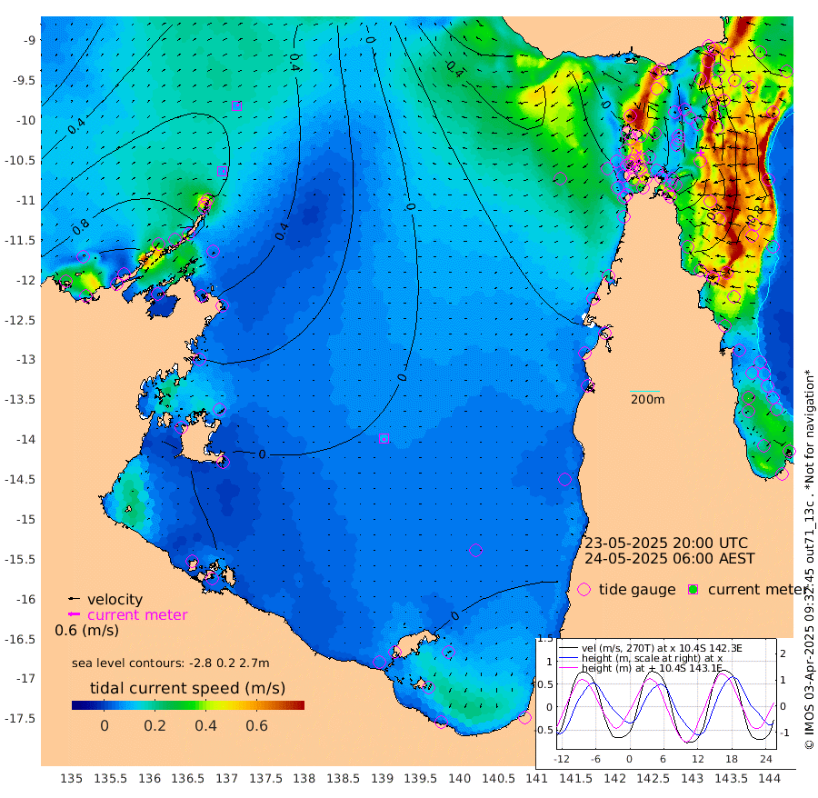 10cm/s 94T +3cm/s rms + 7cm/s -42T. ARA-GOC87 57m 11cm/s -173T +3cm/s rms + 2cm/s -2T. ARA-GOC87 60m 10cm/s 80T +2cm/s rms + 3cm/s 61T. ARA-GOC87 47m 33cm Daru 41cm Bobo Island 76cm Meer Island Barge 76cm Bramble Cay 57cm Unnamed Cay 53cm Pearce Cay 67cm Stephens Island 60cm Merrie England Shoals 34cm Mutacomal Reef 66cm Darnley Island Barge 85cm East Cay 47cm Yorke Island Barge 44cm Rennel Island 36cm Aureed Island 18cm Dungeness Reef -27cm Zagai Island -16cm Yam Island -48cm Dauan Island -47cm Saibai Island -47cm Phipi Reef -23cm Warrior Reef - West -51cm Mabuiag Island Barge 44cm Half Way Island 10cm Coconut Island 34cm Dugong Islet -8cm Poll Island 5cm Kirkcaldie Reef -42cm Suarji Island -8cm Sue Islet -15cm Hawkesbury Island -40cm Alert Patches -33cm Twin Island -36cm Badu Island -45cm St Pauls (Moa Island) -22cm Kubin (Moa Island) -40cm Ince Point -40cm Thursday Island -42cm Nardana Patches -31cm Turtle Head -28cm Round Island -21cm Goods Island -28cm Booby Island -25cm White Rocks Area -42cm Carpentaria -31cm Papou Point -28cm Bampfield Head -30cm Crab Island -29cm Red Wallis Island -23cm Packe Island 23cm Harrington Reef -10cm Herald Camp -23cm Sharp Point -20cm Red Island Point -35cm Possession Island -25cm Alpha Rock -9cm Frederick Point 23cm Wyborn Reef Light 12cm Tetley Island 52cm Triangle Reef 33cm Turtle Head Island 71cm Maclennan Cay 73cm Raine Island 52cm Mcsweeny Reef 55cm Collette Reef 63cm Shadwell Reef 65cm Hannibal Island 77cm Round Point -35cm Vrilya Point 73cm Cape Grenville 79cm Hicks Island 87cm Sir Charles Hardy Island 24cm Harvey Island 83cm Kay Reef 81cm Rocky Island 78cm Chapman Island 78cm Ham Reef 79cm Jubilee Reef 67cm Night Island 76cm Unnamed Reef No. 3 84cm Morris Island 75cm 1st 3 Mile Opening 79cm Creech Reef 85cm Fife Island 100cm Eden Reef 86cm Stanley Island 102cm Normanby River 122cm Yabooma Island 130cm Hutchison River 106cm Elcho Island 104cm North West Crocodile Island 84cm Cape Wessel 100cm Stevens Island 88cm Guluwuru Island 95cm Hopeful Bay 85cm Auster Point 98cm Two Island Bay 132cm Cadell Strait 114cm Mallison Island 76cm Melville Bay (Gove Harbour) 78cm Truant Island 45cm Cape Arnhem 27cm Cape Grey 7cm Hawk Island -18cm Milner Bay (Groote Eylandt) -18cm Cape Beatrice -44cm West Island -55cm Centre Island -24cm Mornington Island -22cm West Wellesley Islands 6cm Bountiful Island -19cm Albert River Mouth -28cm Sweers Island -16cm Karumba 3cm Nassau River Offshore 10cm Christmas Creek 2cm Archer River -4cm Boyd Point 4cm Weipa (Humbug Point) -28cm Pennefather River -23cm Cullen Point