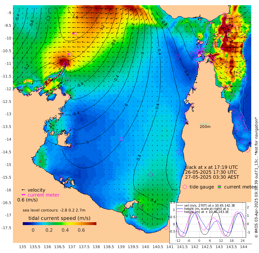 44cm/s -84T +3cm/s rms + 7cm/s -42T. ARA-GOC87 57m 9cm/s -179T +3cm/s rms + 2cm/s -2T. ARA-GOC87 60m 46cm/s -94T +2cm/s rms + 3cm/s 61T. ARA-GOC87 47m -57cm Daru -77cm Bobo Island -63cm Meer Island Barge -80cm Bramble Cay -71cm Unnamed Cay -84cm Pearce Cay -80cm Stephens Island -81cm Merrie England Shoals -60cm Mutacomal Reef -73cm Darnley Island Barge -68cm East Cay -63cm Yorke Island Barge -62cm Rennel Island -62cm Aureed Island -36cm Dungeness Reef 6cm Zagai Island 13cm Yam Island 85cm Dauan Island 80cm Saibai Island 70cm Phipi Reef 19cm Warrior Reef - West 80cm Mabuiag Island Barge -67cm Half Way Island -45cm Coconut Island -52cm Dugong Islet -17cm Poll Island -20cm Kirkcaldie Reef 33cm Suarji Island -6cm Sue Islet 95cm Hawkesbury Island 36cm Alert Patches 22cm Twin Island 95cm Badu Island 37cm St Pauls (Moa Island) 74cm Kubin (Moa Island) 53cm Ince Point 67cm Thursday Island 65cm Nardana Patches 82cm Turtle Head 92cm Round Island 97cm Goods Island 116cm Booby Island 104cm White Rocks Area 108cm Carpentaria 22cm Papou Point 126cm Bampfield Head 96cm Crab Island 108cm Red Wallis Island 86cm Packe Island -59cm Harrington Reef 127cm Herald Camp 17cm Sharp Point 64cm Red Island Point 50cm Possession Island 13cm Alpha Rock -12cm Frederick Point -57cm Wyborn Reef Light -46cm Tetley Island -44cm Triangle Reef -74cm Turtle Head Island -51cm Maclennan Cay -45cm Raine Island -66cm Mcsweeny Reef -63cm Collette Reef -49cm Shadwell Reef -77cm Hannibal Island -81cm Round Point 89cm Vrilya Point -65cm Cape Grenville -64cm Hicks Island -49cm Sir Charles Hardy Island -20cm Harvey Island -63cm Kay Reef -51cm Rocky Island -44cm Chapman Island -43cm Ham Reef -51cm Jubilee Reef -48cm Night Island -46cm Unnamed Reef No. 3 -58cm Morris Island -43cm 1st 3 Mile Opening -50cm Creech Reef -60cm Fife Island -73cm Eden Reef -57cm Stanley Island -76cm Normanby River -156cm Yabooma Island -203cm Hutchison River -171cm Elcho Island -162cm North West Crocodile Island -141cm Cape Wessel -173cm Stevens Island -156cm Guluwuru Island -146cm Hopeful Bay -144cm Auster Point -156cm Two Island Bay -214cm Cadell Strait -176cm Mallison Island -133cm Melville Bay (Gove Harbour) -140cm Truant Island -90cm Cape Arnhem -58cm Cape Grey -43cm Hawk Island -11cm Milner Bay (Groote Eylandt) -3cm Cape Beatrice 40cm West Island 44cm Centre Island 43cm Mornington Island 50cm West Wellesley Islands 62cm Bountiful Island 32cm Albert River Mouth 28cm Sweers Island 43cm Karumba 57cm Nassau River Offshore 70cm Christmas Creek 68cm Archer River 75cm Boyd Point 85cm Weipa (Humbug Point) 57cm Pennefather River 99cm Cullen Point