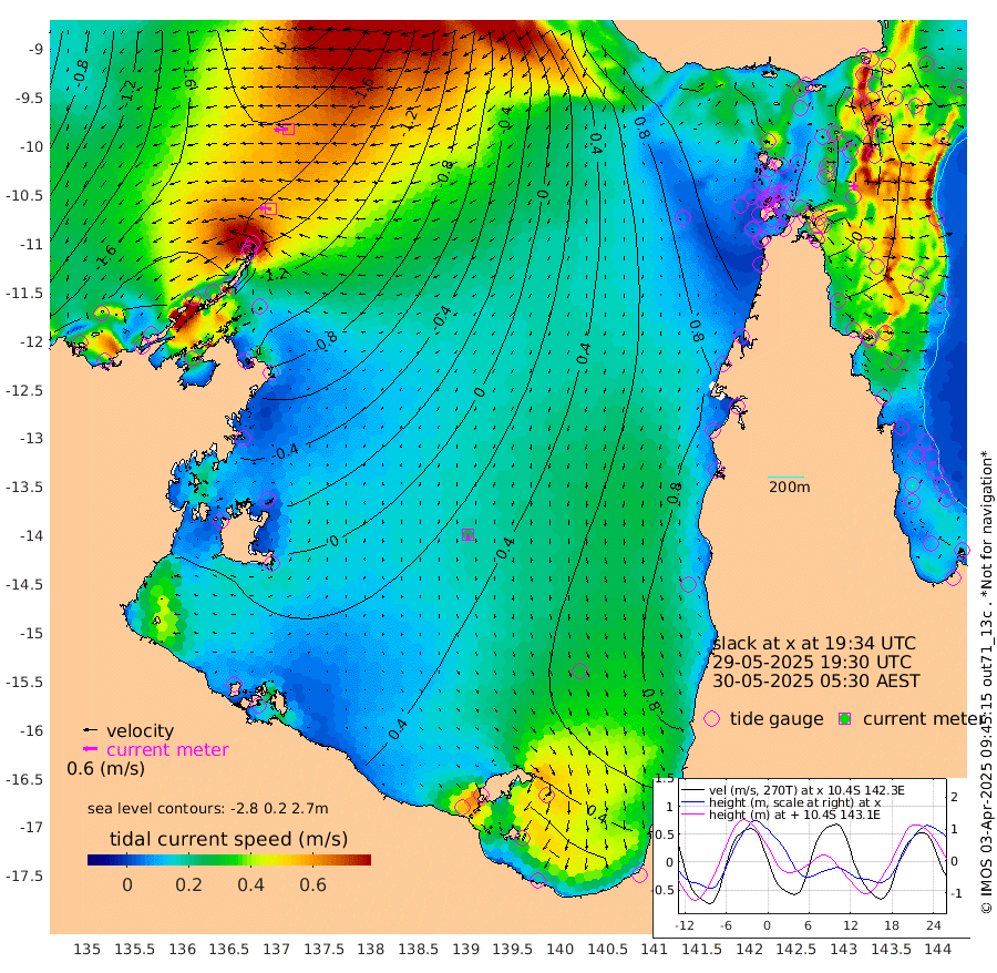 53cm/s -87T +3cm/s rms + 7cm/s -42T. ARA-GOC87 57m 25cm/s 180T +3cm/s rms + 2cm/s -2T. ARA-GOC87 60m 61cm/s -96T +2cm/s rms + 3cm/s 61T. ARA-GOC87 47m 4cm Daru -21cm Bobo Island -24cm Meer Island Barge -28cm Bramble Cay -12cm Unnamed Cay -26cm Pearce Cay -20cm Stephens Island -15cm Merrie England Shoals 2cm Mutacomal Reef -21cm Darnley Island Barge -23cm East Cay -12cm Yorke Island Barge -2cm Rennel Island -12cm Aureed Island 18cm Dungeness Reef 34cm Zagai Island 52cm Yam Island 92cm Dauan Island 81cm Saibai Island 92cm Phipi Reef 53cm Warrior Reef - West 86cm Mabuiag Island Barge -3cm Half Way Island 7cm Coconut Island 10cm Dugong Islet 29cm Poll Island 41cm Kirkcaldie Reef 60cm Suarji Island 34cm Sue Islet 113cm Hawkesbury Island 73cm Alert Patches 60cm Twin Island 110cm Badu Island 70cm St Pauls (Moa Island) 96cm Kubin (Moa Island) 83cm Ince Point 94cm Thursday Island 91cm Nardana Patches 107cm Turtle Head 102cm Round Island 115cm Goods Island 129cm Booby Island 116cm White Rocks Area 110cm Carpentaria 53cm Papou Point 116cm Bampfield Head 115cm Crab Island 125cm Red Wallis Island 114cm Packe Island 7cm Harrington Reef 137cm Herald Camp 28cm Sharp Point 94cm Red Island Point 72cm Possession Island 46cm Alpha Rock 36cm Frederick Point -4cm Wyborn Reef Light 4cm Tetley Island -12cm Triangle Reef -11cm Turtle Head Island -11cm Maclennan Cay -14cm Raine Island -11cm Mcsweeny Reef -12cm Collette Reef -11cm Shadwell Reef -21cm Hannibal Island -27cm Round Point 113cm Vrilya Point -15cm Cape Grenville -18cm Hicks Island -9cm Sir Charles Hardy Island -4cm Harvey Island -19cm Kay Reef -16cm Rocky Island -18cm Chapman Island -15cm Ham Reef -17cm Jubilee Reef -13cm Night Island -14cm Unnamed Reef No. 3 -19cm Morris Island -11cm 1st 3 Mile Opening -14cm Creech Reef -18cm Fife Island -34cm Eden Reef -17cm Stanley Island -31cm Normanby River -209cm Yabooma Island -257cm Hutchison River -223cm Elcho Island -207cm North West Crocodile Island -190cm Cape Wessel -224cm Stevens Island -191cm Guluwuru Island -198cm Hopeful Bay -194cm Auster Point -200cm Two Island Bay -252cm Cadell Strait -207cm Mallison Island -168cm Melville Bay (Gove Harbour) -181cm Truant Island -117cm Cape Arnhem -78cm Cape Grey -61cm Hawk Island -30cm Milner Bay (Groote Eylandt) -8cm Cape Beatrice 45cm West Island 44cm Centre Island 66cm Mornington Island 68cm West Wellesley Islands 75cm Bountiful Island 41cm Albert River Mouth 23cm Sweers Island 64cm Karumba 100cm Nassau River Offshore 113cm Christmas Creek 98cm Archer River 95cm Boyd Point 106cm Weipa (Humbug Point) 86cm Pennefather River 113cm Cullen Point