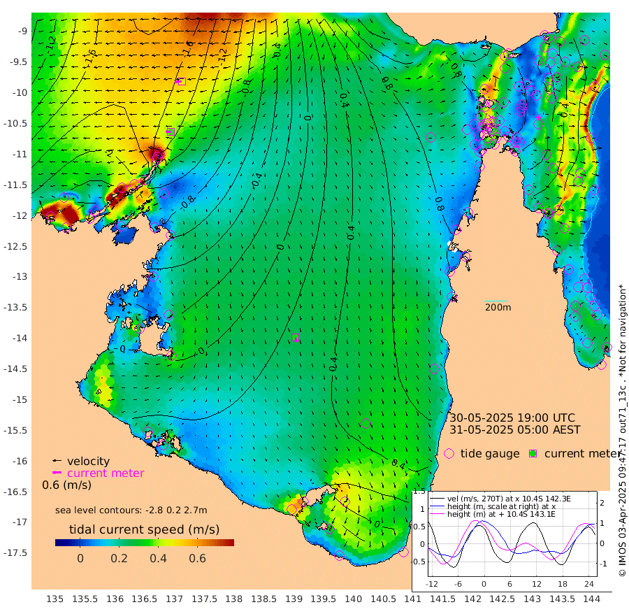 36cm/s -89T +3cm/s rms + 7cm/s -42T. ARA-GOC87 57m 35cm/s 168T +3cm/s rms + 2cm/s -2T. ARA-GOC87 60m 48cm/s -96T +2cm/s rms + 3cm/s 61T. ARA-GOC87 47m 69cm Daru 47cm Bobo Island 20cm Meer Island Barge 24cm Bramble Cay 49cm Unnamed Cay 42cm Pearce Cay 44cm Stephens Island 46cm Merrie England Shoals 65cm Mutacomal Reef 41cm Darnley Island Barge 23cm East Cay 53cm Yorke Island Barge 59cm Rennel Island 53cm Aureed Island 76cm Dungeness Reef 81cm Zagai Island 97cm Yam Island 110cm Dauan Island 102cm Saibai Island 109cm Phipi Reef 99cm Warrior Reef - West 98cm Mabuiag Island Barge 62cm Half Way Island 67cm Coconut Island 76cm Dugong Islet 82cm Poll Island 97cm Kirkcaldie Reef 98cm Suarji Island 88cm Sue Islet 108cm Hawkesbury Island 108cm Alert Patches 101cm Twin Island 101cm Badu Island 109cm St Pauls (Moa Island) 103cm Kubin (Moa Island) 107cm Ince Point 111cm Thursday Island 109cm Nardana Patches 111cm Turtle Head 96cm Round Island 103cm Goods Island 109cm Booby Island 97cm White Rocks Area 103cm Carpentaria 88cm Papou Point 98cm Bampfield Head 98cm Crab Island 110cm Red Wallis Island 113cm Packe Island 77cm Harrington Reef 125cm Herald Camp 38cm Sharp Point 101cm Red Island Point 93cm Possession Island 88cm Alpha Rock 90cm Frederick Point 60cm Wyborn Reef Light 66cm Tetley Island 27cm Triangle Reef 61cm Turtle Head Island 32cm Maclennan Cay 15cm Raine Island 49cm Mcsweeny Reef 42cm Collette Reef 28cm Shadwell Reef 39cm Hannibal Island 26cm Round Point 103cm Vrilya Point 33cm Cape Grenville 28cm Hicks Island 37cm Sir Charles Hardy Island 12cm Harvey Island 22cm Kay Reef 18cm Rocky Island 13cm Chapman Island 17cm Ham Reef 19cm Jubilee Reef 21cm Night Island 18cm Unnamed Reef No. 3 17cm Morris Island 20cm 1st 3 Mile Opening 22cm Creech Reef 21cm Fife Island 5cm Eden Reef 21cm Stanley Island 13cm Normanby River -237cm Yabooma Island -281cm Hutchison River -252cm Elcho Island -238cm North West Crocodile Island -173cm Cape Wessel -233cm Stevens Island -152cm Guluwuru Island -214cm Hopeful Bay -189cm Auster Point -189cm Two Island Bay -235cm Cadell Strait -105cm Mallison Island -144cm Melville Bay (Gove Harbour) -151cm Truant Island -96cm Cape Arnhem -71cm Cape Grey -64cm Hawk Island -49cm Milner Bay (Groote Eylandt) -29cm Cape Beatrice 15cm West Island 12cm Centre Island 29cm Mornington Island 33cm West Wellesley Islands 18cm Bountiful Island -39cm Albert River Mouth -58cm Sweers Island -12cm Karumba 72cm Nassau River Offshore 99cm Christmas Creek 85cm Archer River 89cm Boyd Point 89cm Weipa (Humbug Point) 81cm Pennefather River 100cm Cullen Point