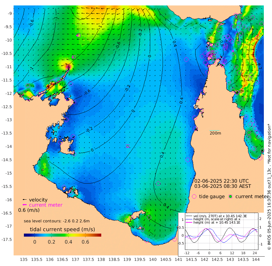 35cm/s -91T +3cm/s rms + 7cm/s -42T. ARA-GOC87 57m 20cm/s -177T +3cm/s rms + 2cm/s -2T. ARA-GOC87 60m 41cm/s -98T +2cm/s rms + 3cm/s 61T. ARA-GOC87 47m 43cm Daru 28cm Bobo Island -5cm Meer Island Barge 5cm Bramble Cay 25cm Unnamed Cay 25cm Pearce Cay 20cm Stephens Island 25cm Merrie England Shoals 43cm Mutacomal Reef 11cm Darnley Island Barge -1cm East Cay 24cm Yorke Island Barge 35cm Rennel Island 28cm Aureed Island 52cm Dungeness Reef 51cm Zagai Island 70cm Yam Island 64cm Dauan Island 54cm Saibai Island 82cm Phipi Reef 64cm Warrior Reef - West 63cm Mabuiag Island Barge 42cm Half Way Island 43cm Coconut Island 50cm Dugong Islet 58cm Poll Island 72cm Kirkcaldie Reef 67cm Suarji Island 54cm Sue Islet 83cm Hawkesbury Island 75cm Alert Patches 73cm Twin Island 71cm Badu Island 79cm St Pauls (Moa Island) 77cm Kubin (Moa Island) 77cm Ince Point 79cm Thursday Island 78cm Nardana Patches 76cm Turtle Head 70cm Round Island 71cm Goods Island 71cm Booby Island 66cm White Rocks Area 51cm Carpentaria 68cm Papou Point 47cm Bampfield Head 68cm Crab Island 75cm Red Wallis Island 84cm Packe Island 55cm Harrington Reef 86cm Herald Camp 30cm Sharp Point 82cm Red Island Point 69cm Possession Island 57cm Alpha Rock 64cm Frederick Point 35cm Wyborn Reef Light 41cm Tetley Island 2cm Triangle Reef 42cm Turtle Head Island 5cm Maclennan Cay -12cm Raine Island 21cm Mcsweeny Reef 14cm Collette Reef -2cm Shadwell Reef 13cm Hannibal Island 6cm Round Point 69cm Vrilya Point 9cm Cape Grenville 4cm Hicks Island 0cm Sir Charles Hardy Island 4cm Harvey Island -4cm Kay Reef -8cm Rocky Island -18cm Chapman Island -14cm Ham Reef -11cm Jubilee Reef -3cm Night Island -12cm Unnamed Reef No. 3 -9cm Morris Island -12cm 1st 3 Mile Opening -8cm Creech Reef -12cm Fife Island -20cm Eden Reef -9cm Stanley Island -10cm Normanby River -131cm Yabooma Island -154cm Hutchison River -136cm Elcho Island -117cm North West Crocodile Island -130cm Cape Wessel -143cm Stevens Island -134cm Guluwuru Island -131cm Hopeful Bay -129cm Auster Point -120cm Two Island Bay -148cm Cadell Strait -205cm Mallison Island -119cm Melville Bay (Gove Harbour) -131cm Truant Island -88cm Cape Arnhem -59cm Cape Grey -41cm Hawk Island -25cm Milner Bay (Groote Eylandt) -4cm Cape Beatrice 33cm West Island 33cm Centre Island 51cm Mornington Island 42cm West Wellesley Islands 49cm Bountiful Island 32cm Albert River Mouth 19cm Sweers Island 59cm Karumba 76cm Nassau River Offshore 76cm Christmas Creek 57cm Archer River 49cm Boyd Point 53cm Weipa (Humbug Point) 56cm Pennefather River 63cm Cullen Point