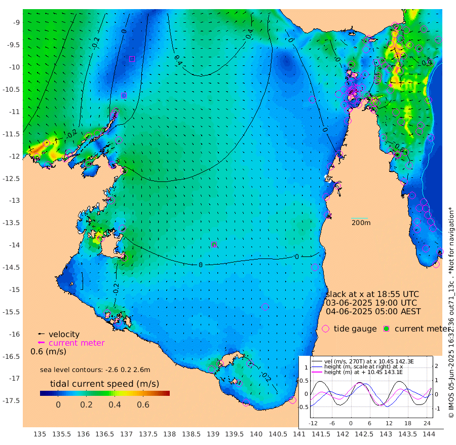 5cm/s 96T +3cm/s rms + 7cm/s -42T. ARA-GOC87 57m 26cm/s 167T +3cm/s rms + 2cm/s -2T. ARA-GOC87 60m 2cm/s -37T +2cm/s rms + 3cm/s 61T. ARA-GOC87 47m 66cm Daru 69cm Bobo Island 70cm Meer Island Barge 78cm Bramble Cay 74cm Unnamed Cay 71cm Pearce Cay 77cm Stephens Island 75cm Merrie England Shoals 69cm Mutacomal Reef 77cm Darnley Island Barge 81cm East Cay 70cm Yorke Island Barge 68cm Rennel Island 66cm Aureed Island 51cm Dungeness Reef 31cm Zagai Island 38cm Yam Island 20cm Dauan Island 25cm Saibai Island 9cm Phipi Reef 41cm Warrior Reef - West 6cm Mabuiag Island Barge 64cm Half Way Island 52cm Coconut Island 63cm Dugong Islet 41cm Poll Island 45cm Kirkcaldie Reef 18cm Suarji Island 43cm Sue Islet 21cm Hawkesbury Island 19cm Alert Patches 27cm Twin Island 2cm Badu Island 18cm St Pauls (Moa Island) 20cm Kubin (Moa Island) 16cm Ince Point 12cm Thursday Island 12cm Nardana Patches 13cm Turtle Head 16cm Round Island 9cm Goods Island 2cm Booby Island 2cm White Rocks Area 4cm Carpentaria 18cm Papou Point 16cm Bampfield Head -1cm Crab Island 11cm Red Wallis Island 27cm Packe Island 60cm Harrington Reef 36cm Herald Camp 1cm Sharp Point 13cm Red Island Point 14cm Possession Island 35cm Alpha Rock 44cm Frederick Point 65cm Wyborn Reef Light 60cm Tetley Island 64cm Triangle Reef 58cm Turtle Head Island 70cm Maclennan Cay 62cm Raine Island 72cm Mcsweeny Reef 72cm Collette Reef 66cm Shadwell Reef 77cm Hannibal Island 83cm Round Point -4cm Vrilya Point 77cm Cape Grenville 76cm Hicks Island 89cm Sir Charles Hardy Island 24cm Harvey Island 79cm Kay Reef 73cm Rocky Island 75cm Chapman Island 73cm Ham Reef 70cm Jubilee Reef 65cm Night Island 74cm Unnamed Reef No. 3 73cm Morris Island 60cm 1st 3 Mile Opening 70cm Creech Reef 83cm Fife Island 82cm Eden Reef 76cm Stanley Island 85cm Normanby River -5cm Yabooma Island -12cm Hutchison River -19cm Elcho Island -21cm North West Crocodile Island 30cm Cape Wessel 4cm Stevens Island 43cm Guluwuru Island 8cm Hopeful Bay 10cm Auster Point 21cm Two Island Bay 27cm Cadell Strait 179cm Mallison Island 31cm Melville Bay (Gove Harbour) 37cm Truant Island 23cm Cape Arnhem -5cm Cape Grey -12cm Hawk Island -44cm Milner Bay (Groote Eylandt) -42cm Cape Beatrice -59cm West Island -66cm Centre Island -41cm Mornington Island -40cm West Wellesley Islands -46cm Bountiful Island -94cm Albert River Mouth -104cm Sweers Island -80cm Karumba -3cm Nassau River Offshore 24cm Christmas Creek 19cm Archer River 24cm Boyd Point 23cm Weipa (Humbug Point) -3cm Pennefather River 14cm Cullen Point