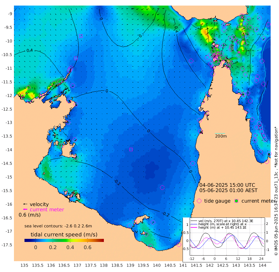 8cm/s 155T +3cm/s rms + 7cm/s -42T. ARA-GOC87 57m 4cm/s 27T +3cm/s rms + 2cm/s -2T. ARA-GOC87 60m 10cm/s 149T +2cm/s rms + 3cm/s 61T. ARA-GOC87 47m -29cm Daru -38cm Bobo Island -25cm Meer Island Barge -35cm Bramble Cay -29cm Unnamed Cay -40cm Pearce Cay -38cm Stephens Island -40cm Merrie England Shoals -28cm Mutacomal Reef -35cm Darnley Island Barge -33cm East Cay -30cm Yorke Island Barge -29cm Rennel Island -34cm Aureed Island -15cm Dungeness Reef 13cm Zagai Island 18cm Yam Island 61cm Dauan Island 53cm Saibai Island 39cm Phipi Reef 13cm Warrior Reef - West 62cm Mabuiag Island Barge -31cm Half Way Island -21cm Coconut Island -23cm Dugong Islet -2cm Poll Island -8cm Kirkcaldie Reef 23cm Suarji Island 1cm Sue Islet 97cm Hawkesbury Island 26cm Alert Patches 21cm Twin Island 93cm Badu Island 31cm St Pauls (Moa Island) 77cm Kubin (Moa Island) 45cm Ince Point 56cm Thursday Island 55cm Nardana Patches 71cm Turtle Head 89cm Round Island 94cm Goods Island 106cm Booby Island 101cm White Rocks Area 86cm Carpentaria 28cm Papou Point 126cm Bampfield Head 81cm Crab Island 94cm Red Wallis Island 75cm Packe Island -32cm Harrington Reef 107cm Herald Camp 3cm Sharp Point 50cm Red Island Point 45cm Possession Island 16cm Alpha Rock -2cm Frederick Point -20cm Wyborn Reef Light -14cm Tetley Island -17cm Triangle Reef -23cm Turtle Head Island -21cm Maclennan Cay -16cm Raine Island -33cm Mcsweeny Reef -32cm Collette Reef -21cm Shadwell Reef -38cm Hannibal Island -38cm Round Point 66cm Vrilya Point -33cm Cape Grenville -27cm Hicks Island -16cm Sir Charles Hardy Island -10cm Harvey Island -30cm Kay Reef -22cm Rocky Island -19cm Chapman Island -18cm Ham Reef -20cm Jubilee Reef -24cm Night Island -23cm Unnamed Reef No. 3 -25cm Morris Island -10cm 1st 3 Mile Opening -22cm Creech Reef -36cm Fife Island -28cm Eden Reef -25cm Stanley Island -34cm Normanby River 74cm Yabooma Island 70cm Hutchison River 60cm Elcho Island 55cm North West Crocodile Island 34cm Cape Wessel 48cm Stevens Island 20cm Guluwuru Island 43cm Hopeful Bay 42cm Auster Point 39cm Two Island Bay 33cm Cadell Strait -32cm Mallison Island 18cm Melville Bay (Gove Harbour) 24cm Truant Island 9cm Cape Arnhem -3cm Cape Grey -14cm Hawk Island -20cm Milner Bay (Groote Eylandt) -30cm Cape Beatrice -47cm West Island -45cm Centre Island -68cm Mornington Island -60cm West Wellesley Islands -56cm Bountiful Island -68cm Albert River Mouth -86cm Sweers Island -78cm Karumba -51cm Nassau River Offshore -20cm Christmas Creek 12cm Archer River 35cm Boyd Point 43cm Weipa (Humbug Point) 27cm Pennefather River 66cm Cullen Point