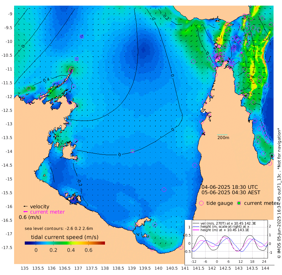 8cm/s 99T +3cm/s rms + 7cm/s -42T. ARA-GOC87 57m 17cm/s 173T +3cm/s rms + 2cm/s -2T. ARA-GOC87 60m 4cm/s 76T +2cm/s rms + 3cm/s 61T. ARA-GOC87 47m 24cm Daru 24cm Bobo Island 47cm Meer Island Barge 48cm Bramble Cay 37cm Unnamed Cay 27cm Pearce Cay 37cm Stephens Island 38cm Merrie England Shoals 29cm Mutacomal Reef 40cm Darnley Island Barge 54cm East Cay 29cm Yorke Island Barge 27cm Rennel Island 22cm Aureed Island 10cm Dungeness Reef 0cm Zagai Island 5cm Yam Island 10cm Dauan Island 13cm Saibai Island -9cm Phipi Reef 8cm Warrior Reef - West -3cm Mabuiag Island Barge 20cm Half Way Island 10cm Coconut Island 17cm Dugong Islet 2cm Poll Island 2cm Kirkcaldie Reef -15cm Suarji Island 6cm Sue Islet 19cm Hawkesbury Island -13cm Alert Patches -8cm Twin Island 5cm Badu Island -14cm St Pauls (Moa Island) 11cm Kubin (Moa Island) -7cm Ince Point -7cm Thursday Island -7cm Nardana Patches 3cm Turtle Head 13cm Round Island 12cm Goods Island 8cm Booby Island 8cm White Rocks Area 0cm Carpentaria -11cm Papou Point 24cm Bampfield Head 1cm Crab Island 12cm Red Wallis Island 18cm Packe Island 8cm Harrington Reef 34cm Herald Camp -10cm Sharp Point -2cm Red Island Point -9cm Possession Island 5cm Alpha Rock 2cm Frederick Point 25cm Wyborn Reef Light 21cm Tetley Island 42cm Triangle Reef 11cm Turtle Head Island 45cm Maclennan Cay 49cm Raine Island 34cm Mcsweeny Reef 39cm Collette Reef 46cm Shadwell Reef 42cm Hannibal Island 51cm Round Point -7cm Vrilya Point 48cm Cape Grenville 49cm Hicks Island 65cm Sir Charles Hardy Island 14cm Harvey Island 56cm Kay Reef 55cm Rocky Island 61cm Chapman Island 58cm Ham Reef 53cm Jubilee Reef 45cm Night Island 57cm Unnamed Reef No. 3 54cm Morris Island 46cm 1st 3 Mile Opening 51cm Creech Reef 61cm Fife Island 63cm Eden Reef 56cm Stanley Island 61cm Normanby River 62cm Yabooma Island 59cm Hutchison River 47cm Elcho Island 41cm North West Crocodile Island 62cm Cape Wessel 60cm Stevens Island 66cm Guluwuru Island 61cm Hopeful Bay 51cm Auster Point 57cm Two Island Bay 72cm Cadell Strait 191cm Mallison Island 56cm Melville Bay (Gove Harbour) 63cm Truant Island 38cm Cape Arnhem 7cm Cape Grey -2cm Hawk Island -33cm Milner Bay (Groote Eylandt) -35cm Cape Beatrice -62cm West Island -70cm Centre Island -43cm Mornington Island -40cm West Wellesley Islands -33cm Bountiful Island -63cm Albert River Mouth -76cm Sweers Island -60cm Karumba -10cm Nassau River Offshore 14cm Christmas Creek 15cm Archer River 19cm Boyd Point 25cm Weipa (Humbug Point) -10cm Pennefather River 13cm Cullen Point