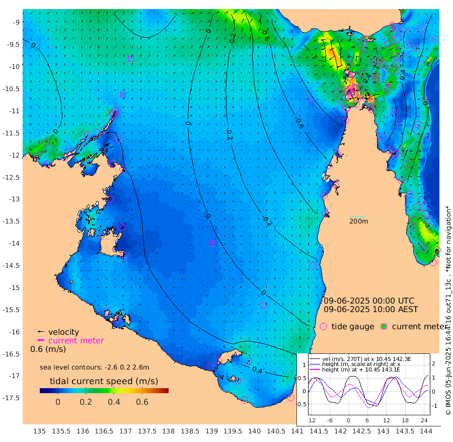 10cm/s 15T +3cm/s rms + 7cm/s -42T. ARA-GOC87 57m 5cm/s -47T +3cm/s rms + 2cm/s -2T. ARA-GOC87 60m 12cm/s 17T +2cm/s rms + 3cm/s 61T. ARA-GOC87 47m 42cm Daru 46cm Bobo Island 3cm Meer Island Barge 27cm Bramble Cay 37cm Unnamed Cay 38cm Pearce Cay 30cm Stephens Island 43cm Merrie England Shoals 54cm Mutacomal Reef 23cm Darnley Island Barge 8cm East Cay 31cm Yorke Island Barge 33cm Rennel Island 39cm Aureed Island 30cm Dungeness Reef 30cm Zagai Island 29cm Yam Island -10cm Dauan Island -1cm Saibai Island -3cm Phipi Reef 31cm Warrior Reef - West -25cm Mabuiag Island Barge 36cm Half Way Island 37cm Coconut Island 36cm Dugong Islet 33cm Poll Island 27cm Kirkcaldie Reef 16cm Suarji Island 25cm Sue Islet -97cm Hawkesbury Island -5cm Alert Patches 9cm Twin Island -82cm Badu Island 6cm St Pauls (Moa Island) -60cm Kubin (Moa Island) -19cm Ince Point -37cm Thursday Island -32cm Nardana Patches -62cm Turtle Head -80cm Round Island -97cm Goods Island -123cm Booby Island -103cm White Rocks Area -110cm Carpentaria 2cm Papou Point -140cm Bampfield Head -107cm Crab Island -101cm Red Wallis Island -64cm Packe Island 42cm Harrington Reef -108cm Herald Camp 11cm Sharp Point -54cm Red Island Point -35cm Possession Island 24cm Alpha Rock 24cm Frederick Point 45cm Wyborn Reef Light 44cm Tetley Island 8cm Triangle Reef 21cm Turtle Head Island 2cm Maclennan Cay -13cm Raine Island 30cm Mcsweeny Reef 25cm Collette Reef 3cm Shadwell Reef 32cm Hannibal Island 26cm Round Point -106cm Vrilya Point 18cm Cape Grenville 7cm Hicks Island 6cm Sir Charles Hardy Island 4cm Harvey Island 10cm Kay Reef -4cm Rocky Island -6cm Chapman Island -10cm Ham Reef -7cm Jubilee Reef 0cm Night Island -6cm Unnamed Reef No. 3 -3cm Morris Island -20cm 1st 3 Mile Opening -9cm Creech Reef 0cm Fife Island -4cm Eden Reef -5cm Stanley Island 6cm Normanby River -1cm Yabooma Island 9cm Hutchison River 9cm Elcho Island 14cm North West Crocodile Island 22cm Cape Wessel 25cm Stevens Island 28cm Guluwuru Island 16cm Hopeful Bay 7cm Auster Point 13cm Two Island Bay 23cm Cadell Strait 92cm Mallison Island 23cm Melville Bay (Gove Harbour) 20cm Truant Island 18cm Cape Arnhem 16cm Cape Grey 29cm Hawk Island 36cm Milner Bay (Groote Eylandt) 41cm Cape Beatrice 49cm West Island 44cm Centre Island 60cm Mornington Island 59cm West Wellesley Islands 67cm Bountiful Island 96cm Albert River Mouth 93cm Sweers Island 83cm Karumba 39cm Nassau River Offshore 1cm Christmas Creek -46cm Archer River -63cm Boyd Point -69cm Weipa (Humbug Point) -73cm Pennefather River -90cm Cullen Point