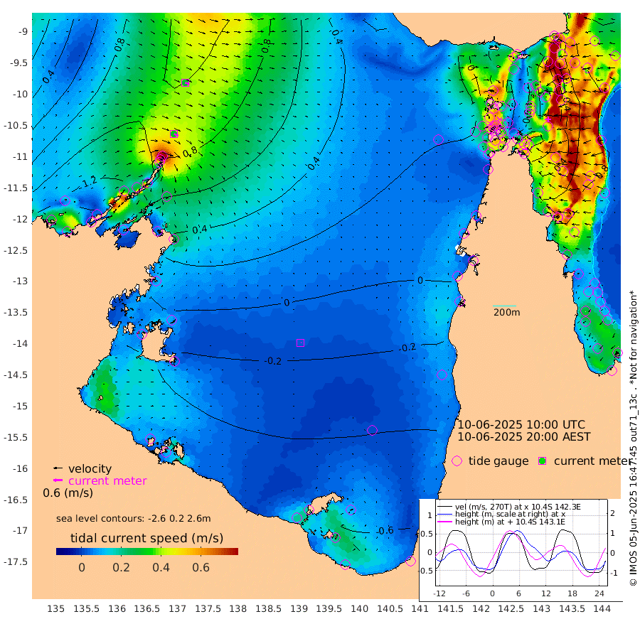 31cm/s 118T +3cm/s rms + 7cm/s -42T. ARA-GOC87 57m 3cm/s 88T +3cm/s rms + 2cm/s -2T. ARA-GOC87 60m 30cm/s 112T +2cm/s rms + 3cm/s 61T. ARA-GOC87 47m 41cm Daru 46cm Bobo Island 69cm Meer Island Barge 76cm Bramble Cay 66cm Unnamed Cay 55cm Pearce Cay 65cm Stephens Island 75cm Merrie England Shoals 48cm Mutacomal Reef 62cm Darnley Island Barge 72cm East Cay 47cm Yorke Island Barge 51cm Rennel Island 36cm Aureed Island 26cm Dungeness Reef -12cm Zagai Island -13cm Yam Island -49cm Dauan Island -50cm Saibai Island -34cm Phipi Reef -24cm Warrior Reef - West -23cm Mabuiag Island Barge 47cm Half Way Island 35cm Coconut Island 34cm Dugong Islet 9cm Poll Island 17cm Kirkcaldie Reef -17cm Suarji Island 5cm Sue Islet 44cm Hawkesbury Island 5cm Alert Patches 1cm Twin Island 26cm Badu Island -14cm St Pauls (Moa Island) 25cm Kubin (Moa Island) 0cm Ince Point 5cm Thursday Island 3cm Nardana Patches 19cm Turtle Head 41cm Round Island 42cm Goods Island 48cm Booby Island 43cm White Rocks Area 37cm Carpentaria -2cm Papou Point 79cm Bampfield Head 42cm Crab Island 36cm Red Wallis Island 29cm Packe Island 37cm Harrington Reef 39cm Herald Camp -18cm Sharp Point 15cm Red Island Point 20cm Possession Island 4cm Alpha Rock 17cm Frederick Point 50cm Wyborn Reef Light 41cm Tetley Island 52cm Triangle Reef 68cm Turtle Head Island 59cm Maclennan Cay 69cm Raine Island 58cm Mcsweeny Reef 62cm Collette Reef 66cm Shadwell Reef 73cm Hannibal Island 81cm Round Point 40cm Vrilya Point 73cm Cape Grenville 71cm Hicks Island 65cm Sir Charles Hardy Island 21cm Harvey Island 80cm Kay Reef 69cm Rocky Island 68cm Chapman Island 66cm Ham Reef 69cm Jubilee Reef 61cm Night Island 67cm Unnamed Reef No. 3 76cm Morris Island 74cm 1st 3 Mile Opening 70cm Creech Reef 66cm Fife Island 89cm Eden Reef 79cm Stanley Island 82cm Normanby River 132cm Yabooma Island 165cm Hutchison River 137cm Elcho Island 121cm North West Crocodile Island 94cm Cape Wessel 131cm Stevens Island 101cm Guluwuru Island 120cm Hopeful Bay 110cm Auster Point 109cm Two Island Bay 135cm Cadell Strait 122cm Mallison Island 87cm Melville Bay (Gove Harbour) 96cm Truant Island 56cm Cape Arnhem 23cm Cape Grey 9cm Hawk Island -32cm Milner Bay (Groote Eylandt) -44cm Cape Beatrice -93cm West Island -88cm Centre Island -96cm Mornington Island -104cm West Wellesley Islands -120cm Bountiful Island -125cm Albert River Mouth -126cm Sweers Island -122cm Karumba -79cm Nassau River Offshore -45cm Christmas Creek 4cm Archer River 13cm Boyd Point 15cm Weipa (Humbug Point) 33cm Pennefather River 25cm Cullen Point