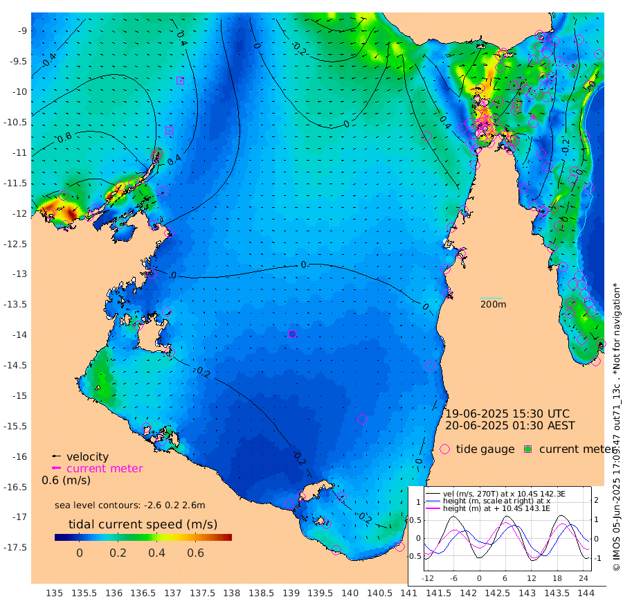 10cm/s 132T +3cm/s rms + 7cm/s -42T. ARA-GOC87 57m 2cm/s -117T +3cm/s rms + 2cm/s -2T. ARA-GOC87 60m 12cm/s 116T +2cm/s rms + 3cm/s 61T. ARA-GOC87 47m -36cm Daru -30cm Bobo Island 0cm Meer Island Barge -17cm Bramble Cay -31cm Unnamed Cay -21cm Pearce Cay -24cm Stephens Island -42cm Merrie England Shoals -43cm Mutacomal Reef -19cm Darnley Island Barge 0cm East Cay -25cm Yorke Island Barge -27cm Rennel Island -24cm Aureed Island -22cm Dungeness Reef -12cm Zagai Island -10cm Yam Island 32cm Dauan Island 25cm Saibai Island 11cm Phipi Reef -7cm Warrior Reef - West 27cm Mabuiag Island Barge -33cm Half Way Island -32cm Coconut Island -29cm Dugong Islet -22cm Poll Island -29cm Kirkcaldie Reef -6cm Suarji Island -21cm Sue Islet 76cm Hawkesbury Island -9cm Alert Patches -10cm Twin Island 64cm Badu Island -6cm St Pauls (Moa Island) 50cm Kubin (Moa Island) 10cm Ince Point 21cm Thursday Island 19cm Nardana Patches 42cm Turtle Head 56cm Round Island 71cm Goods Island 79cm Booby Island 77cm White Rocks Area 50cm Carpentaria 1cm Papou Point 92cm Bampfield Head 55cm Crab Island 69cm Red Wallis Island 48cm Packe Island -39cm Harrington Reef 81cm Herald Camp -14cm Sharp Point 37cm Red Island Point 16cm Possession Island -19cm Alpha Rock -22cm Frederick Point -36cm Wyborn Reef Light -34cm Tetley Island 1cm Triangle Reef -31cm Turtle Head Island 4cm Maclennan Cay 12cm Raine Island -27cm Mcsweeny Reef -25cm Collette Reef -6cm Shadwell Reef -30cm Hannibal Island -17cm Round Point 36cm Vrilya Point -17cm Cape Grenville -2cm Hicks Island 10cm Sir Charles Hardy Island -4cm Harvey Island -8cm Kay Reef 8cm Rocky Island 16cm Chapman Island 14cm Ham Reef 8cm Jubilee Reef -1cm Night Island 9cm Unnamed Reef No. 3 5cm Morris Island 13cm 1st 3 Mile Opening 7cm Creech Reef 2cm Fife Island 11cm Eden Reef 1cm Stanley Island 4cm Normanby River 136cm Yabooma Island 142cm Hutchison River 118cm Elcho Island 114cm North West Crocodile Island 81cm Cape Wessel 95cm Stevens Island 59cm Guluwuru Island 93cm Hopeful Bay 89cm Auster Point 89cm Two Island Bay 110cm Cadell Strait -26cm Mallison Island 56cm Melville Bay (Gove Harbour) 63cm Truant Island 33cm Cape Arnhem 14cm Cape Grey -5cm Hawk Island -26cm Milner Bay (Groote Eylandt) -35cm Cape Beatrice -65cm West Island -68cm Centre Island -66cm Mornington Island -59cm West Wellesley Islands -38cm Bountiful Island -60cm Albert River Mouth -72cm Sweers Island -62cm Karumba -41cm Nassau River Offshore -14cm Christmas Creek 13cm Archer River 29cm Boyd Point 42cm Weipa (Humbug Point) 5cm Pennefather River 44cm Cullen Point