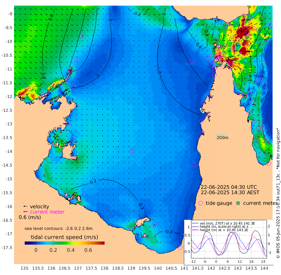 13cm/s 140T +3cm/s rms + 7cm/s -42T. ARA-GOC87 57m 11cm/s -3T +3cm/s rms + 2cm/s -2T. ARA-GOC87 60m 15cm/s 135T +2cm/s rms + 3cm/s 61T. ARA-GOC87 47m -150cm Daru -148cm Bobo Island -99cm Meer Island Barge -126cm Bramble Cay -153cm Unnamed Cay -138cm Pearce Cay -143cm Stephens Island -153cm Merrie England Shoals -157cm Mutacomal Reef -135cm Darnley Island Barge -110cm East Cay -141cm Yorke Island Barge -145cm Rennel Island -140cm Aureed Island -136cm Dungeness Reef -108cm Zagai Island -114cm Yam Island -48cm Dauan Island -55cm Saibai Island -76cm Phipi Reef -109cm Warrior Reef - West -34cm Mabuiag Island Barge -142cm Half Way Island -138cm Coconut Island -147cm Dugong Islet -121cm Poll Island -134cm Kirkcaldie Reef -111cm Suarji Island -121cm Sue Islet 7cm Hawkesbury Island -93cm Alert Patches -98cm Twin Island 11cm Badu Island -90cm St Pauls (Moa Island) -22cm Kubin (Moa Island) -62cm Ince Point -43cm Thursday Island -48cm Nardana Patches -25cm Turtle Head -23cm Round Island 12cm Goods Island 38cm Booby Island 27cm White Rocks Area 33cm Carpentaria -81cm Papou Point 1cm Bampfield Head 41cm Crab Island 33cm Red Wallis Island -11cm Packe Island -157cm Harrington Reef -14cm Herald Camp -28cm Sharp Point -23cm Red Island Point -70cm Possession Island -102cm Alpha Rock -121cm Frederick Point -149cm Wyborn Reef Light -142cm Tetley Island -88cm Triangle Reef -147cm Turtle Head Island -99cm Maclennan Cay -70cm Raine Island -137cm Mcsweeny Reef -131cm Collette Reef -96cm Shadwell Reef -144cm Hannibal Island -127cm Round Point 49cm Vrilya Point -123cm Cape Grenville -113cm Hicks Island -118cm Sir Charles Hardy Island -38cm Harvey Island -110cm Kay Reef -89cm Rocky Island -75cm Chapman Island -76cm Ham Reef -83cm Jubilee Reef -80cm Night Island -76cm Unnamed Reef No. 3 -91cm Morris Island -80cm 1st 3 Mile Opening -85cm Creech Reef -82cm Fife Island -95cm Eden Reef -94cm Stanley Island -105cm Normanby River 76cm Yabooma Island 69cm Hutchison River 77cm Elcho Island 77cm North West Crocodile Island 28cm Cape Wessel 60cm Stevens Island -14cm Guluwuru Island 54cm Hopeful Bay 40cm Auster Point 41cm Two Island Bay 54cm Cadell Strait -67cm Mallison Island 0cm Melville Bay (Gove Harbour) 1cm Truant Island -4cm Cape Arnhem -11cm Cape Grey -11cm Hawk Island 0cm Milner Bay (Groote Eylandt) -4cm Cape Beatrice -11cm West Island -12cm Centre Island -36cm Mornington Island -34cm West Wellesley Islands -44cm Bountiful Island -6cm Albert River Mouth -3cm Sweers Island -15cm Karumba -31cm Nassau River Offshore -33cm Christmas Creek 0cm Archer River 3cm Boyd Point 9cm Weipa (Humbug Point) 30cm Pennefather River 31cm Cullen Point