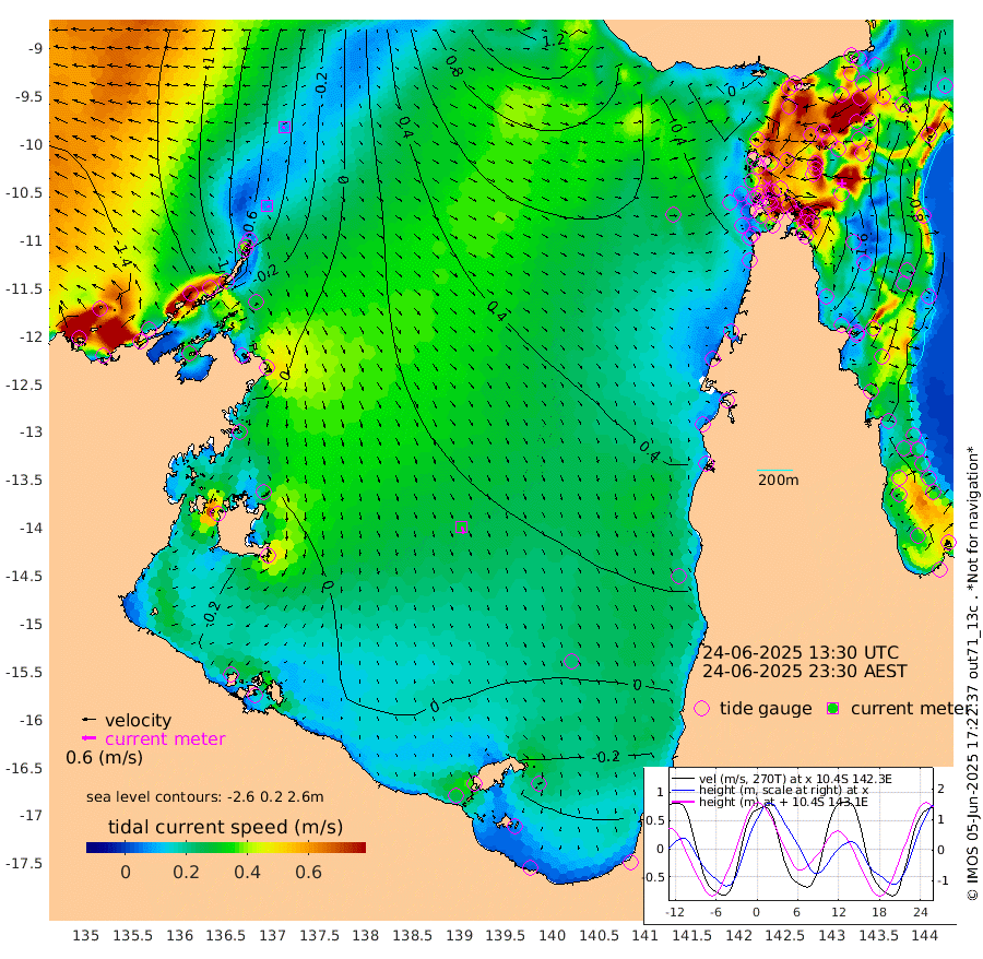 8cm/s 143T +3cm/s rms + 7cm/s -42T. ARA-GOC87 57m 30cm/s 162T +3cm/s rms + 2cm/s -2T. ARA-GOC87 60m 8cm/s -123T +2cm/s rms + 3cm/s 61T. ARA-GOC87 47m 183cm Daru 174cm Bobo Island 94cm Meer Island Barge 124cm Bramble Cay 166cm Unnamed Cay 168cm Pearce Cay 154cm Stephens Island 162cm Merrie England Shoals 185cm Mutacomal Reef 144cm Darnley Island Barge 99cm East Cay 164cm Yorke Island Barge 173cm Rennel Island 171cm Aureed Island 184cm Dungeness Reef 174cm Zagai Island 176cm Yam Island 146cm Dauan Island 135cm Saibai Island 156cm Phipi Reef 180cm Warrior Reef - West 125cm Mabuiag Island Barge 173cm Half Way Island 187cm Coconut Island 188cm Dugong Islet 184cm Poll Island 189cm Kirkcaldie Reef 191cm Suarji Island 179cm Sue Islet 99cm Hawkesbury Island 184cm Alert Patches 184cm Twin Island 105cm Badu Island 184cm St Pauls (Moa Island) 121cm Kubin (Moa Island) 158cm Ince Point 146cm Thursday Island 148cm Nardana Patches 131cm Turtle Head 106cm Round Island 98cm Goods Island 80cm Booby Island 85cm White Rocks Area 72cm Carpentaria 157cm Papou Point 99cm Bampfield Head 62cm Crab Island 84cm Red Wallis Island 115cm Packe Island 202cm Harrington Reef 96cm Herald Camp 52cm Sharp Point 106cm Red Island Point 146cm Possession Island 169cm Alpha Rock 189cm Frederick Point 187cm Wyborn Reef Light 189cm Tetley Island 99cm Triangle Reef 196cm Turtle Head Island 99cm Maclennan Cay 64cm Raine Island 157cm Mcsweeny Reef 142cm Collette Reef 97cm Shadwell Reef 151cm Hannibal Island 127cm Round Point 57cm Vrilya Point 117cm Cape Grenville 106cm Hicks Island 111cm Sir Charles Hardy Island 37cm Harvey Island 95cm Kay Reef 76cm Rocky Island 67cm Chapman Island 65cm Ham Reef 75cm Jubilee Reef 75cm Night Island 69cm Unnamed Reef No. 3 79cm Morris Island 78cm 1st 3 Mile Opening 80cm Creech Reef 75cm Fife Island 77cm Eden Reef 81cm Stanley Island 83cm Normanby River -138cm Yabooma Island -136cm Hutchison River -142cm Elcho Island -145cm North West Crocodile Island -61cm Cape Wessel -112cm Stevens Island -11cm Guluwuru Island -115cm Hopeful Bay -77cm Auster Point -86cm Two Island Bay -97cm Cadell Strait 54cm Mallison Island -28cm Melville Bay (Gove Harbour) -22cm Truant Island -9cm Cape Arnhem -18cm Cape Grey -25cm Hawk Island -49cm Milner Bay (Groote Eylandt) -43cm Cape Beatrice -43cm West Island -41cm Centre Island -33cm Mornington Island -26cm West Wellesley Islands -65cm Bountiful Island -117cm Albert River Mouth -137cm Sweers Island -108cm Karumba -3cm Nassau River Offshore 37cm Christmas Creek 40cm Archer River 55cm Boyd Point 45cm Weipa (Humbug Point) 49cm Pennefather River 52cm Cullen Point