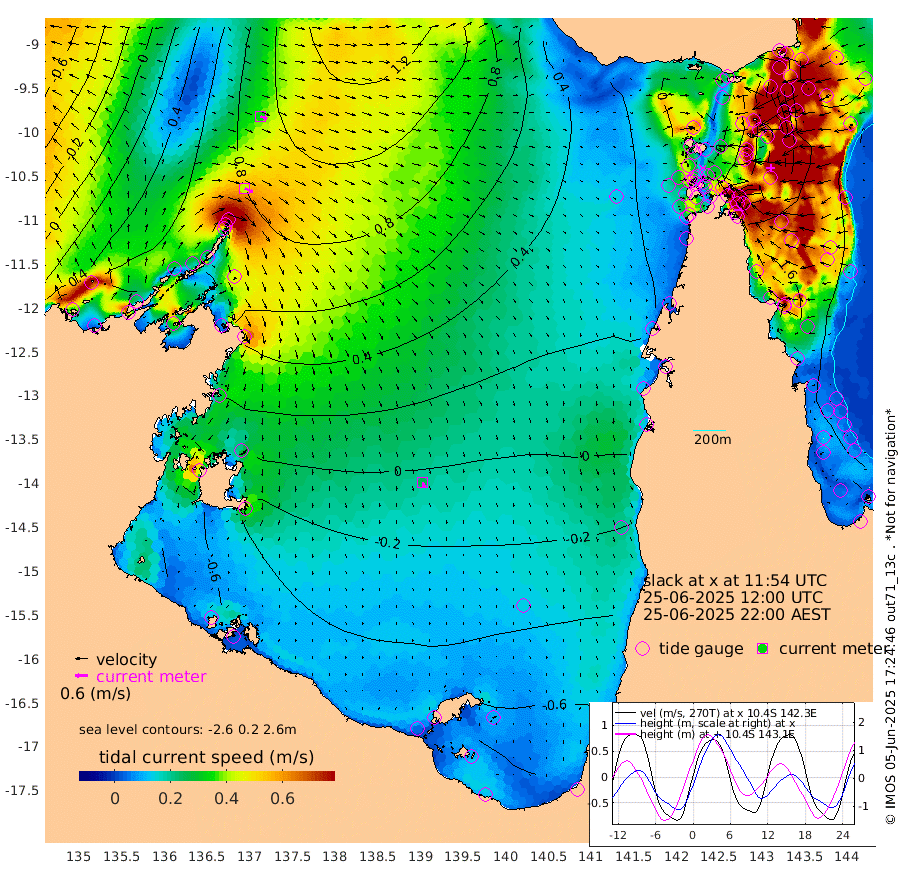 43cm/s 116T +3cm/s rms + 7cm/s -42T. ARA-GOC87 57m 26cm/s 163T +3cm/s rms + 2cm/s -2T. ARA-GOC87 60m 33cm/s 111T +2cm/s rms + 3cm/s 61T. ARA-GOC87 47m 150cm Daru 165cm Bobo Island 141cm Meer Island Barge 162cm Bramble Cay 166cm Unnamed Cay 178cm Pearce Cay 171cm Stephens Island 170cm Merrie England Shoals 155cm Mutacomal Reef 163cm Darnley Island Barge 152cm East Cay 156cm Yorke Island Barge 159cm Rennel Island 157cm Aureed Island 140cm Dungeness Reef 90cm Zagai Island 88cm Yam Island 32cm Dauan Island 27cm Saibai Island 45cm Phipi Reef 86cm Warrior Reef - West 31cm Mabuiag Island Barge 159cm Half Way Island 147cm Coconut Island 153cm Dugong Islet 118cm Poll Island 124cm Kirkcaldie Reef 88cm Suarji Island 106cm Sue Islet 72cm Hawkesbury Island 93cm Alert Patches 99cm Twin Island 61cm Badu Island 81cm St Pauls (Moa Island) 73cm Kubin (Moa Island) 75cm Ince Point 69cm Thursday Island 69cm Nardana Patches 73cm Turtle Head 60cm Round Island 74cm Goods Island 61cm Booby Island 67cm White Rocks Area 46cm Carpentaria 81cm Papou Point 78cm Bampfield Head 45cm Crab Island 60cm Red Wallis Island 75cm Packe Island 162cm Harrington Reef 55cm Herald Camp 6cm Sharp Point 64cm Red Island Point 77cm Possession Island 89cm Alpha Rock 123cm Frederick Point 154cm Wyborn Reef Light 144cm Tetley Island 126cm Triangle Reef 177cm Turtle Head Island 136cm Maclennan Cay 121cm Raine Island 158cm Mcsweeny Reef 152cm Collette Reef 130cm Shadwell Reef 169cm Hannibal Island 168cm Round Point 39cm Vrilya Point 151cm Cape Grenville 148cm Hicks Island 152cm Sir Charles Hardy Island 46cm Harvey Island 148cm Kay Reef 131cm Rocky Island 129cm Chapman Island 123cm Ham Reef 130cm Jubilee Reef 120cm Night Island 128cm Unnamed Reef No. 3 139cm Morris Island 130cm 1st 3 Mile Opening 134cm Creech Reef 132cm Fife Island 160cm Eden Reef 141cm Stanley Island 155cm Normanby River 75cm Yabooma Island 115cm Hutchison River 77cm Elcho Island 62cm North West Crocodile Island 92cm Cape Wessel 85cm Stevens Island 128cm Guluwuru Island 69cm Hopeful Bay 86cm Auster Point 85cm Two Island Bay 128cm Cadell Strait 178cm Mallison Island 96cm Melville Bay (Gove Harbour) 110cm Truant Island 67cm Cape Arnhem 21cm Cape Grey -5cm Hawk Island -67cm Milner Bay (Groote Eylandt) -70cm Cape Beatrice -126cm West Island -124cm Centre Island -111cm Mornington Island -109cm West Wellesley Islands -141cm Bountiful Island -181cm Albert River Mouth -204cm Sweers Island -178cm Karumba -65cm Nassau River Offshore -12cm Christmas Creek 23cm Archer River 36cm Boyd Point 33cm Weipa (Humbug Point) 33cm Pennefather River 29cm Cullen Point
