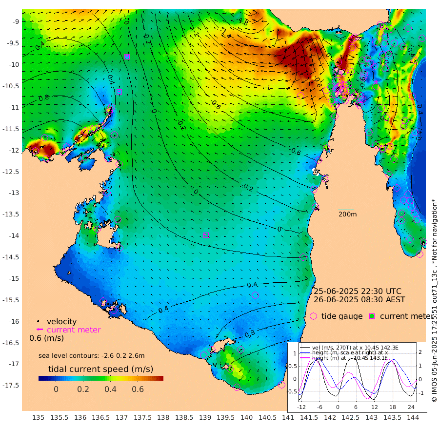 12cm/s -44T +3cm/s rms + 7cm/s -42T. ARA-GOC87 57m 20cm/s -71T +3cm/s rms + 2cm/s -2T. ARA-GOC87 60m 11cm/s -2T +2cm/s rms + 3cm/s 61T. ARA-GOC87 47m -25cm Daru -14cm Bobo Island 22cm Meer Island Barge 22cm Bramble Cay -3cm Unnamed Cay -4cm Pearce Cay 3cm Stephens Island 3cm Merrie England Shoals -20cm Mutacomal Reef 3cm Darnley Island Barge 28cm East Cay -15cm Yorke Island Barge -17cm Rennel Island -15cm Aureed Island -31cm Dungeness Reef -62cm Zagai Island -63cm Yam Island -76cm Dauan Island -80cm Saibai Island -45cm Phipi Reef -56cm Warrior Reef - West -96cm Mabuiag Island Barge -20cm Half Way Island -39cm Coconut Island -33cm Dugong Islet -55cm Poll Island -54cm Kirkcaldie Reef -72cm Suarji Island -65cm Sue Islet -105cm Hawkesbury Island -89cm Alert Patches -85cm Twin Island -99cm Badu Island -96cm St Pauls (Moa Island) -93cm Kubin (Moa Island) -94cm Ince Point -100cm Thursday Island -97cm Nardana Patches -90cm Turtle Head -89cm Round Island -91cm Goods Island -110cm Booby Island -99cm White Rocks Area -135cm Carpentaria -84cm Papou Point -121cm Bampfield Head -96cm Crab Island -106cm Red Wallis Island -86cm Packe Island -42cm Harrington Reef -93cm Herald Camp -29cm Sharp Point -79cm Red Island Point -84cm Possession Island -78cm Alpha Rock -67cm Frederick Point -38cm Wyborn Reef Light -48cm Tetley Island 7cm Triangle Reef -50cm Turtle Head Island 15cm Maclennan Cay 27cm Raine Island -9cm Mcsweeny Reef 1cm Collette Reef 15cm Shadwell Reef 9cm Hannibal Island 21cm Round Point -109cm Vrilya Point 19cm Cape Grenville 22cm Hicks Island 22cm Sir Charles Hardy Island 5cm Harvey Island 29cm Kay Reef 32cm Rocky Island 34cm Chapman Island 27cm Ham Reef 25cm Jubilee Reef 25cm Night Island 28cm Unnamed Reef No. 3 33cm Morris Island 22cm 1st 3 Mile Opening 26cm Creech Reef 29cm Fife Island 48cm Eden Reef 32cm Stanley Island 42cm Normanby River 106cm Yabooma Island 128cm Hutchison River 114cm Elcho Island 114cm North West Crocodile Island 40cm Cape Wessel 87cm Stevens Island 38cm Guluwuru Island 94cm Hopeful Bay 54cm Auster Point 56cm Two Island Bay 91cm Cadell Strait 6cm Mallison Island 45cm Melville Bay (Gove Harbour) 33cm Truant Island 24cm Cape Arnhem 31cm Cape Grey 47cm Hawk Island 48cm Milner Bay (Groote Eylandt) 56cm Cape Beatrice 49cm West Island 49cm Centre Island 120cm Mornington Island 111cm West Wellesley Islands 174cm Bountiful Island 221cm Albert River Mouth 224cm Sweers Island 213cm Karumba 102cm Nassau River Offshore 53cm Christmas Creek -1cm Archer River -41cm Boyd Point -21cm Weipa (Humbug Point) -66cm Pennefather River -82cm Cullen Point