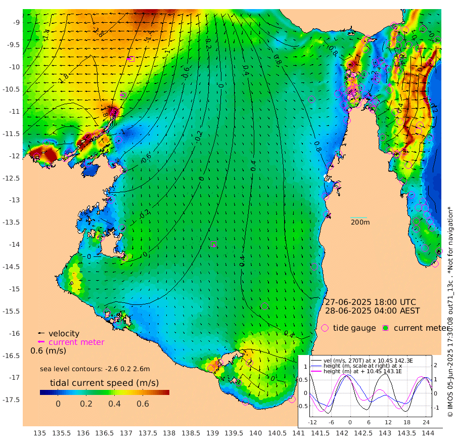 37cm/s -88T +3cm/s rms + 7cm/s -42T. ARA-GOC87 57m 34cm/s 170T +3cm/s rms + 2cm/s -2T. ARA-GOC87 60m 48cm/s -95T +2cm/s rms + 3cm/s 61T. ARA-GOC87 47m 62cm Daru 38cm Bobo Island -1cm Meer Island Barge 0cm Bramble Cay 29cm Unnamed Cay 26cm Pearce Cay 23cm Stephens Island 21cm Merrie England Shoals 51cm Mutacomal Reef 22cm Darnley Island Barge -1cm East Cay 41cm Yorke Island Barge 46cm Rennel Island 43cm Aureed Island 72cm Dungeness Reef 99cm Zagai Island 112cm Yam Island 147cm Dauan Island 137cm Saibai Island 139cm Phipi Reef 120cm Warrior Reef - West 122cm Mabuiag Island Barge 47cm Half Way Island 64cm Coconut Island 65cm Dugong Islet 86cm Poll Island 98cm Kirkcaldie Reef 112cm Suarji Island 94cm Sue Islet 118cm Hawkesbury Island 118cm Alert Patches 112cm Twin Island 117cm Badu Island 126cm St Pauls (Moa Island) 115cm Kubin (Moa Island) 121cm Ince Point 123cm Thursday Island 122cm Nardana Patches 122cm Turtle Head 108cm Round Island 109cm Goods Island 113cm Booby Island 99cm White Rocks Area 104cm Carpentaria 103cm Papou Point 104cm Bampfield Head 105cm Crab Island 114cm Red Wallis Island 119cm Packe Island 67cm Harrington Reef 135cm Herald Camp 46cm Sharp Point 111cm Red Island Point 104cm Possession Island 95cm Alpha Rock 93cm Frederick Point 51cm Wyborn Reef Light 61cm Tetley Island 12cm Triangle Reef 50cm Turtle Head Island 11cm Maclennan Cay -6cm Raine Island 32cm Mcsweeny Reef 23cm Collette Reef 8cm Shadwell Reef 16cm Hannibal Island 0cm Round Point 104cm Vrilya Point 7cm Cape Grenville 6cm Hicks Island 15cm Sir Charles Hardy Island 5cm Harvey Island -6cm Kay Reef -5cm Rocky Island -12cm Chapman Island -6cm Ham Reef -4cm Jubilee Reef 0cm Night Island -5cm Unnamed Reef No. 3 -9cm Morris Island -2cm 1st 3 Mile Opening -2cm Creech Reef -3cm Fife Island -25cm Eden Reef -8cm Stanley Island -19cm Normanby River -241cm Yabooma Island -281cm Hutchison River -253cm Elcho Island -238cm North West Crocodile Island -174cm Cape Wessel -236cm Stevens Island -148cm Guluwuru Island -219cm Hopeful Bay -192cm Auster Point -190cm Two Island Bay -232cm Cadell Strait -115cm Mallison Island -143cm Melville Bay (Gove Harbour) -149cm Truant Island -93cm Cape Arnhem -70cm Cape Grey -62cm Hawk Island -51cm Milner Bay (Groote Eylandt) -31cm Cape Beatrice 10cm West Island 8cm Centre Island 29cm Mornington Island 29cm West Wellesley Islands 13cm Bountiful Island -35cm Albert River Mouth -60cm Sweers Island -8cm Karumba 67cm Nassau River Offshore 95cm Christmas Creek 81cm Archer River 90cm Boyd Point 88cm Weipa (Humbug Point) 80cm Pennefather River 103cm Cullen Point