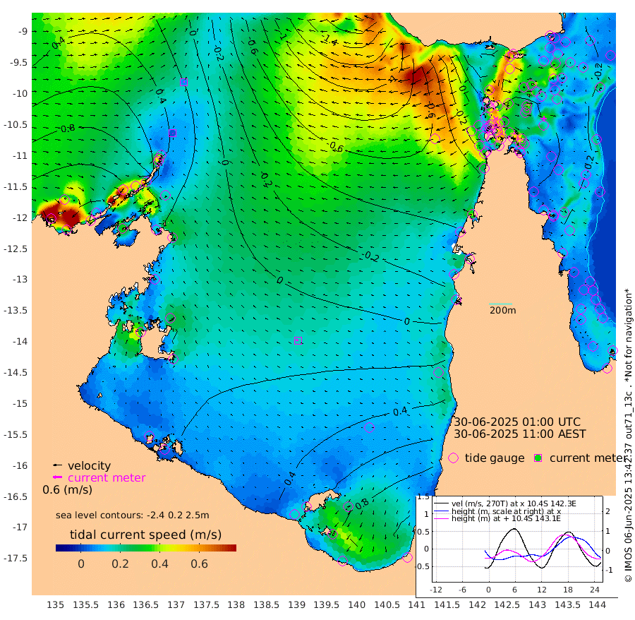 2cm/s 139T +3cm/s rms + 7cm/s -42T. ARA-GOC87 57m 17cm/s -73T +3cm/s rms + 2cm/s -2T. ARA-GOC87 60m 7cm/s 74T +2cm/s rms + 3cm/s 61T. ARA-GOC87 47m -41cm Daru -39cm Bobo Island -22cm Meer Island Barge -20cm Bramble Cay -35cm Unnamed Cay -28cm Pearce Cay -37cm Stephens Island -30cm Merrie England Shoals -37cm Mutacomal Reef -37cm Darnley Island Barge -22cm East Cay -42cm Yorke Island Barge -41cm Rennel Island -40cm Aureed Island -37cm Dungeness Reef -45cm Zagai Island -49cm Yam Island -23cm Dauan Island -35cm Saibai Island 0cm Phipi Reef -37cm Warrior Reef - West -39cm Mabuiag Island Barge -43cm Half Way Island -45cm Coconut Island -50cm Dugong Islet -45cm Poll Island -50cm Kirkcaldie Reef -49cm Suarji Island -54cm Sue Islet -40cm Hawkesbury Island -50cm Alert Patches -55cm Twin Island -22cm Badu Island -56cm St Pauls (Moa Island) -45cm Kubin (Moa Island) -50cm Ince Point -49cm Thursday Island -48cm Nardana Patches -36cm Turtle Head -49cm Round Island -32cm Goods Island -44cm Booby Island -37cm White Rocks Area -91cm Carpentaria -54cm Papou Point -81cm Bampfield Head -35cm Crab Island -44cm Red Wallis Island -39cm Packe Island -57cm Harrington Reef -63cm Herald Camp -16cm Sharp Point -30cm Red Island Point -54cm Possession Island -58cm Alpha Rock -55cm Frederick Point -49cm Wyborn Reef Light -52cm Tetley Island -22cm Triangle Reef -57cm Turtle Head Island -28cm Maclennan Cay -11cm Raine Island -37cm Mcsweeny Reef -30cm Collette Reef -19cm Shadwell Reef -29cm Hannibal Island -20cm Round Point -44cm Vrilya Point -26cm Cape Grenville -24cm Hicks Island -32cm Sir Charles Hardy Island -10cm Harvey Island -20cm Kay Reef -14cm Rocky Island -7cm Chapman Island -18cm Ham Reef -17cm Jubilee Reef -16cm Night Island -15cm Unnamed Reef No. 3 -15cm Morris Island -18cm 1st 3 Mile Opening -19cm Creech Reef -18cm Fife Island -9cm Eden Reef -18cm Stanley Island -16cm Normanby River 101cm Yabooma Island 118cm Hutchison River 106cm Elcho Island 109cm North West Crocodile Island 21cm Cape Wessel 85cm Stevens Island 13cm Guluwuru Island 82cm Hopeful Bay 45cm Auster Point 38cm Two Island Bay 86cm Cadell Strait -28cm Mallison Island 26cm Melville Bay (Gove Harbour) 14cm Truant Island 9cm Cape Arnhem 19cm Cape Grey 32cm Hawk Island 36cm Milner Bay (Groote Eylandt) 43cm Cape Beatrice 34cm West Island 35cm Centre Island 93cm Mornington Island 89cm West Wellesley Islands 137cm Bountiful Island 193cm Albert River Mouth 196cm Sweers Island 184cm Karumba 89cm Nassau River Offshore 49cm Christmas Creek 19cm Archer River -19cm Boyd Point 1cm Weipa (Humbug Point) -15cm Pennefather River -42cm Cullen Point