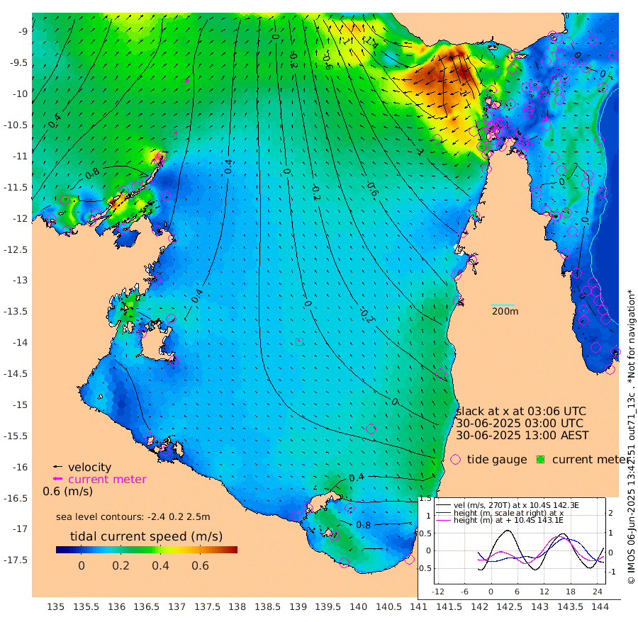 24cm/s 76T +3cm/s rms + 7cm/s -42T. ARA-GOC87 57m 16cm/s -42T +3cm/s rms + 2cm/s -2T. ARA-GOC87 60m 31cm/s 64T +2cm/s rms + 3cm/s 61T. ARA-GOC87 47m -11cm Daru -1cm Bobo Island -3cm Meer Island Barge 2cm Bramble Cay -11cm Unnamed Cay 4cm Pearce Cay -7cm Stephens Island -7cm Merrie England Shoals -15cm Mutacomal Reef -4cm Darnley Island Barge -4cm East Cay -9cm Yorke Island Barge -16cm Rennel Island -2cm Aureed Island -20cm Dungeness Reef -27cm Zagai Island -48cm Yam Island -41cm Dauan Island -43cm Saibai Island -29cm Phipi Reef -25cm Warrior Reef - West -72cm Mabuiag Island Barge -20cm Half Way Island -20cm Coconut Island -28cm Dugong Islet -32cm Poll Island -45cm Kirkcaldie Reef -46cm Suarji Island -37cm Sue Islet -148cm Hawkesbury Island -66cm Alert Patches -63cm Twin Island -112cm Badu Island -65cm St Pauls (Moa Island) -117cm Kubin (Moa Island) -82cm Ince Point -97cm Thursday Island -92cm Nardana Patches -105cm Turtle Head -132cm Round Island -132cm Goods Island -158cm Booby Island -144cm White Rocks Area -167cm Carpentaria -66cm Papou Point -182cm Bampfield Head -134cm Crab Island -150cm Red Wallis Island -125cm Packe Island -28cm Harrington Reef -172cm Herald Camp -16cm Sharp Point -100cm Red Island Point -90cm Possession Island -55cm Alpha Rock -46cm Frederick Point -20cm Wyborn Reef Light -26cm Tetley Island -7cm Triangle Reef -31cm Turtle Head Island -14cm Maclennan Cay -5cm Raine Island -7cm Mcsweeny Reef -4cm Collette Reef -5cm Shadwell Reef -1cm Hannibal Island 1cm Round Point -136cm Vrilya Point -10cm Cape Grenville -8cm Hicks Island -17cm Sir Charles Hardy Island -4cm Harvey Island -8cm Kay Reef -4cm Rocky Island 1cm Chapman Island -8cm Ham Reef -6cm Jubilee Reef -4cm Night Island -6cm Unnamed Reef No. 3 -4cm Morris Island -11cm 1st 3 Mile Opening -9cm Creech Reef 7cm Fife Island 3cm Eden Reef -8cm Stanley Island -2cm Normanby River 83cm Yabooma Island 108cm Hutchison River 95cm Elcho Island 89cm North West Crocodile Island 68cm Cape Wessel 101cm Stevens Island 85cm Guluwuru Island 90cm Hopeful Bay 75cm Auster Point 66cm Two Island Bay 122cm Cadell Strait 143cm Mallison Island 85cm Melville Bay (Gove Harbour) 81cm Truant Island 63cm Cape Arnhem 59cm Cape Grey 63cm Hawk Island 63cm Milner Bay (Groote Eylandt) 59cm Cape Beatrice 46cm West Island 42cm Centre Island 89cm Mornington Island 90cm West Wellesley Islands 118cm Bountiful Island 172cm Albert River Mouth 195cm Sweers Island 151cm Karumba 55cm Nassau River Offshore 2cm Christmas Creek -42cm Archer River -74cm Boyd Point -72cm Weipa (Humbug Point) -79cm Pennefather River -125cm Cullen Point