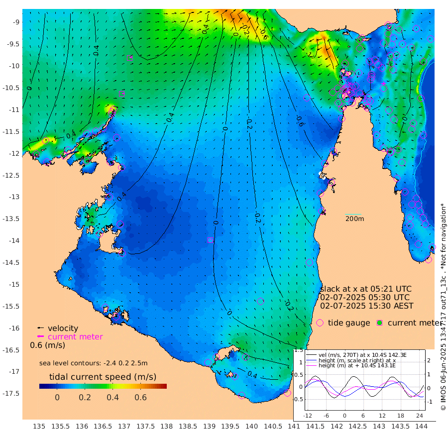25cm/s 80T +3cm/s rms + 7cm/s -42T. ARA-GOC87 57m 9cm/s -6T +3cm/s rms + 2cm/s -2T. ARA-GOC87 60m 28cm/s 70T +2cm/s rms + 3cm/s 61T. ARA-GOC87 47m -20cm Daru -8cm Bobo Island 1cm Meer Island Barge -3cm Bramble Cay -19cm Unnamed Cay -8cm Pearce Cay -11cm Stephens Island -15cm Merrie England Shoals -29cm Mutacomal Reef -4cm Darnley Island Barge -1cm East Cay -12cm Yorke Island Barge -24cm Rennel Island -10cm Aureed Island -35cm Dungeness Reef -37cm Zagai Island -62cm Yam Island -59cm Dauan Island -48cm Saibai Island -57cm Phipi Reef -42cm Warrior Reef - West -72cm Mabuiag Island Barge -29cm Half Way Island -26cm Coconut Island -38cm Dugong Islet -45cm Poll Island -54cm Kirkcaldie Reef -60cm Suarji Island -40cm Sue Islet -138cm Hawkesbury Island -70cm Alert Patches -69cm Twin Island -107cm Badu Island -72cm St Pauls (Moa Island) -116cm Kubin (Moa Island) -84cm Ince Point -95cm Thursday Island -92cm Nardana Patches -104cm Turtle Head -124cm Round Island -123cm Goods Island -135cm Booby Island -132cm White Rocks Area -113cm Carpentaria -69cm Papou Point -144cm Bampfield Head -110cm Crab Island -132cm Red Wallis Island -123cm Packe Island -35cm Harrington Reef -157cm Herald Camp -18cm Sharp Point -94cm Red Island Point -86cm Possession Island -58cm Alpha Rock -51cm Frederick Point -27cm Wyborn Reef Light -33cm Tetley Island -6cm Triangle Reef -33cm Turtle Head Island -11cm Maclennan Cay 2cm Raine Island -10cm Mcsweeny Reef -6cm Collette Reef -1cm Shadwell Reef -4cm Hannibal Island -4cm Round Point -101cm Vrilya Point -10cm Cape Grenville -7cm Hicks Island -14cm Sir Charles Hardy Island -4cm Harvey Island -3cm Kay Reef 0cm Rocky Island 6cm Chapman Island 2cm Ham Reef 1cm Jubilee Reef -1cm Night Island 3cm Unnamed Reef No. 3 1cm Morris Island -4cm 1st 3 Mile Opening -1cm Creech Reef 15cm Fife Island 6cm Eden Reef -2cm Stanley Island 0cm Normanby River 19cm Yabooma Island 40cm Hutchison River 36cm Elcho Island 26cm North West Crocodile Island 52cm Cape Wessel 53cm Stevens Island 77cm Guluwuru Island 46cm Hopeful Bay 46cm Auster Point 37cm Two Island Bay 74cm Cadell Strait 182cm Mallison Island 70cm Melville Bay (Gove Harbour) 72cm Truant Island 58cm Cape Arnhem 51cm Cape Grey 44cm Hawk Island 41cm Milner Bay (Groote Eylandt) 34cm Cape Beatrice 22cm West Island 19cm Centre Island 36cm Mornington Island 35cm West Wellesley Islands 39cm Bountiful Island 65cm Albert River Mouth 93cm Sweers Island 52cm Karumba 4cm Nassau River Offshore -25cm Christmas Creek -42cm Archer River -59cm Boyd Point -67cm Weipa (Humbug Point) -56cm Pennefather River -99cm Cullen Point