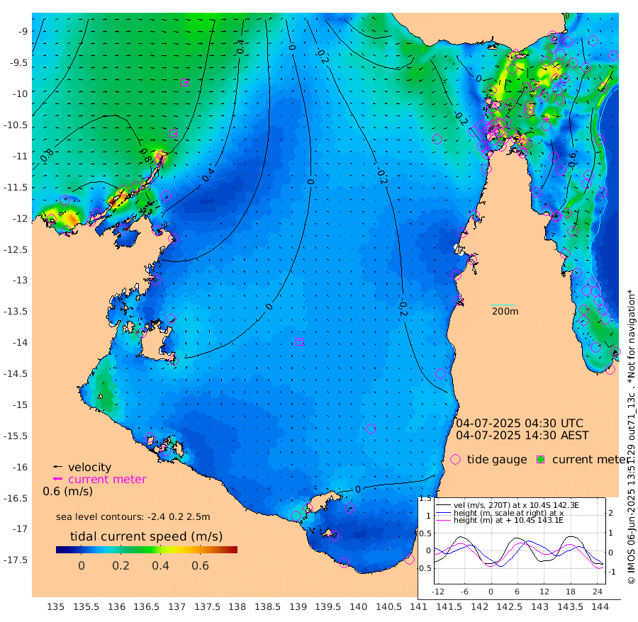 23cm/s 105T +3cm/s rms + 7cm/s -42T. ARA-GOC87 57m 9cm/s -19T +3cm/s rms + 2cm/s -2T. ARA-GOC87 60m 24cm/s 92T +2cm/s rms + 3cm/s 61T. ARA-GOC87 47m -65cm Daru -66cm Bobo Island -39cm Meer Island Barge -49cm Bramble Cay -65cm Unnamed Cay -61cm Pearce Cay -63cm Stephens Island -63cm Merrie England Shoals -72cm Mutacomal Reef -56cm Darnley Island Barge -47cm East Cay -62cm Yorke Island Barge -69cm Rennel Island -69cm Aureed Island -68cm Dungeness Reef -59cm Zagai Island -72cm Yam Island -32cm Dauan Island -36cm Saibai Island -33cm Phipi Reef -60cm Warrior Reef - West -35cm Mabuiag Island Barge -71cm Half Way Island -70cm Coconut Island -79cm Dugong Islet -70cm Poll Island -76cm Kirkcaldie Reef -76cm Suarji Island -64cm Sue Islet -32cm Hawkesbury Island -63cm Alert Patches -70cm Twin Island -21cm Badu Island -66cm St Pauls (Moa Island) -46cm Kubin (Moa Island) -58cm Ince Point -54cm Thursday Island -54cm Nardana Patches -46cm Turtle Head -41cm Round Island -35cm Goods Island -33cm Booby Island -41cm White Rocks Area -50cm Carpentaria -62cm Papou Point -46cm Bampfield Head -21cm Crab Island -42cm Red Wallis Island -51cm Packe Island -85cm Harrington Reef -55cm Herald Camp -20cm Sharp Point -40cm Red Island Point -54cm Possession Island -68cm Alpha Rock -73cm Frederick Point -67cm Wyborn Reef Light -68cm Tetley Island -40cm Triangle Reef -63cm Turtle Head Island -49cm Maclennan Cay -27cm Raine Island -59cm Mcsweeny Reef -53cm Collette Reef -35cm Shadwell Reef -57cm Hannibal Island -50cm Round Point -18cm Vrilya Point -54cm Cape Grenville -47cm Hicks Island -58cm Sir Charles Hardy Island -17cm Harvey Island -46cm Kay Reef -36cm Rocky Island -30cm Chapman Island -33cm Ham Reef -33cm Jubilee Reef -35cm Night Island -35cm Unnamed Reef No. 3 -37cm Morris Island -33cm 1st 3 Mile Opening -37cm Creech Reef -31cm Fife Island -37cm Eden Reef -39cm Stanley Island -45cm Normanby River 102cm Yabooma Island 114cm Hutchison River 104cm Elcho Island 99cm North West Crocodile Island 57cm Cape Wessel 103cm Stevens Island 54cm Guluwuru Island 94cm Hopeful Bay 77cm Auster Point 75cm Two Island Bay 114cm Cadell Strait 82cm Mallison Island 60cm Melville Bay (Gove Harbour) 60cm Truant Island 39cm Cape Arnhem 31cm Cape Grey 27cm Hawk Island 18cm Milner Bay (Groote Eylandt) 8cm Cape Beatrice -15cm West Island -17cm Centre Island -6cm Mornington Island -11cm West Wellesley Islands 2cm Bountiful Island 32cm Albert River Mouth 56cm Sweers Island 30cm Karumba -13cm Nassau River Offshore -26cm Christmas Creek -14cm Archer River -24cm Boyd Point -20cm Weipa (Humbug Point) -2cm Pennefather River -28cm Cullen Point