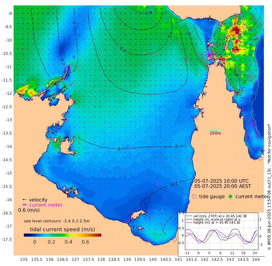 7cm/s 115T +3cm/s rms + 7cm/s -42T. ARA-GOC87 57m 9cm/s 128T +3cm/s rms + 2cm/s -2T. ARA-GOC87 60m 5cm/s 129T +2cm/s rms + 3cm/s 61T. ARA-GOC87 47m 61cm Daru 76cm Bobo Island 64cm Meer Island Barge 74cm Bramble Cay 74cm Unnamed Cay 78cm Pearce Cay 76cm Stephens Island 81cm Merrie England Shoals 69cm Mutacomal Reef 75cm Darnley Island Barge 71cm East Cay 70cm Yorke Island Barge 69cm Rennel Island 74cm Aureed Island 54cm Dungeness Reef 29cm Zagai Island 21cm Yam Island -26cm Dauan Island -9cm Saibai Island -9cm Phipi Reef 19cm Warrior Reef - West -3cm Mabuiag Island Barge 66cm Half Way Island 69cm Coconut Island 62cm Dugong Islet 44cm Poll Island 47cm Kirkcaldie Reef 38cm Suarji Island 45cm Sue Islet 1cm Hawkesbury Island 38cm Alert Patches 37cm Twin Island -1cm Badu Island 23cm St Pauls (Moa Island) 1cm Kubin (Moa Island) 20cm Ince Point 16cm Thursday Island 15cm Nardana Patches 11cm Turtle Head 5cm Round Island 7cm Goods Island 8cm Booby Island 10cm White Rocks Area 34cm Carpentaria 26cm Papou Point 28cm Bampfield Head 3cm Crab Island 7cm Red Wallis Island 6cm Packe Island 76cm Harrington Reef -6cm Herald Camp 2cm Sharp Point 16cm Red Island Point 29cm Possession Island 37cm Alpha Rock 53cm Frederick Point 69cm Wyborn Reef Light 63cm Tetley Island 58cm Triangle Reef 75cm Turtle Head Island 62cm Maclennan Cay 55cm Raine Island 73cm Mcsweeny Reef 73cm Collette Reef 61cm Shadwell Reef 81cm Hannibal Island 78cm Round Point 11cm Vrilya Point 74cm Cape Grenville 66cm Hicks Island 68cm Sir Charles Hardy Island 21cm Harvey Island 76cm Kay Reef 62cm Rocky Island 64cm Chapman Island 61cm Ham Reef 61cm Jubilee Reef 56cm Night Island 65cm Unnamed Reef No. 3 66cm Morris Island 58cm 1st 3 Mile Opening 64cm Creech Reef 60cm Fife Island 74cm Eden Reef 67cm Stanley Island 72cm Normanby River -65cm Yabooma Island -51cm Hutchison River -51cm Elcho Island -59cm North West Crocodile Island -6cm Cape Wessel -41cm Stevens Island 12cm Guluwuru Island -35cm Hopeful Bay -19cm Auster Point -33cm Two Island Bay -41cm Cadell Strait 53cm Mallison Island 0cm Melville Bay (Gove Harbour) 4cm Truant Island 5cm Cape Arnhem 2cm Cape Grey -4cm Hawk Island -18cm Milner Bay (Groote Eylandt) -19cm Cape Beatrice -22cm West Island -16cm Centre Island -33cm Mornington Island -33cm West Wellesley Islands -56cm Bountiful Island -89cm Albert River Mouth -80cm Sweers Island -84cm Karumba -32cm Nassau River Offshore -13cm Christmas Creek 7cm Archer River 12cm Boyd Point 2cm Weipa (Humbug Point) 15cm Pennefather River 3cm Cullen Point