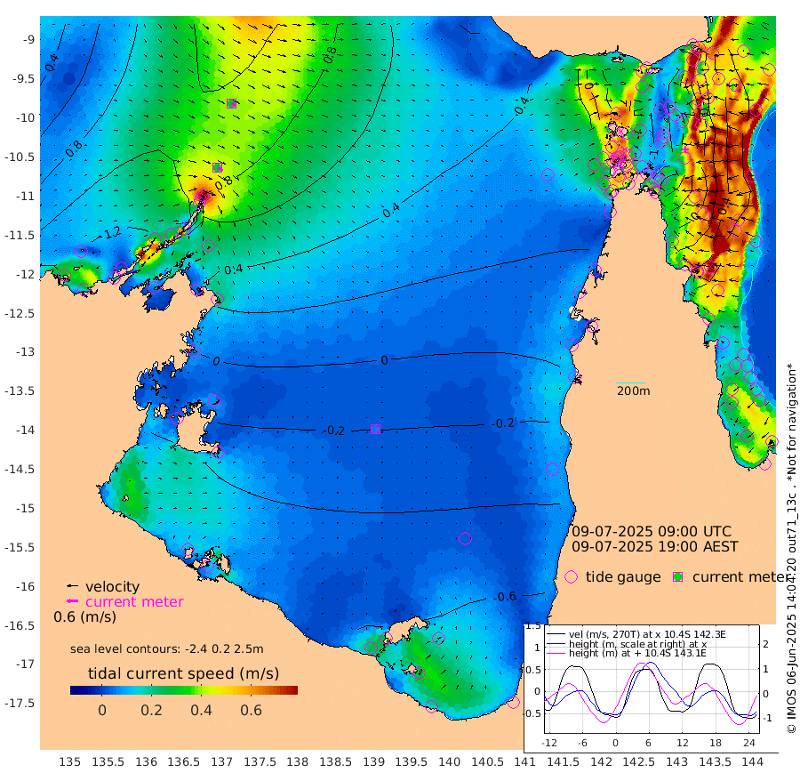 31cm/s 122T +3cm/s rms + 7cm/s -42T. ARA-GOC87 57m 6cm/s 107T +3cm/s rms + 2cm/s -2T. ARA-GOC87 60m 29cm/s 119T +2cm/s rms + 3cm/s 61T. ARA-GOC87 47m -7cm Daru -1cm Bobo Island 53cm Meer Island Barge 45cm Bramble Cay 25cm Unnamed Cay 12cm Pearce Cay 30cm Stephens Island 33cm Merrie England Shoals -1cm Mutacomal Reef 33cm Darnley Island Barge 49cm East Cay 11cm Yorke Island Barge 8cm Rennel Island -5cm Aureed Island -17cm Dungeness Reef -54cm Zagai Island -53cm Yam Island -79cm Dauan Island -80cm Saibai Island -79cm Phipi Reef -69cm Warrior Reef - West -49cm Mabuiag Island Barge 11cm Half Way Island -14cm Coconut Island -5cm Dugong Islet -34cm Poll Island -26cm Kirkcaldie Reef -63cm Suarji Island -36cm Sue Islet 33cm Hawkesbury Island -36cm Alert Patches -40cm Twin Island 10cm Badu Island -53cm St Pauls (Moa Island) 9cm Kubin (Moa Island) -30cm Ince Point -18cm Thursday Island -22cm Nardana Patches 0cm Turtle Head 22cm Round Island 38cm Goods Island 56cm Booby Island 44cm White Rocks Area 59cm Carpentaria -37cm Papou Point 74cm Bampfield Head 46cm Crab Island 40cm Red Wallis Island 18cm Packe Island -11cm Harrington Reef 33cm Herald Camp -30cm Sharp Point -8cm Red Island Point -14cm Possession Island -34cm Alpha Rock -29cm Frederick Point -1cm Wyborn Reef Light -10cm Tetley Island 32cm Triangle Reef 21cm Turtle Head Island 43cm Maclennan Cay 59cm Raine Island 20cm Mcsweeny Reef 28cm Collette Reef 46cm Shadwell Reef 36cm Hannibal Island 47cm Round Point 52cm Vrilya Point 47cm Cape Grenville 48cm Hicks Island 47cm Sir Charles Hardy Island 13cm Harvey Island 59cm Kay Reef 55cm Rocky Island 54cm Chapman Island 56cm Ham Reef 58cm Jubilee Reef 49cm Night Island 55cm Unnamed Reef No. 3 62cm Morris Island 66cm 1st 3 Mile Opening 59cm Creech Reef 49cm Fife Island 79cm Eden Reef 67cm Stanley Island 66cm Normanby River 124cm Yabooma Island 149cm Hutchison River 128cm Elcho Island 112cm North West Crocodile Island 88cm Cape Wessel 117cm Stevens Island 92cm Guluwuru Island 108cm Hopeful Bay 100cm Auster Point 106cm Two Island Bay 122cm Cadell Strait 105cm Mallison Island 76cm Melville Bay (Gove Harbour) 86cm Truant Island 48cm Cape Arnhem 15cm Cape Grey -3cm Hawk Island -36cm Milner Bay (Groote Eylandt) -47cm Cape Beatrice -90cm West Island -88cm Centre Island -112cm Mornington Island -115cm West Wellesley Islands -137cm Bountiful Island -142cm Albert River Mouth -149cm Sweers Island -147cm Karumba -91cm Nassau River Offshore -53cm Christmas Creek 1cm Archer River 17cm Boyd Point 19cm Weipa (Humbug Point) 37cm Pennefather River 35cm Cullen Point