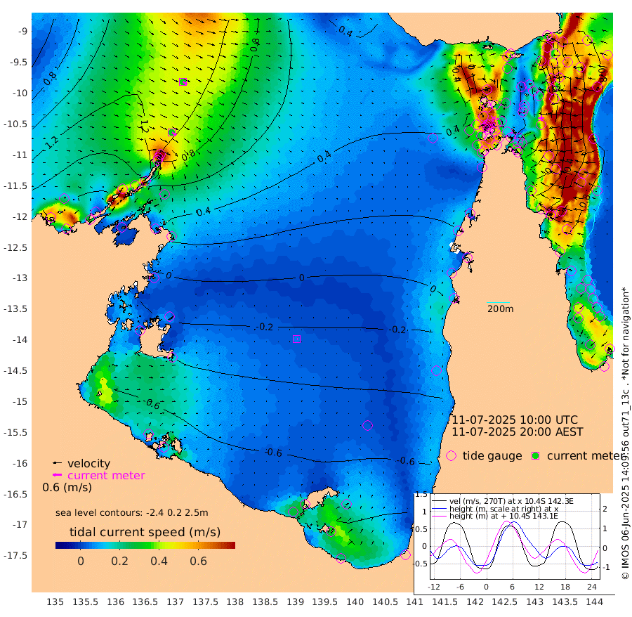 34cm/s 125T +3cm/s rms + 7cm/s -42T. ARA-GOC87 57m 5cm/s 101T +3cm/s rms + 2cm/s -2T. ARA-GOC87 60m 33cm/s 124T +2cm/s rms + 3cm/s 61T. ARA-GOC87 47m -6cm Daru 5cm Bobo Island 62cm Meer Island Barge 53cm Bramble Cay 31cm Unnamed Cay 25cm Pearce Cay 40cm Stephens Island 37cm Merrie England Shoals 2cm Mutacomal Reef 40cm Darnley Island Barge 60cm East Cay 17cm Yorke Island Barge 17cm Rennel Island 4cm Aureed Island -8cm Dungeness Reef -54cm Zagai Island -47cm Yam Island -81cm Dauan Island -86cm Saibai Island -85cm Phipi Reef -69cm Warrior Reef - West -46cm Mabuiag Island Barge 22cm Half Way Island -9cm Coconut Island 8cm Dugong Islet -27cm Poll Island -18cm Kirkcaldie Reef -54cm Suarji Island -34cm Sue Islet 57cm Hawkesbury Island -30cm Alert Patches -30cm Twin Island 30cm Badu Island -46cm St Pauls (Moa Island) 30cm Kubin (Moa Island) -18cm Ince Point -4cm Thursday Island -9cm Nardana Patches 19cm Turtle Head 34cm Round Island 66cm Goods Island 86cm Booby Island 79cm White Rocks Area 82cm Carpentaria -26cm Papou Point 95cm Bampfield Head 66cm Crab Island 71cm Red Wallis Island 40cm Packe Island 0cm Harrington Reef 52cm Herald Camp -33cm Sharp Point 10cm Red Island Point -6cm Possession Island -31cm Alpha Rock -21cm Frederick Point 1cm Wyborn Reef Light -9cm Tetley Island 39cm Triangle Reef 30cm Turtle Head Island 56cm Maclennan Cay 69cm Raine Island 26cm Mcsweeny Reef 31cm Collette Reef 50cm Shadwell Reef 41cm Hannibal Island 55cm Round Point 69cm Vrilya Point 55cm Cape Grenville 58cm Hicks Island 60cm Sir Charles Hardy Island 16cm Harvey Island 67cm Kay Reef 64cm Rocky Island 63cm Chapman Island 65cm Ham Reef 68cm Jubilee Reef 57cm Night Island 65cm Unnamed Reef No. 3 72cm Morris Island 78cm 1st 3 Mile Opening 71cm Creech Reef 57cm Fife Island 93cm Eden Reef 77cm Stanley Island 81cm Normanby River 164cm Yabooma Island 192cm Hutchison River 164cm Elcho Island 149cm North West Crocodile Island 109cm Cape Wessel 140cm Stevens Island 102cm Guluwuru Island 126cm Hopeful Bay 122cm Auster Point 129cm Two Island Bay 151cm Cadell Strait 47cm Mallison Island 83cm Melville Bay (Gove Harbour) 94cm Truant Island 49cm Cape Arnhem 13cm Cape Grey -13cm Hawk Island -44cm Milner Bay (Groote Eylandt) -54cm Cape Beatrice -102cm West Island -101cm Centre Island -133cm Mornington Island -130cm West Wellesley Islands -153cm Bountiful Island -159cm Albert River Mouth -181cm Sweers Island -172cm Karumba -103cm Nassau River Offshore -58cm Christmas Creek 4cm Archer River 25cm Boyd Point 30cm Weipa (Humbug Point) 40cm Pennefather River 49cm Cullen Point