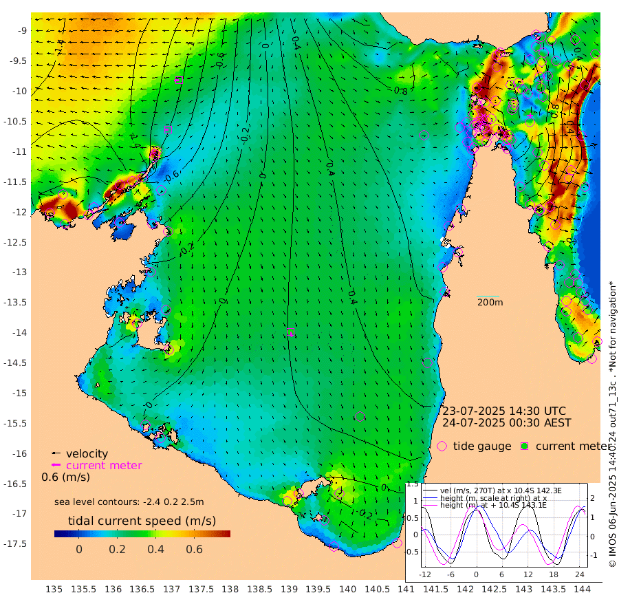 22cm/s -97T +3cm/s rms + 7cm/s -42T. ARA-GOC87 57m 35cm/s 169T +3cm/s rms + 2cm/s -2T. ARA-GOC87 60m 34cm/s -98T +2cm/s rms + 3cm/s 61T. ARA-GOC87 47m 151cm Daru 129cm Bobo Island 39cm Meer Island Barge 64cm Bramble Cay 114cm Unnamed Cay 117cm Pearce Cay 100cm Stephens Island 105cm Merrie England Shoals 147cm Mutacomal Reef 88cm Darnley Island Barge 44cm East Cay 118cm Yorke Island Barge 134cm Rennel Island 129cm Aureed Island 161cm Dungeness Reef 178cm Zagai Island 187cm Yam Island 200cm Dauan Island 181cm Saibai Island 197cm Phipi Reef 197cm Warrior Reef - West 171cm Mabuiag Island Barge 131cm Half Way Island 158cm Coconut Island 155cm Dugong Islet 177cm Poll Island 179cm Kirkcaldie Reef 205cm Suarji Island 173cm Sue Islet 147cm Hawkesbury Island 202cm Alert Patches 196cm Twin Island 155cm Badu Island 209cm St Pauls (Moa Island) 160cm Kubin (Moa Island) 188cm Ince Point 180cm Thursday Island 182cm Nardana Patches 170cm Turtle Head 144cm Round Island 140cm Goods Island 126cm Booby Island 128cm White Rocks Area 101cm Carpentaria 173cm Papou Point 130cm Bampfield Head 104cm Crab Island 130cm Red Wallis Island 155cm Packe Island 168cm Harrington Reef 145cm Herald Camp 64cm Sharp Point 142cm Red Island Point 166cm Possession Island 175cm Alpha Rock 183cm Frederick Point 152cm Wyborn Reef Light 161cm Tetley Island 59cm Triangle Reef 153cm Turtle Head Island 53cm Maclennan Cay 18cm Raine Island 110cm Mcsweeny Reef 92cm Collette Reef 50cm Shadwell Reef 91cm Hannibal Island 67cm Round Point 94cm Vrilya Point 61cm Cape Grenville 53cm Hicks Island 59cm Sir Charles Hardy Island 20cm Harvey Island 36cm Kay Reef 26cm Rocky Island 17cm Chapman Island 17cm Ham Reef 25cm Jubilee Reef 30cm Night Island 20cm Unnamed Reef No. 3 25cm Morris Island 28cm 1st 3 Mile Opening 28cm Creech Reef 29cm Fife Island 8cm Eden Reef 24cm Stanley Island 19cm Normanby River -183cm Yabooma Island -200cm Hutchison River -193cm Elcho Island -185cm North West Crocodile Island -121cm Cape Wessel -171cm Stevens Island -89cm Guluwuru Island -169cm Hopeful Bay -135cm Auster Point -142cm Two Island Bay -167cm Cadell Strait -75cm Mallison Island -89cm Melville Bay (Gove Harbour) -89cm Truant Island -54cm Cape Arnhem -46cm Cape Grey -44cm Hawk Island -53cm Milner Bay (Groote Eylandt) -37cm Cape Beatrice -17cm West Island -21cm Centre Island -4cm Mornington Island 3cm West Wellesley Islands -25cm Bountiful Island -75cm Albert River Mouth -101cm Sweers Island -57cm Karumba 33cm Nassau River Offshore 68cm Christmas Creek 64cm Archer River 80cm Boyd Point 74cm Weipa (Humbug Point) 70cm Pennefather River 89cm Cullen Point