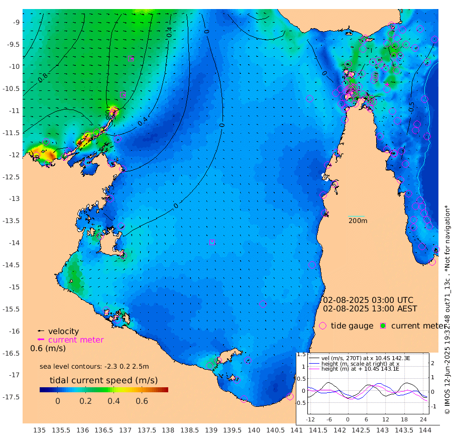 25cm/s 113T +3cm/s rms + 7cm/s -42T. ARA-GOC87 57m 12cm/s -6T +3cm/s rms + 2cm/s -2T. ARA-GOC87 60m 26cm/s 101T +2cm/s rms + 3cm/s 61T. ARA-GOC87 47m -36cm Daru -41cm Bobo Island -39cm Meer Island Barge -43cm Bramble Cay -45cm Unnamed Cay -39cm Pearce Cay -46cm Stephens Island -47cm Merrie England Shoals -45cm Mutacomal Reef -46cm Darnley Island Barge -46cm East Cay -43cm Yorke Island Barge -43cm Rennel Island -46cm Aureed Island -34cm Dungeness Reef -22cm Zagai Island -26cm Yam Island 3cm Dauan Island -12cm Saibai Island 4cm Phipi Reef -23cm Warrior Reef - West 0cm Mabuiag Island Barge -42cm Half Way Island -37cm Coconut Island -45cm Dugong Islet -29cm Poll Island -35cm Kirkcaldie Reef -29cm Suarji Island -32cm Sue Islet 11cm Hawkesbury Island -20cm Alert Patches -23cm Twin Island 17cm Badu Island -14cm St Pauls (Moa Island) 4cm Kubin (Moa Island) -12cm Ince Point -8cm Thursday Island -8cm Nardana Patches -4cm Turtle Head 8cm Round Island 3cm Goods Island 4cm Booby Island -1cm White Rocks Area -25cm Carpentaria -15cm Papou Point 0cm Bampfield Head 10cm Crab Island -4cm Red Wallis Island -4cm Packe Island -46cm Harrington Reef -3cm Herald Camp -7cm Sharp Point -6cm Red Island Point -7cm Possession Island -29cm Alpha Rock -31cm Frederick Point -35cm Wyborn Reef Light -33cm Tetley Island -36cm Triangle Reef -24cm Turtle Head Island -44cm Maclennan Cay -33cm Raine Island -43cm Mcsweeny Reef -43cm Collette Reef -37cm Shadwell Reef -47cm Hannibal Island -42cm Round Point 6cm Vrilya Point -49cm Cape Grenville -41cm Hicks Island -57cm Sir Charles Hardy Island -14cm Harvey Island -51cm Kay Reef -41cm Rocky Island -42cm Chapman Island -43cm Ham Reef -40cm Jubilee Reef -36cm Night Island -46cm Unnamed Reef No. 3 -42cm Morris Island -36cm 1st 3 Mile Opening -43cm Creech Reef -38cm Fife Island -48cm Eden Reef -46cm Stanley Island -49cm Normanby River 129cm Yabooma Island 139cm Hutchison River 124cm Elcho Island 121cm North West Crocodile Island 64cm Cape Wessel 118cm Stevens Island 49cm Guluwuru Island 103cm Hopeful Bay 90cm Auster Point 94cm Two Island Bay 126cm Cadell Strait 11cm Mallison Island 59cm Melville Bay (Gove Harbour) 61cm Truant Island 36cm Cape Arnhem 23cm Cape Grey 21cm Hawk Island 11cm Milner Bay (Groote Eylandt) -2cm Cape Beatrice -26cm West Island -25cm Centre Island -27cm Mornington Island -36cm West Wellesley Islands -25cm Bountiful Island 0cm Albert River Mouth 18cm Sweers Island 2cm Karumba -29cm Nassau River Offshore -35cm Christmas Creek -19cm Archer River -20cm Boyd Point -16cm Weipa (Humbug Point) 6cm Pennefather River -6cm Cullen Point
