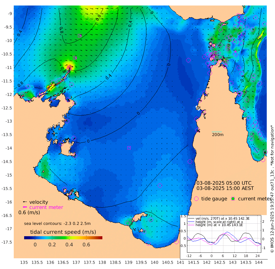 31cm/s 109T +3cm/s rms + 7cm/s -42T. ARA-GOC87 57m 6cm/s 32T +3cm/s rms + 2cm/s -2T. ARA-GOC87 60m 30cm/s 101T +2cm/s rms + 3cm/s 61T. ARA-GOC87 47m -47cm Daru -48cm Bobo Island -24cm Meer Island Barge -36cm Bramble Cay -47cm Unnamed Cay -50cm Pearce Cay -46cm Stephens Island -49cm Merrie England Shoals -57cm Mutacomal Reef -38cm Darnley Island Barge -34cm East Cay -43cm Yorke Island Barge -54cm Rennel Island -53cm Aureed Island -52cm Dungeness Reef -37cm Zagai Island -49cm Yam Island -17cm Dauan Island -20cm Saibai Island -24cm Phipi Reef -42cm Warrior Reef - West -20cm Mabuiag Island Barge -53cm Half Way Island -51cm Coconut Island -61cm Dugong Islet -52cm Poll Island -56cm Kirkcaldie Reef -59cm Suarji Island -45cm Sue Islet -12cm Hawkesbury Island -46cm Alert Patches -50cm Twin Island -5cm Badu Island -44cm St Pauls (Moa Island) -20cm Kubin (Moa Island) -38cm Ince Point -33cm Thursday Island -34cm Nardana Patches -28cm Turtle Head -12cm Round Island -15cm Goods Island -9cm Booby Island -24cm White Rocks Area -12cm Carpentaria -40cm Papou Point -2cm Bampfield Head -2cm Crab Island -20cm Red Wallis Island -27cm Packe Island -65cm Harrington Reef -19cm Herald Camp -16cm Sharp Point -30cm Red Island Point -30cm Possession Island -48cm Alpha Rock -53cm Frederick Point -46cm Wyborn Reef Light -46cm Tetley Island -26cm Triangle Reef -39cm Turtle Head Island -34cm Maclennan Cay -16cm Raine Island -44cm Mcsweeny Reef -39cm Collette Reef -23cm Shadwell Reef -41cm Hannibal Island -38cm Round Point 1cm Vrilya Point -40cm Cape Grenville -33cm Hicks Island -39cm Sir Charles Hardy Island -12cm Harvey Island -34cm Kay Reef -25cm Rocky Island -23cm Chapman Island -22cm Ham Reef -21cm Jubilee Reef -23cm Night Island -26cm Unnamed Reef No. 3 -25cm Morris Island -18cm 1st 3 Mile Opening -25cm Creech Reef -23cm Fife Island -24cm Eden Reef -27cm Stanley Island -34cm Normanby River 97cm Yabooma Island 114cm Hutchison River 101cm Elcho Island 91cm North West Crocodile Island 72cm Cape Wessel 103cm Stevens Island 80cm Guluwuru Island 93cm Hopeful Bay 85cm Auster Point 90cm Two Island Bay 119cm Cadell Strait 127cm Mallison Island 76cm Melville Bay (Gove Harbour) 82cm Truant Island 54cm Cape Arnhem 30cm Cape Grey 20cm Hawk Island 0cm Milner Bay (Groote Eylandt) -17cm Cape Beatrice -49cm West Island -48cm Centre Island -55cm Mornington Island -66cm West Wellesley Islands -64cm Bountiful Island -52cm Albert River Mouth -34cm Sweers Island -53cm Karumba -56cm Nassau River Offshore -48cm Christmas Creek -21cm Archer River -15cm Boyd Point -16cm Weipa (Humbug Point) 5cm Pennefather River -7cm Cullen Point