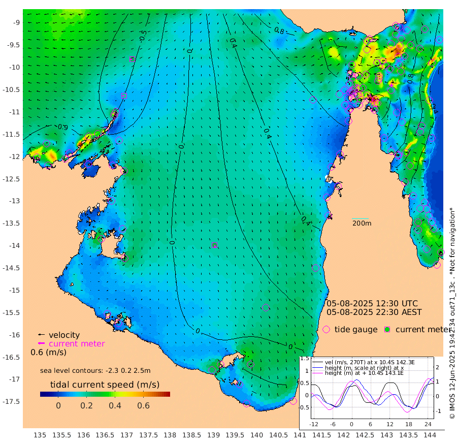 18cm/s -104T +3cm/s rms + 7cm/s -42T. ARA-GOC87 57m 26cm/s 170T +3cm/s rms + 2cm/s -2T. ARA-GOC87 60m 25cm/s -103T +2cm/s rms + 3cm/s 61T. ARA-GOC87 47m 119cm Daru 116cm Bobo Island 59cm Meer Island Barge 83cm Bramble Cay 109cm Unnamed Cay 119cm Pearce Cay 101cm Stephens Island 109cm Merrie England Shoals 128cm Mutacomal Reef 90cm Darnley Island Barge 71cm East Cay 104cm Yorke Island Barge 120cm Rennel Island 118cm Aureed Island 126cm Dungeness Reef 114cm Zagai Island 120cm Yam Island 106cm Dauan Island 99cm Saibai Island 113cm Phipi Reef 124cm Warrior Reef - West 107cm Mabuiag Island Barge 112cm Half Way Island 130cm Coconut Island 126cm Dugong Islet 130cm Poll Island 126cm Kirkcaldie Reef 149cm Suarji Island 122cm Sue Islet 125cm Hawkesbury Island 147cm Alert Patches 143cm Twin Island 113cm Badu Island 139cm St Pauls (Moa Island) 120cm Kubin (Moa Island) 132cm Ince Point 129cm Thursday Island 129cm Nardana Patches 127cm Turtle Head 119cm Round Island 117cm Goods Island 109cm Booby Island 117cm White Rocks Area 88cm Carpentaria 118cm Papou Point 130cm Bampfield Head 80cm Crab Island 113cm Red Wallis Island 128cm Packe Island 141cm Harrington Reef 122cm Herald Camp 35cm Sharp Point 109cm Red Island Point 129cm Possession Island 130cm Alpha Rock 141cm Frederick Point 132cm Wyborn Reef Light 134cm Tetley Island 74cm Triangle Reef 131cm Turtle Head Island 69cm Maclennan Cay 45cm Raine Island 106cm Mcsweeny Reef 96cm Collette Reef 65cm Shadwell Reef 99cm Hannibal Island 93cm Round Point 70cm Vrilya Point 83cm Cape Grenville 72cm Hicks Island 78cm Sir Charles Hardy Island 24cm Harvey Island 70cm Kay Reef 56cm Rocky Island 58cm Chapman Island 51cm Ham Reef 51cm Jubilee Reef 54cm Night Island 56cm Unnamed Reef No. 3 57cm Morris Island 50cm 1st 3 Mile Opening 55cm Creech Reef 59cm Fife Island 53cm Eden Reef 56cm Stanley Island 61cm Normanby River -87cm Yabooma Island -94cm Hutchison River -95cm Elcho Island -94cm North West Crocodile Island -52cm Cape Wessel -84cm Stevens Island -54cm Guluwuru Island -75cm Hopeful Bay -60cm Auster Point -74cm Two Island Bay -95cm Cadell Strait -56cm Mallison Island -47cm Melville Bay (Gove Harbour) -45cm Truant Island -32cm Cape Arnhem -34cm Cape Grey -26cm Hawk Island -48cm Milner Bay (Groote Eylandt) -38cm Cape Beatrice -34cm West Island -33cm Centre Island -26cm Mornington Island -20cm West Wellesley Islands -39cm Bountiful Island -95cm Albert River Mouth -98cm Sweers Island -75cm Karumba 7cm Nassau River Offshore 39cm Christmas Creek 52cm Archer River 64cm Boyd Point 63cm Weipa (Humbug Point) 51cm Pennefather River 72cm Cullen Point
