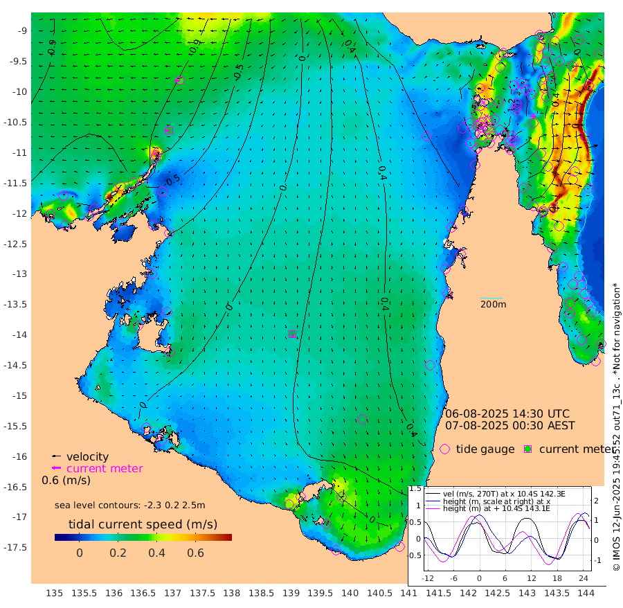 30cm/s -91T +3cm/s rms + 7cm/s -42T. ARA-GOC87 57m 26cm/s 179T +3cm/s rms + 2cm/s -2T. ARA-GOC87 60m 37cm/s -94T +2cm/s rms + 3cm/s 61T. ARA-GOC87 47m 78cm Daru 67cm Bobo Island 4cm Meer Island Barge 15cm Bramble Cay 44cm Unnamed Cay 60cm Pearce Cay 39cm Stephens Island 33cm Merrie England Shoals 71cm Mutacomal Reef 30cm Darnley Island Barge 10cm East Cay 54cm Yorke Island Barge 69cm Rennel Island 72cm Aureed Island 95cm Dungeness Reef 122cm Zagai Island 126cm Yam Island 164cm Dauan Island 148cm Saibai Island 159cm Phipi Reef 143cm Warrior Reef - West 138cm Mabuiag Island Barge 59cm Half Way Island 92cm Coconut Island 80cm Dugong Islet 112cm Poll Island 104cm Kirkcaldie Reef 153cm Suarji Island 106cm Sue Islet 132cm Hawkesbury Island 143cm Alert Patches 137cm Twin Island 132cm Badu Island 149cm St Pauls (Moa Island) 133cm Kubin (Moa Island) 140cm Ince Point 137cm Thursday Island 139cm Nardana Patches 138cm Turtle Head 130cm Round Island 122cm Goods Island 114cm Booby Island 115cm White Rocks Area 84cm Carpentaria 122cm Papou Point 128cm Bampfield Head 91cm Crab Island 119cm Red Wallis Island 135cm Packe Island 92cm Harrington Reef 140cm Herald Camp 44cm Sharp Point 117cm Red Island Point 131cm Possession Island 116cm Alpha Rock 119cm Frederick Point 81cm Wyborn Reef Light 92cm Tetley Island 30cm Triangle Reef 74cm Turtle Head Island 19cm Maclennan Cay -4cm Raine Island 49cm Mcsweeny Reef 37cm Collette Reef 12cm Shadwell Reef 29cm Hannibal Island 21cm Round Point 72cm Vrilya Point 16cm Cape Grenville 15cm Hicks Island 21cm Sir Charles Hardy Island 6cm Harvey Island -1cm Kay Reef 2cm Rocky Island 2cm Chapman Island -1cm Ham Reef -3cm Jubilee Reef 5cm Night Island 1cm Unnamed Reef No. 3 -3cm Morris Island -2cm 1st 3 Mile Opening 0cm Creech Reef 6cm Fife Island -18cm Eden Reef -8cm Stanley Island -11cm Normanby River -118cm Yabooma Island -131cm Hutchison River -126cm Elcho Island -118cm North West Crocodile Island -87cm Cape Wessel -123cm Stevens Island -89cm Guluwuru Island -111cm Hopeful Bay -95cm Auster Point -104cm Two Island Bay -127cm Cadell Strait -132cm Mallison Island -75cm Melville Bay (Gove Harbour) -76cm Truant Island -48cm Cape Arnhem -42cm Cape Grey -29cm Hawk Island -42cm Milner Bay (Groote Eylandt) -28cm Cape Beatrice -14cm West Island -15cm Centre Island 10cm Mornington Island 10cm West Wellesley Islands 5cm Bountiful Island -36cm Albert River Mouth -46cm Sweers Island -12cm Karumba 38cm Nassau River Offshore 61cm Christmas Creek 58cm Archer River 71cm Boyd Point 72cm Weipa (Humbug Point) 49cm Pennefather River 82cm Cullen Point