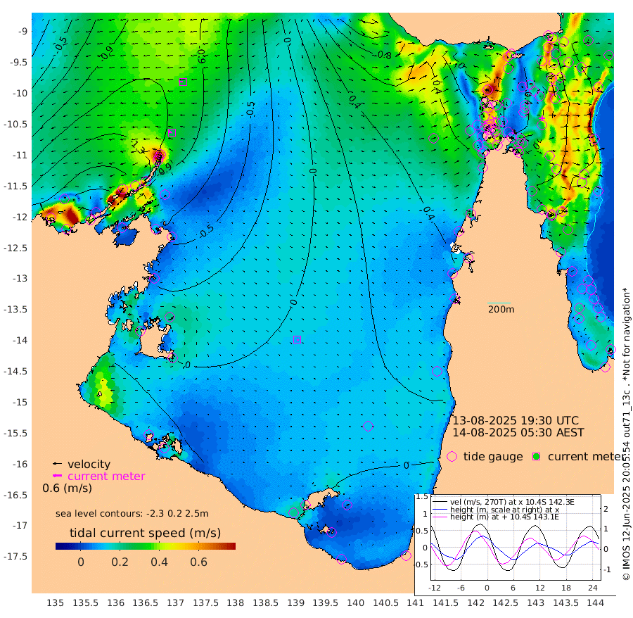 26cm/s -74T +3cm/s rms + 7cm/s -42T. ARA-GOC87 57m 10cm/s 145T +3cm/s rms + 2cm/s -2T. ARA-GOC87 60m 30cm/s -88T +2cm/s rms + 3cm/s 61T. ARA-GOC87 47m -35cm Daru -47cm Bobo Island -53cm Meer Island Barge -56cm Bramble Cay -47cm Unnamed Cay -62cm Pearce Cay -55cm Stephens Island -45cm Merrie England Shoals -30cm Mutacomal Reef -50cm Darnley Island Barge -55cm East Cay -42cm Yorke Island Barge -43cm Rennel Island -46cm Aureed Island -35cm Dungeness Reef -3cm Zagai Island 7cm Yam Island 17cm Dauan Island 32cm Saibai Island 0cm Phipi Reef 0cm Warrior Reef - West 23cm Mabuiag Island Barge -37cm Half Way Island -31cm Coconut Island -31cm Dugong Islet -16cm Poll Island -7cm Kirkcaldie Reef -14cm Suarji Island -3cm Sue Islet 16cm Hawkesbury Island 0cm Alert Patches 1cm Twin Island 9cm Badu Island 7cm St Pauls (Moa Island) 8cm Kubin (Moa Island) 11cm Ince Point 15cm Thursday Island 13cm Nardana Patches 7cm Turtle Head 5cm Round Island 5cm Goods Island 21cm Booby Island 9cm White Rocks Area 55cm Carpentaria 7cm Papou Point -1cm Bampfield Head 33cm Crab Island 30cm Red Wallis Island 17cm Packe Island -35cm Harrington Reef 24cm Herald Camp 17cm Sharp Point 18cm Red Island Point -4cm Possession Island 8cm Alpha Rock -13cm Frederick Point -36cm Wyborn Reef Light -28cm Tetley Island -41cm Triangle Reef -52cm Turtle Head Island -46cm Maclennan Cay -48cm Raine Island -47cm Mcsweeny Reef -45cm Collette Reef -43cm Shadwell Reef -52cm Hannibal Island -60cm Round Point 49cm Vrilya Point -47cm Cape Grenville -54cm Hicks Island -47cm Sir Charles Hardy Island -15cm Harvey Island -48cm Kay Reef -52cm Rocky Island -52cm Chapman Island -43cm Ham Reef -47cm Jubilee Reef -43cm Night Island -43cm Unnamed Reef No. 3 -55cm Morris Island -54cm 1st 3 Mile Opening -49cm Creech Reef -55cm Fife Island -66cm Eden Reef -50cm Stanley Island -61cm Normanby River -194cm Yabooma Island -231cm Hutchison River -192cm Elcho Island -178cm North West Crocodile Island -126cm Cape Wessel -173cm Stevens Island -120cm Guluwuru Island -160cm Hopeful Bay -149cm Auster Point -141cm Two Island Bay -190cm Cadell Strait -39cm Mallison Island -122cm Melville Bay (Gove Harbour) -127cm Truant Island -81cm Cape Arnhem -62cm Cape Grey -47cm Hawk Island -19cm Milner Bay (Groote Eylandt) -6cm Cape Beatrice 34cm West Island 37cm Centre Island 18cm Mornington Island 18cm West Wellesley Islands -15cm Bountiful Island -17cm Albert River Mouth -40cm Sweers Island -9cm Karumba 23cm Nassau River Offshore 30cm Christmas Creek 23cm Archer River 26cm Boyd Point 16cm Weipa (Humbug Point) 35cm Pennefather River 44cm Cullen Point