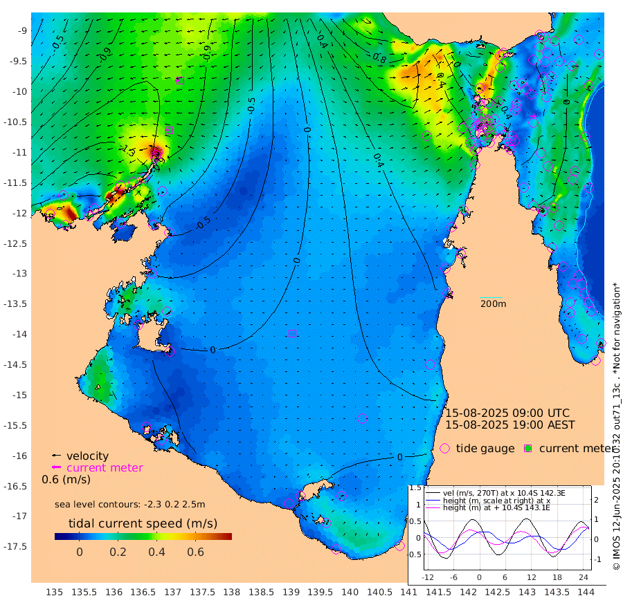 30cm/s -81T +3cm/s rms + 7cm/s -42T. ARA-GOC87 57m 8cm/s 114T +3cm/s rms + 2cm/s -2T. ARA-GOC87 60m 33cm/s -94T +2cm/s rms + 3cm/s 61T. ARA-GOC87 47m 1cm Daru -8cm Bobo Island -4cm Meer Island Barge -4cm Bramble Cay 9cm Unnamed Cay -11cm Pearce Cay -2cm Stephens Island 13cm Merrie England Shoals 14cm Mutacomal Reef 1cm Darnley Island Barge -8cm East Cay 4cm Yorke Island Barge 3cm Rennel Island 1cm Aureed Island 5cm Dungeness Reef 4cm Zagai Island 5cm Yam Island -10cm Dauan Island 4cm Saibai Island -3cm Phipi Reef -5cm Warrior Reef - West 21cm Mabuiag Island Barge 5cm Half Way Island 9cm Coconut Island 10cm Dugong Islet 10cm Poll Island 14cm Kirkcaldie Reef 29cm Suarji Island 20cm Sue Islet 26cm Hawkesbury Island 37cm Alert Patches 26cm Twin Island 19cm Badu Island 24cm St Pauls (Moa Island) 19cm Kubin (Moa Island) 30cm Ince Point 34cm Thursday Island 32cm Nardana Patches 30cm Turtle Head 35cm Round Island 32cm Goods Island 49cm Booby Island 44cm White Rocks Area 83cm Carpentaria 15cm Papou Point 68cm Bampfield Head 35cm Crab Island 43cm Red Wallis Island 29cm Packe Island 15cm Harrington Reef 42cm Herald Camp 12cm Sharp Point 19cm Red Island Point 34cm Possession Island 31cm Alpha Rock 19cm Frederick Point 12cm Wyborn Reef Light 13cm Tetley Island -1cm Triangle Reef 7cm Turtle Head Island 0cm Maclennan Cay -6cm Raine Island 6cm Mcsweeny Reef 8cm Collette Reef 4cm Shadwell Reef 8cm Hannibal Island -4cm Round Point 50cm Vrilya Point 10cm Cape Grenville -5cm Hicks Island 1cm Sir Charles Hardy Island 0cm Harvey Island 9cm Kay Reef -2cm Rocky Island -3cm Chapman Island 0cm Ham Reef -3cm Jubilee Reef -1cm Night Island 0cm Unnamed Reef No. 3 -2cm Morris Island 2cm 1st 3 Mile Opening 0cm Creech Reef -14cm Fife Island -7cm Eden Reef 4cm Stanley Island -7cm Normanby River -184cm Yabooma Island -214cm Hutchison River -181cm Elcho Island -179cm North West Crocodile Island -124cm Cape Wessel -168cm Stevens Island -122cm Guluwuru Island -146cm Hopeful Bay -132cm Auster Point -147cm Two Island Bay -216cm Cadell Strait -96cm Mallison Island -112cm Melville Bay (Gove Harbour) -116cm Truant Island -73cm Cape Arnhem -42cm Cape Grey -28cm Hawk Island 2cm Milner Bay (Groote Eylandt) 6cm Cape Beatrice 51cm West Island 57cm Centre Island 15cm Mornington Island 22cm West Wellesley Islands 3cm Bountiful Island -32cm Albert River Mouth -17cm Sweers Island -28cm Karumba 5cm Nassau River Offshore 13cm Christmas Creek 24cm Archer River 33cm Boyd Point 26cm Weipa (Humbug Point) 39cm Pennefather River 45cm Cullen Point