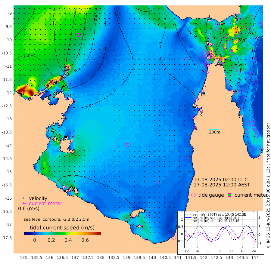 24cm/s 127T +3cm/s rms + 7cm/s -42T. ARA-GOC87 57m 16cm/s 2T +3cm/s rms + 2cm/s -2T. ARA-GOC87 60m 28cm/s 121T +2cm/s rms + 3cm/s 61T. ARA-GOC87 47m -74cm Daru -72cm Bobo Island -67cm Meer Island Barge -73cm Bramble Cay -85cm Unnamed Cay -67cm Pearce Cay -80cm Stephens Island -85cm Merrie England Shoals -78cm Mutacomal Reef -84cm Darnley Island Barge -68cm East Cay -81cm Yorke Island Barge -74cm Rennel Island -74cm Aureed Island -64cm Dungeness Reef -41cm Zagai Island -41cm Yam Island -5cm Dauan Island -15cm Saibai Island -17cm Phipi Reef -42cm Warrior Reef - West 11cm Mabuiag Island Barge -73cm Half Way Island -59cm Coconut Island -76cm Dugong Islet -47cm Poll Island -57cm Kirkcaldie Reef -37cm Suarji Island -57cm Sue Islet 53cm Hawkesbury Island -25cm Alert Patches -26cm Twin Island 58cm Badu Island -20cm St Pauls (Moa Island) 30cm Kubin (Moa Island) -3cm Ince Point 10cm Thursday Island 7cm Nardana Patches 22cm Turtle Head 29cm Round Island 49cm Goods Island 62cm Booby Island 62cm White Rocks Area 33cm Carpentaria -13cm Papou Point 42cm Bampfield Head 60cm Crab Island 60cm Red Wallis Island 36cm Packe Island -73cm Harrington Reef 28cm Herald Camp -11cm Sharp Point 28cm Red Island Point -7cm Possession Island -38cm Alpha Rock -44cm Frederick Point -67cm Wyborn Reef Light -61cm Tetley Island -53cm Triangle Reef -62cm Turtle Head Island -64cm Maclennan Cay -48cm Raine Island -76cm Mcsweeny Reef -77cm Collette Reef -65cm Shadwell Reef -86cm Hannibal Island -70cm Round Point 53cm Vrilya Point -77cm Cape Grenville -68cm Hicks Island -79cm Sir Charles Hardy Island -24cm Harvey Island -73cm Kay Reef -61cm Rocky Island -52cm Chapman Island -56cm Ham Reef -59cm Jubilee Reef -55cm Night Island -54cm Unnamed Reef No. 3 -62cm Morris Island -58cm 1st 3 Mile Opening -61cm Creech Reef -56cm Fife Island -70cm Eden Reef -69cm Stanley Island -71cm Normanby River 149cm Yabooma Island 155cm Hutchison River 143cm Elcho Island 144cm North West Crocodile Island 74cm Cape Wessel 126cm Stevens Island 25cm Guluwuru Island 108cm Hopeful Bay 92cm Auster Point 91cm Two Island Bay 122cm Cadell Strait -70cm Mallison Island 39cm Melville Bay (Gove Harbour) 42cm Truant Island 18cm Cape Arnhem 2cm Cape Grey -4cm Hawk Island -6cm Milner Bay (Groote Eylandt) -16cm Cape Beatrice -39cm West Island -39cm Centre Island -59cm Mornington Island -63cm West Wellesley Islands -61cm Bountiful Island -34cm Albert River Mouth -35cm Sweers Island -36cm Karumba -44cm Nassau River Offshore -39cm Christmas Creek -4cm Archer River 0cm Boyd Point 8cm Weipa (Humbug Point) 27cm Pennefather River 34cm Cullen Point