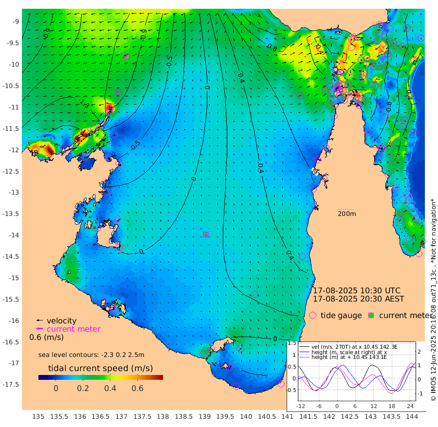 28cm/s -92T +3cm/s rms + 7cm/s -42T. ARA-GOC87 57m 21cm/s 163T +3cm/s rms + 2cm/s -2T. ARA-GOC87 60m 36cm/s -100T +2cm/s rms + 3cm/s 61T. ARA-GOC87 47m 95cm Daru 82cm Bobo Island 50cm Meer Island Barge 69cm Bramble Cay 98cm Unnamed Cay 84cm Pearce Cay 84cm Stephens Island 102cm Merrie England Shoals 110cm Mutacomal Reef 76cm Darnley Island Barge 54cm East Cay 85cm Yorke Island Barge 97cm Rennel Island 86cm Aureed Island 99cm Dungeness Reef 76cm Zagai Island 86cm Yam Island 54cm Dauan Island 50cm Saibai Island 67cm Phipi Reef 77cm Warrior Reef - West 72cm Mabuiag Island Barge 98cm Half Way Island 100cm Coconut Island 108cm Dugong Islet 99cm Poll Island 107cm Kirkcaldie Reef 111cm Suarji Island 97cm Sue Islet 89cm Hawkesbury Island 120cm Alert Patches 110cm Twin Island 79cm Badu Island 106cm St Pauls (Moa Island) 87cm Kubin (Moa Island) 104cm Ince Point 104cm Thursday Island 103cm Nardana Patches 101cm Turtle Head 89cm Round Island 94cm Goods Island 97cm Booby Island 100cm White Rocks Area 99cm Carpentaria 86cm Papou Point 108cm Bampfield Head 74cm Crab Island 96cm Red Wallis Island 99cm Packe Island 117cm Harrington Reef 93cm Herald Camp 31cm Sharp Point 79cm Red Island Point 99cm Possession Island 105cm Alpha Rock 109cm Frederick Point 105cm Wyborn Reef Light 105cm Tetley Island 53cm Triangle Reef 109cm Turtle Head Island 58cm Maclennan Cay 37cm Raine Island 90cm Mcsweeny Reef 83cm Collette Reef 58cm Shadwell Reef 89cm Hannibal Island 74cm Round Point 80cm Vrilya Point 77cm Cape Grenville 59cm Hicks Island 63cm Sir Charles Hardy Island 21cm Harvey Island 66cm Kay Reef 46cm Rocky Island 41cm Chapman Island 40cm Ham Reef 44cm Jubilee Reef 46cm Night Island 44cm Unnamed Reef No. 3 50cm Morris Island 50cm 1st 3 Mile Opening 50cm Creech Reef 41cm Fife Island 46cm Eden Reef 56cm Stanley Island 52cm Normanby River -169cm Yabooma Island -192cm Hutchison River -173cm Elcho Island -170cm North West Crocodile Island -122cm Cape Wessel -159cm Stevens Island -111cm Guluwuru Island -146cm Hopeful Bay -128cm Auster Point -142cm Two Island Bay -193cm Cadell Strait -99cm Mallison Island -104cm Melville Bay (Gove Harbour) -108cm Truant Island -70cm Cape Arnhem -47cm Cape Grey -38cm Hawk Island -27cm Milner Bay (Groote Eylandt) -14cm Cape Beatrice 20cm West Island 21cm Centre Island 6cm Mornington Island 17cm West Wellesley Islands -9cm Bountiful Island -55cm Albert River Mouth -59cm Sweers Island -45cm Karumba 24cm Nassau River Offshore 46cm Christmas Creek 53cm Archer River 61cm Boyd Point 58cm Weipa (Humbug Point) 64cm Pennefather River 70cm Cullen Point