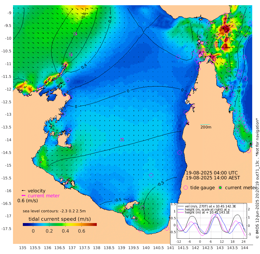 27cm/s 120T +3cm/s rms + 7cm/s -42T. ARA-GOC87 57m 19cm/s 18T +3cm/s rms + 2cm/s -2T. ARA-GOC87 60m 31cm/s 116T +2cm/s rms + 3cm/s 61T. ARA-GOC87 47m -123cm Daru -121cm Bobo Island -95cm Meer Island Barge -118cm Bramble Cay -134cm Unnamed Cay -123cm Pearce Cay -130cm Stephens Island -140cm Merrie England Shoals -134cm Mutacomal Reef -122cm Darnley Island Barge -105cm East Cay -121cm Yorke Island Barge -127cm Rennel Island -120cm Aureed Island -113cm Dungeness Reef -65cm Zagai Island -72cm Yam Island -13cm Dauan Island -10cm Saibai Island -42cm Phipi Reef -71cm Warrior Reef - West 5cm Mabuiag Island Barge -126cm Half Way Island -107cm Coconut Island -128cm Dugong Islet -91cm Poll Island -104cm Kirkcaldie Reef -74cm Suarji Island -86cm Sue Islet 35cm Hawkesbury Island -62cm Alert Patches -63cm Twin Island 41cm Badu Island -51cm St Pauls (Moa Island) 8cm Kubin (Moa Island) -32cm Ince Point -16cm Thursday Island -19cm Nardana Patches -5cm Turtle Head 14cm Round Island 27cm Goods Island 50cm Booby Island 38cm White Rocks Area 50cm Carpentaria -40cm Papou Point 43cm Bampfield Head 49cm Crab Island 42cm Red Wallis Island 6cm Packe Island -131cm Harrington Reef 19cm Herald Camp -18cm Sharp Point 2cm Red Island Point -31cm Possession Island -68cm Alpha Rock -89cm Frederick Point -115cm Wyborn Reef Light -106cm Tetley Island -80cm Triangle Reef -115cm Turtle Head Island -95cm Maclennan Cay -72cm Raine Island -122cm Mcsweeny Reef -119cm Collette Reef -93cm Shadwell Reef -132cm Hannibal Island -119cm Round Point 49cm Vrilya Point -118cm Cape Grenville -105cm Hicks Island -109cm Sir Charles Hardy Island -36cm Harvey Island -108cm Kay Reef -89cm Rocky Island -79cm Chapman Island -77cm Ham Reef -83cm Jubilee Reef -83cm Night Island -81cm Unnamed Reef No. 3 -93cm Morris Island -82cm 1st 3 Mile Opening -89cm Creech Reef -91cm Fife Island -102cm Eden Reef -100cm Stanley Island -109cm Normanby River 127cm Yabooma Island 133cm Hutchison River 127cm Elcho Island 124cm North West Crocodile Island 82cm Cape Wessel 114cm Stevens Island 44cm Guluwuru Island 100cm Hopeful Bay 91cm Auster Point 95cm Two Island Bay 113cm Cadell Strait -10cm Mallison Island 49cm Melville Bay (Gove Harbour) 56cm Truant Island 30cm Cape Arnhem 10cm Cape Grey -4cm Hawk Island -6cm Milner Bay (Groote Eylandt) -26cm Cape Beatrice -50cm West Island -49cm Centre Island -94cm Mornington Island -101cm West Wellesley Islands -101cm Bountiful Island -86cm Albert River Mouth -79cm Sweers Island -91cm Karumba -88cm Nassau River Offshore -74cm Christmas Creek -25cm Archer River -7cm Boyd Point -6cm Weipa (Humbug Point) 17cm Pennefather River 32cm Cullen Point