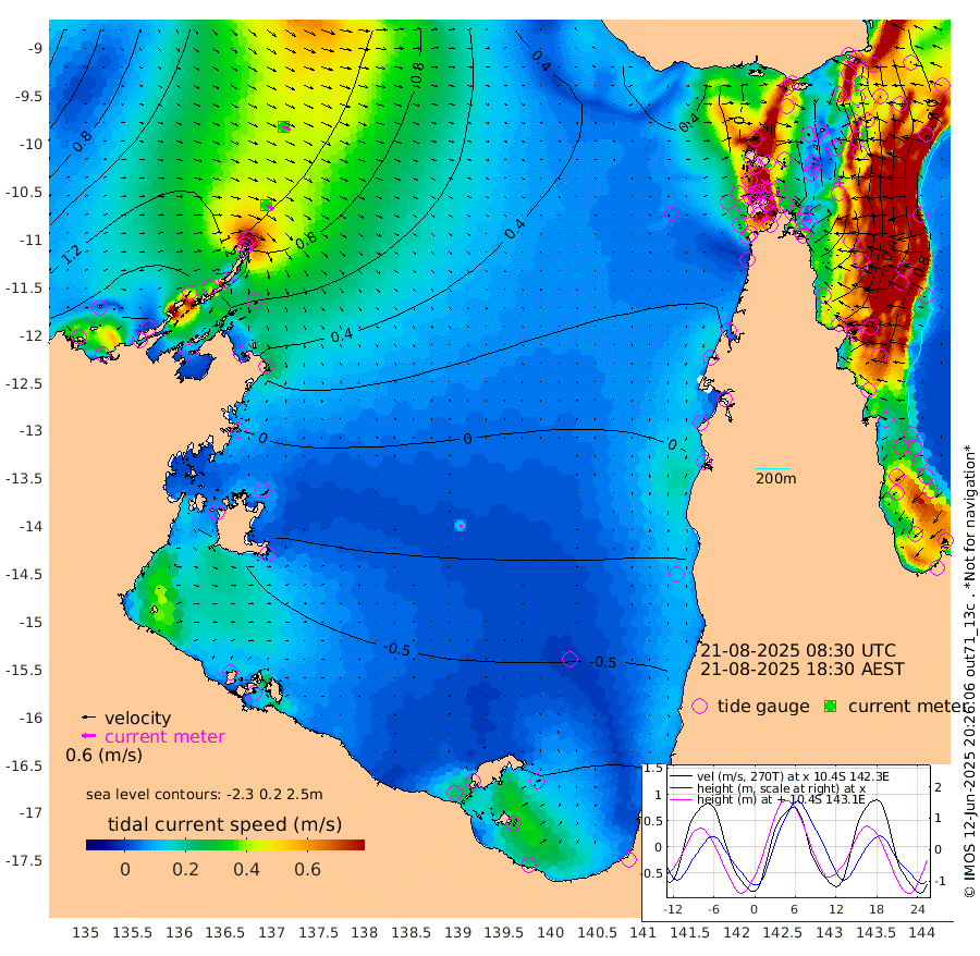 35cm/s 122T +3cm/s rms + 7cm/s -42T. ARA-GOC87 57m 12cm/s 147T +3cm/s rms + 2cm/s -2T. ARA-GOC87 60m 33cm/s 119T +2cm/s rms + 3cm/s 61T. ARA-GOC87 47m -42cm Daru -22cm Bobo Island 60cm Meer Island Barge 44cm Bramble Cay 4cm Unnamed Cay 3cm Pearce Cay 16cm Stephens Island 13cm Merrie England Shoals -31cm Mutacomal Reef 25cm Darnley Island Barge 61cm East Cay -7cm Yorke Island Barge -17cm Rennel Island -20cm Aureed Island -49cm Dungeness Reef -92cm Zagai Island -91cm Yam Island -106cm Dauan Island -95cm Saibai Island -118cm Phipi Reef -103cm Warrior Reef - West -70cm Mabuiag Island Barge -15cm Half Way Island -46cm Coconut Island -33cm Dugong Islet -69cm Poll Island -66cm Kirkcaldie Reef -102cm Suarji Island -67cm Sue Islet 39cm Hawkesbury Island -75cm Alert Patches -75cm Twin Island 5cm Badu Island -96cm St Pauls (Moa Island) -6cm Kubin (Moa Island) -60cm Ince Point -43cm Thursday Island -49cm Nardana Patches -16cm Turtle Head 2cm Round Island 39cm Goods Island 62cm Booby Island 52cm White Rocks Area 66cm Carpentaria -70cm Papou Point 66cm Bampfield Head 44cm Crab Island 50cm Red Wallis Island 12cm Packe Island -46cm Harrington Reef 29cm Herald Camp -47cm Sharp Point -12cm Red Island Point -47cm Possession Island -68cm Alpha Rock -63cm Frederick Point -34cm Wyborn Reef Light -45cm Tetley Island 40cm Triangle Reef -18cm Turtle Head Island 51cm Maclennan Cay 73cm Raine Island 4cm Mcsweeny Reef 17cm Collette Reef 49cm Shadwell Reef 24cm Hannibal Island 48cm Round Point 52cm Vrilya Point 47cm Cape Grenville 50cm Hicks Island 62cm Sir Charles Hardy Island 12cm Harvey Island 72cm Kay Reef 71cm Rocky Island 84cm Chapman Island 81cm Ham Reef 74cm Jubilee Reef 58cm Night Island 80cm Unnamed Reef No. 3 76cm Morris Island 74cm 1st 3 Mile Opening 74cm Creech Reef 66cm Fife Island 103cm Eden Reef 81cm Stanley Island 87cm Normanby River 156cm Yabooma Island 174cm Hutchison River 151cm Elcho Island 137cm North West Crocodile Island 121cm Cape Wessel 140cm Stevens Island 108cm Guluwuru Island 137cm Hopeful Bay 124cm Auster Point 129cm Two Island Bay 156cm Cadell Strait 150cm Mallison Island 90cm Melville Bay (Gove Harbour) 101cm Truant Island 54cm Cape Arnhem 12cm Cape Grey -12cm Hawk Island -54cm Milner Bay (Groote Eylandt) -65cm Cape Beatrice -115cm West Island -115cm Centre Island -136cm Mornington Island -132cm West Wellesley Islands -143cm Bountiful Island -174cm Albert River Mouth -180cm Sweers Island -177cm Karumba -92cm Nassau River Offshore -47cm Christmas Creek 15cm Archer River 28cm Boyd Point 35cm Weipa (Humbug Point) 31cm Pennefather River 43cm Cullen Point