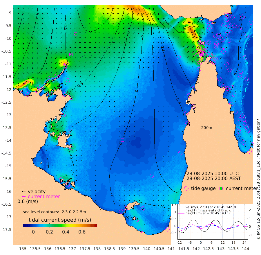 27cm/s -96T +3cm/s rms + 7cm/s -42T. ARA-GOC87 57m 3cm/s 160T +3cm/s rms + 2cm/s -2T. ARA-GOC87 60m 28cm/s -111T +2cm/s rms + 3cm/s 61T. ARA-GOC87 47m -17cm Daru -20cm Bobo Island 12cm Meer Island Barge 4cm Bramble Cay 1cm Unnamed Cay -5cm Pearce Cay 3cm Stephens Island 3cm Merrie England Shoals -9cm Mutacomal Reef 1cm Darnley Island Barge 11cm East Cay -6cm Yorke Island Barge 0cm Rennel Island -9cm Aureed Island -2cm Dungeness Reef -30cm Zagai Island -16cm Yam Island -30cm Dauan Island -35cm Saibai Island -26cm Phipi Reef -35cm Warrior Reef - West 5cm Mabuiag Island Barge 5cm Half Way Island -12cm Coconut Island 7cm Dugong Islet -8cm Poll Island 1cm Kirkcaldie Reef 4cm Suarji Island -11cm Sue Islet 70cm Hawkesbury Island 17cm Alert Patches 7cm Twin Island 50cm Badu Island 2cm St Pauls (Moa Island) 46cm Kubin (Moa Island) 23cm Ince Point 37cm Thursday Island 32cm Nardana Patches 52cm Turtle Head 50cm Round Island 80cm Goods Island 101cm Booby Island 100cm White Rocks Area 96cm Carpentaria 4cm Papou Point 94cm Bampfield Head 74cm Crab Island 88cm Red Wallis Island 58cm Packe Island 3cm Harrington Reef 73cm Herald Camp -7cm Sharp Point 42cm Red Island Point 25cm Possession Island -1cm Alpha Rock -1cm Frederick Point -14cm Wyborn Reef Light -17cm Tetley Island 4cm Triangle Reef 3cm Turtle Head Island 18cm Maclennan Cay 18cm Raine Island 1cm Mcsweeny Reef 0cm Collette Reef 9cm Shadwell Reef 1cm Hannibal Island 4cm Round Point 78cm Vrilya Point 15cm Cape Grenville 12cm Hicks Island 16cm Sir Charles Hardy Island 4cm Harvey Island 19cm Kay Reef 17cm Rocky Island 15cm Chapman Island 17cm Ham Reef 18cm Jubilee Reef 14cm Night Island 18cm Unnamed Reef No. 3 20cm Morris Island 29cm 1st 3 Mile Opening 23cm Creech Reef 8cm Fife Island 23cm Eden Reef 25cm Stanley Island 23cm Normanby River -32cm Yabooma Island -51cm Hutchison River -42cm Elcho Island -38cm North West Crocodile Island -61cm Cape Wessel -66cm Stevens Island -84cm Guluwuru Island -56cm Hopeful Bay -51cm Auster Point -58cm Two Island Bay -92cm Cadell Strait -214cm Mallison Island -73cm Melville Bay (Gove Harbour) -78cm Truant Island -58cm Cape Arnhem -31cm Cape Grey -35cm Hawk Island -11cm Milner Bay (Groote Eylandt) -3cm Cape Beatrice 23cm West Island 21cm Centre Island -8cm Mornington Island 6cm West Wellesley Islands 8cm Bountiful Island -17cm Albert River Mouth -23cm Sweers Island -20cm Karumba 6cm Nassau River Offshore 18cm Christmas Creek 38cm Archer River 46cm Boyd Point 55cm Weipa (Humbug Point) 48cm Pennefather River 65cm Cullen Point