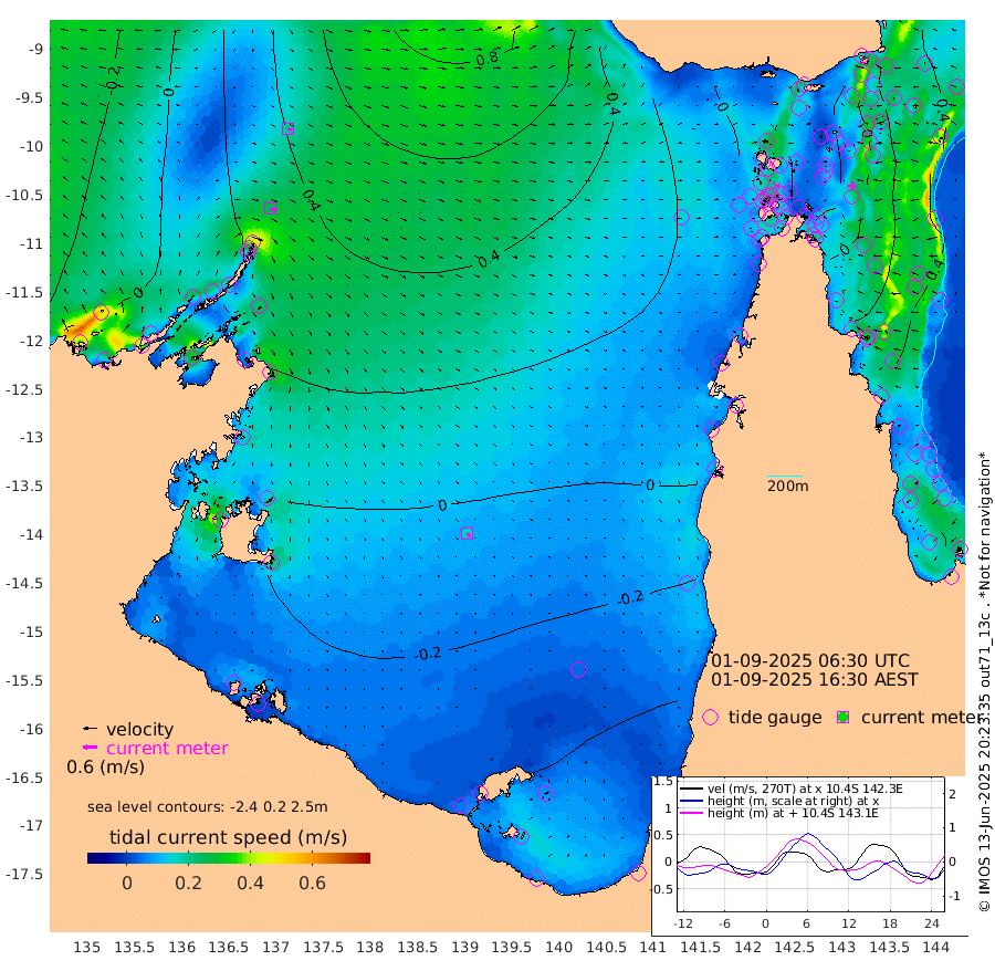 26cm/s 112T +3cm/s rms + 7cm/s -42T. ARA-GOC87 57m 16cm/s 146T +3cm/s rms + 2cm/s -2T. ARA-GOC87 60m 19cm/s 109T +2cm/s rms + 3cm/s 61T. ARA-GOC87 47m -1cm Daru 0cm Bobo Island 31cm Meer Island Barge 25cm Bramble Cay 15cm Unnamed Cay 1cm Pearce Cay 12cm Stephens Island 18cm Merrie England Shoals 2cm Mutacomal Reef 24cm Darnley Island Barge 25cm East Cay 13cm Yorke Island Barge -3cm Rennel Island -1cm Aureed Island -12cm Dungeness Reef -14cm Zagai Island -23cm Yam Island -16cm Dauan Island -5cm Saibai Island -23cm Phipi Reef -20cm Warrior Reef - West -13cm Mabuiag Island Barge -2cm Half Way Island -7cm Coconut Island -9cm Dugong Islet -19cm Poll Island -19cm Kirkcaldie Reef -35cm Suarji Island -6cm Sue Islet 4cm Hawkesbury Island -19cm Alert Patches -23cm Twin Island 0cm Badu Island -27cm St Pauls (Moa Island) -7cm Kubin (Moa Island) -19cm Ince Point -15cm Thursday Island -17cm Nardana Patches -10cm Turtle Head 2cm Round Island 2cm Goods Island 11cm Booby Island -5cm White Rocks Area 30cm Carpentaria -25cm Papou Point 28cm Bampfield Head 8cm Crab Island 3cm Red Wallis Island -3cm Packe Island -17cm Harrington Reef 8cm Herald Camp -10cm Sharp Point -17cm Red Island Point -13cm Possession Island -12cm Alpha Rock -18cm Frederick Point 4cm Wyborn Reef Light 0cm Tetley Island 24cm Triangle Reef 3cm Turtle Head Island 21cm Maclennan Cay 31cm Raine Island 12cm Mcsweeny Reef 21cm Collette Reef 33cm Shadwell Reef 25cm Hannibal Island 24cm Round Point 20cm Vrilya Point 26cm Cape Grenville 23cm Hicks Island 31cm Sir Charles Hardy Island 6cm Harvey Island 35cm Kay Reef 32cm Rocky Island 36cm Chapman Island 36cm Ham Reef 34cm Jubilee Reef 27cm Night Island 34cm Unnamed Reef No. 3 32cm Morris Island 34cm 1st 3 Mile Opening 33cm Creech Reef 26cm Fife Island 44cm Eden Reef 37cm Stanley Island 30cm Normanby River -7cm Yabooma Island -1cm Hutchison River -3cm Elcho Island -15cm North West Crocodile Island 29cm Cape Wessel 18cm Stevens Island 60cm Guluwuru Island 21cm Hopeful Bay 22cm Auster Point 24cm Two Island Bay 29cm Cadell Strait 217cm Mallison Island 43cm Melville Bay (Gove Harbour) 50cm Truant Island 35cm Cape Arnhem 7cm Cape Grey -1cm Hawk Island -29cm Milner Bay (Groote Eylandt) -41cm Cape Beatrice -64cm West Island -61cm Centre Island -70cm Mornington Island -73cm West Wellesley Islands -89cm Bountiful Island -116cm Albert River Mouth -108cm Sweers Island -114cm Karumba -50cm Nassau River Offshore -20cm Christmas Creek 8cm Archer River 17cm Boyd Point 12cm Weipa (Humbug Point) 22cm Pennefather River 19cm Cullen Point