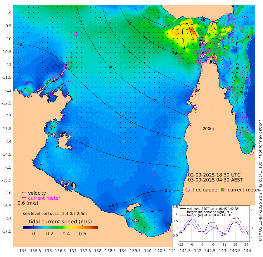 14cm/s -21T +3cm/s rms + 7cm/s -42T. ARA-GOC87 57m 12cm/s -65T +3cm/s rms + 2cm/s -2T. ARA-GOC87 60m 15cm/s -4T +2cm/s rms + 3cm/s 61T. ARA-GOC87 47m -57cm Daru -57cm Bobo Island -16cm Meer Island Barge -30cm Bramble Cay -47cm Unnamed Cay -60cm Pearce Cay -46cm Stephens Island -48cm Merrie England Shoals -63cm Mutacomal Reef -32cm Darnley Island Barge -21cm East Cay -44cm Yorke Island Barge -59cm Rennel Island -58cm Aureed Island -64cm Dungeness Reef -60cm Zagai Island -66cm Yam Island -46cm Dauan Island -38cm Saibai Island -38cm Phipi Reef -58cm Warrior Reef - West -68cm Mabuiag Island Barge -60cm Half Way Island -74cm Coconut Island -67cm Dugong Islet -78cm Poll Island -69cm Kirkcaldie Reef -90cm Suarji Island -62cm Sue Islet -97cm Hawkesbury Island -93cm Alert Patches -95cm Twin Island -89cm Badu Island -93cm St Pauls (Moa Island) -97cm Kubin (Moa Island) -93cm Ince Point -97cm Thursday Island -95cm Nardana Patches -93cm Turtle Head -92cm Round Island -96cm Goods Island -102cm Booby Island -110cm White Rocks Area -99cm Carpentaria -81cm Papou Point -115cm Bampfield Head -79cm Crab Island -108cm Red Wallis Island -107cm Packe Island -83cm Harrington Reef -92cm Herald Camp -19cm Sharp Point -75cm Red Island Point -88cm Possession Island -83cm Alpha Rock -89cm Frederick Point -75cm Wyborn Reef Light -79cm Tetley Island -30cm Triangle Reef -81cm Turtle Head Island -25cm Maclennan Cay -9cm Raine Island -50cm Mcsweeny Reef -37cm Collette Reef -16cm Shadwell Reef -38cm Hannibal Island -39cm Round Point -77cm Vrilya Point -30cm Cape Grenville -24cm Hicks Island -21cm Sir Charles Hardy Island -8cm Harvey Island -19cm Kay Reef -11cm Rocky Island -12cm Chapman Island -8cm Ham Reef -10cm Jubilee Reef -17cm Night Island -14cm Unnamed Reef No. 3 -13cm Morris Island -11cm 1st 3 Mile Opening -13cm Creech Reef -19cm Fife Island -5cm Eden Reef -11cm Stanley Island -14cm Normanby River -6cm Yabooma Island 0cm Hutchison River 3cm Elcho Island 6cm North West Crocodile Island -14cm Cape Wessel -5cm Stevens Island 17cm Guluwuru Island 3cm Hopeful Bay -10cm Auster Point -6cm Two Island Bay 12cm Cadell Strait 58cm Mallison Island 8cm Melville Bay (Gove Harbour) -1cm Truant Island 6cm Cape Arnhem 24cm Cape Grey 26cm Hawk Island 35cm Milner Bay (Groote Eylandt) 41cm Cape Beatrice 44cm West Island 45cm Centre Island 87cm Mornington Island 83cm West Wellesley Islands 116cm Bountiful Island 152cm Albert River Mouth 152cm Sweers Island 145cm Karumba 59cm Nassau River Offshore 27cm Christmas Creek -8cm Archer River -32cm Boyd Point -27cm Weipa (Humbug Point) -44cm Pennefather River -65cm Cullen Point