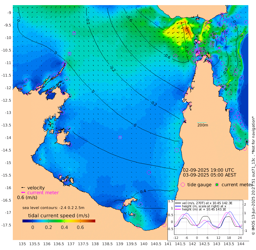14cm/s -10T +3cm/s rms + 7cm/s -42T. ARA-GOC87 57m 13cm/s -52T +3cm/s rms + 2cm/s -2T. ARA-GOC87 60m 17cm/s 5T +2cm/s rms + 3cm/s 61T. ARA-GOC87 47m -51cm Daru -50cm Bobo Island -8cm Meer Island Barge -18cm Bramble Cay -36cm Unnamed Cay -52cm Pearce Cay -36cm Stephens Island -33cm Merrie England Shoals -52cm Mutacomal Reef -23cm Darnley Island Barge -12cm East Cay -37cm Yorke Island Barge -51cm Rennel Island -52cm Aureed Island -62cm Dungeness Reef -67cm Zagai Island -72cm Yam Island -68cm Dauan Island -55cm Saibai Island -58cm Phipi Reef -68cm Warrior Reef - West -82cm Mabuiag Island Barge -52cm Half Way Island -69cm Coconut Island -61cm Dugong Islet -78cm Poll Island -69cm Kirkcaldie Reef -98cm Suarji Island -63cm Sue Islet -113cm Hawkesbury Island -99cm Alert Patches -100cm Twin Island -107cm Badu Island -103cm St Pauls (Moa Island) -112cm Kubin (Moa Island) -103cm Ince Point -108cm Thursday Island -106cm Nardana Patches -107cm Turtle Head -107cm Round Island -112cm Goods Island -119cm Booby Island -123cm White Rocks Area -108cm Carpentaria -88cm Papou Point -131cm Bampfield Head -93cm Crab Island -121cm Red Wallis Island -120cm Packe Island -76cm Harrington Reef -110cm Herald Camp -21cm Sharp Point -86cm Red Island Point -98cm Possession Island -84cm Alpha Rock -89cm Frederick Point -66cm Wyborn Reef Light -72cm Tetley Island -24cm Triangle Reef -74cm Turtle Head Island -18cm Maclennan Cay -2cm Raine Island -40cm Mcsweeny Reef -27cm Collette Reef -8cm Shadwell Reef -25cm Hannibal Island -26cm Round Point -87cm Vrilya Point -18cm Cape Grenville -15cm Hicks Island -13cm Sir Charles Hardy Island -5cm Harvey Island -6cm Kay Reef -3cm Rocky Island -4cm Chapman Island 0cm Ham Reef -2cm Jubilee Reef -9cm Night Island -5cm Unnamed Reef No. 3 -4cm Morris Island -5cm 1st 3 Mile Opening -5cm Creech Reef -10cm Fife Island 5cm Eden Reef 0cm Stanley Island -2cm Normanby River -8cm Yabooma Island -4cm Hutchison River 0cm Elcho Island 2cm North West Crocodile Island -10cm Cape Wessel -2cm Stevens Island 19cm Guluwuru Island 6cm Hopeful Bay -8cm Auster Point -5cm Two Island Bay 11cm Cadell Strait 85cm Mallison Island 9cm Melville Bay (Gove Harbour) 1cm Truant Island 7cm Cape Arnhem 25cm Cape Grey 28cm Hawk Island 40cm Milner Bay (Groote Eylandt) 44cm Cape Beatrice 50cm West Island 51cm Centre Island 87cm Mornington Island 85cm West Wellesley Islands 113cm Bountiful Island 148cm Albert River Mouth 151cm Sweers Island 139cm Karumba 55cm Nassau River Offshore 21cm Christmas Creek -14cm Archer River -40cm Boyd Point -38cm Weipa (Humbug Point) -50cm Pennefather River -76cm Cullen Point