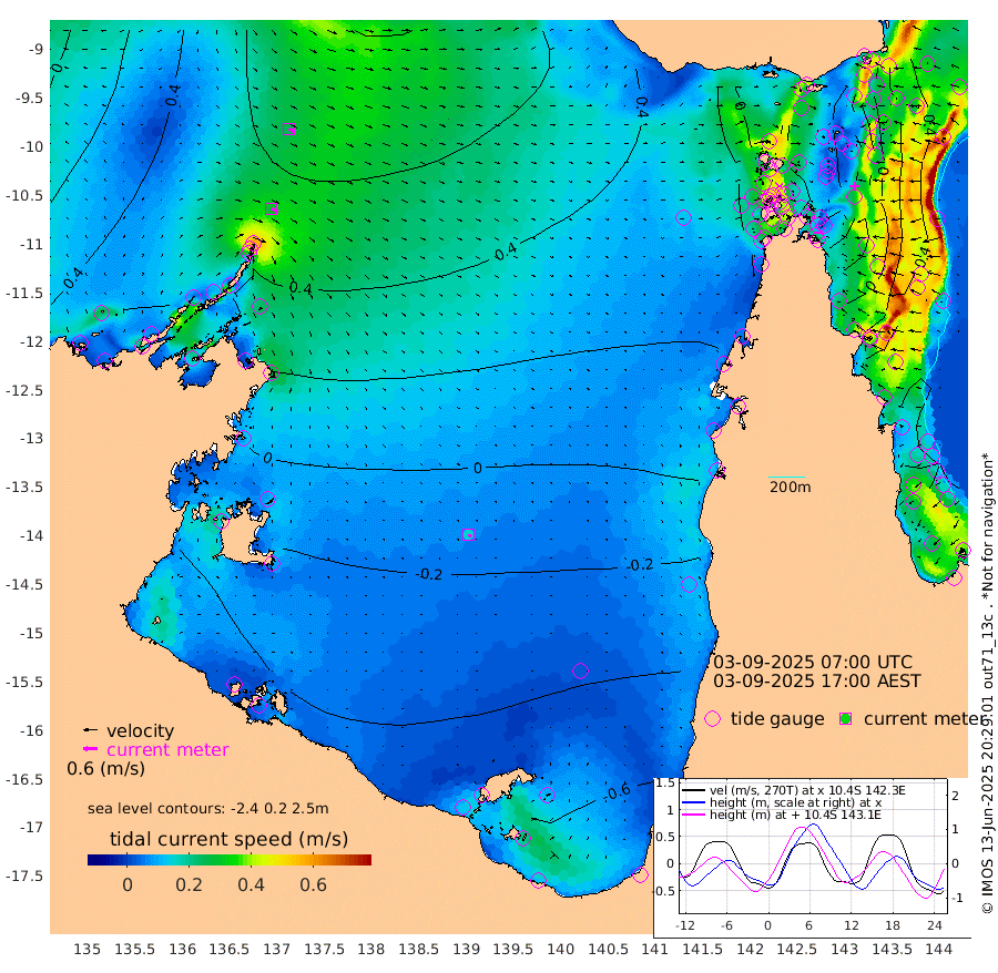 30cm/s 118T +3cm/s rms + 7cm/s -42T. ARA-GOC87 57m 15cm/s 145T +3cm/s rms + 2cm/s -2T. ARA-GOC87 60m 25cm/s 118T +2cm/s rms + 3cm/s 61T. ARA-GOC87 47m -20cm Daru -18cm Bobo Island 40cm Meer Island Barge 26cm Bramble Cay 8cm Unnamed Cay -8cm Pearce Cay 10cm Stephens Island 12cm Merrie England Shoals -16cm Mutacomal Reef 21cm Darnley Island Barge 31cm East Cay 2cm Yorke Island Barge -13cm Rennel Island -17cm Aureed Island -28cm Dungeness Reef -47cm Zagai Island -48cm Yam Island -49cm Dauan Island -46cm Saibai Island -62cm Phipi Reef -56cm Warrior Reef - West -37cm Mabuiag Island Barge -6cm Half Way Island -30cm Coconut Island -17cm Dugong Islet -41cm Poll Island -35cm Kirkcaldie Reef -67cm Suarji Island -33cm Sue Islet 18cm Hawkesbury Island -44cm Alert Patches -46cm Twin Island 3cm Badu Island -52cm St Pauls (Moa Island) 0cm Kubin (Moa Island) -33cm Ince Point -23cm Thursday Island -26cm Nardana Patches -8cm Turtle Head 4cm Round Island 22cm Goods Island 40cm Booby Island 23cm White Rocks Area 53cm Carpentaria -43cm Papou Point 46cm Bampfield Head 30cm Crab Island 27cm Red Wallis Island 7cm Packe Island -33cm Harrington Reef 23cm Herald Camp -24cm Sharp Point -20cm Red Island Point -29cm Possession Island -36cm Alpha Rock -40cm Frederick Point -18cm Wyborn Reef Light -24cm Tetley Island 23cm Triangle Reef -7cm Turtle Head Island 30cm Maclennan Cay 45cm Raine Island 4cm Mcsweeny Reef 13cm Collette Reef 35cm Shadwell Reef 19cm Hannibal Island 24cm Round Point 42cm Vrilya Point 29cm Cape Grenville 30cm Hicks Island 39cm Sir Charles Hardy Island 8cm Harvey Island 42cm Kay Reef 41cm Rocky Island 44cm Chapman Island 46cm Ham Reef 46cm Jubilee Reef 37cm Night Island 43cm Unnamed Reef No. 3 45cm Morris Island 52cm 1st 3 Mile Opening 46cm Creech Reef 35cm Fife Island 62cm Eden Reef 52cm Stanley Island 46cm Normanby River 56cm Yabooma Island 63cm Hutchison River 54cm Elcho Island 40cm North West Crocodile Island 56cm Cape Wessel 60cm Stevens Island 76cm Guluwuru Island 56cm Hopeful Bay 56cm Auster Point 65cm Two Island Bay 74cm Cadell Strait 175cm Mallison Island 56cm Melville Bay (Gove Harbour) 65cm Truant Island 39cm Cape Arnhem 6cm Cape Grey -11cm Hawk Island -37cm Milner Bay (Groote Eylandt) -48cm Cape Beatrice -79cm West Island -79cm Centre Island -98cm Mornington Island -96cm West Wellesley Islands -115cm Bountiful Island -135cm Albert River Mouth -143cm Sweers Island -142cm Karumba -68cm Nassau River Offshore -30cm Christmas Creek 9cm Archer River 23cm Boyd Point 24cm Weipa (Humbug Point) 31cm Pennefather River 35cm Cullen Point