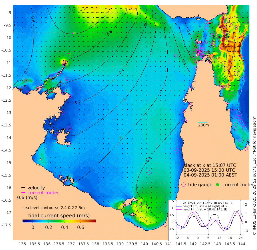 35cm/s -87T +3cm/s rms + 7cm/s -42T. ARA-GOC87 57m 19cm/s -154T +3cm/s rms + 2cm/s -2T. ARA-GOC87 60m 36cm/s -90T +2cm/s rms + 3cm/s 61T. ARA-GOC87 47m 1cm Daru -9cm Bobo Island -40cm Meer Island Barge -47cm Bramble Cay -34cm Unnamed Cay -14cm Pearce Cay -31cm Stephens Island -49cm Merrie England Shoals -18cm Mutacomal Reef -33cm Darnley Island Barge -41cm East Cay -16cm Yorke Island Barge -9cm Rennel Island -1cm Aureed Island 25cm Dungeness Reef 62cm Zagai Island 63cm Yam Island 130cm Dauan Island 108cm Saibai Island 129cm Phipi Reef 85cm Warrior Reef - West 93cm Mabuiag Island Barge -15cm Half Way Island 12cm Coconut Island 2cm Dugong Islet 39cm Poll Island 31cm Kirkcaldie Reef 82cm Suarji Island 35cm Sue Islet 85cm Hawkesbury Island 69cm Alert Patches 63cm Twin Island 92cm Badu Island 81cm St Pauls (Moa Island) 85cm Kubin (Moa Island) 78cm Ince Point 79cm Thursday Island 81cm Nardana Patches 87cm Turtle Head 84cm Round Island 81cm Goods Island 75cm Booby Island 69cm White Rocks Area 39cm Carpentaria 63cm Papou Point 72cm Bampfield Head 62cm Crab Island 74cm Red Wallis Island 82cm Packe Island 3cm Harrington Reef 97cm Herald Camp 27cm Sharp Point 74cm Red Island Point 74cm Possession Island 39cm Alpha Rock 38cm Frederick Point -9cm Wyborn Reef Light 3cm Tetley Island -19cm Triangle Reef -12cm Turtle Head Island -28cm Maclennan Cay -37cm Raine Island -25cm Mcsweeny Reef -32cm Collette Reef -36cm Shadwell Reef -44cm Hannibal Island -47cm Round Point 42cm Vrilya Point -46cm Cape Grenville -37cm Hicks Island -34cm Sir Charles Hardy Island -11cm Harvey Island -57cm Kay Reef -39cm Rocky Island -41cm Chapman Island -40cm Ham Reef -42cm Jubilee Reef -34cm Night Island -42cm Unnamed Reef No. 3 -45cm Morris Island -38cm 1st 3 Mile Opening -40cm Creech Reef -39cm Fife Island -59cm Eden Reef -54cm Stanley Island -60cm Normanby River -71cm Yabooma Island -74cm Hutchison River -70cm Elcho Island -60cm North West Crocodile Island -82cm Cape Wessel -94cm Stevens Island -84cm Guluwuru Island -81cm Hopeful Bay -77cm Auster Point -77cm Two Island Bay -86cm Cadell Strait -206cm Mallison Island -67cm Melville Bay (Gove Harbour) -74cm Truant Island -45cm Cape Arnhem -30cm Cape Grey -14cm Hawk Island -17cm Milner Bay (Groote Eylandt) -1cm Cape Beatrice 13cm West Island 13cm Centre Island 54cm Mornington Island 45cm West Wellesley Islands 69cm Bountiful Island 65cm Albert River Mouth 57cm Sweers Island 84cm Karumba 64cm Nassau River Offshore 64cm Christmas Creek 48cm Archer River 50cm Boyd Point 58cm Weipa (Humbug Point) 29cm Pennefather River 55cm Cullen Point